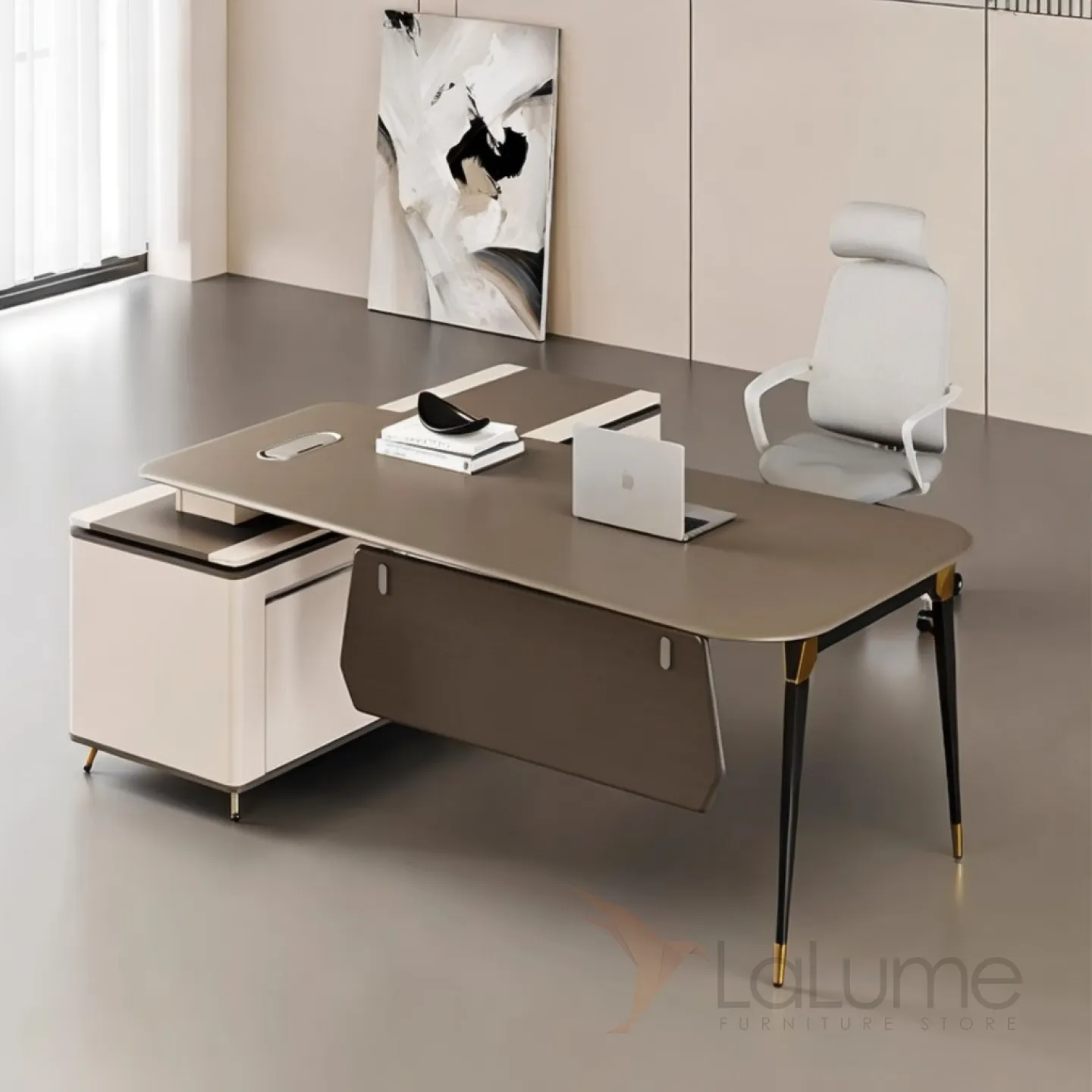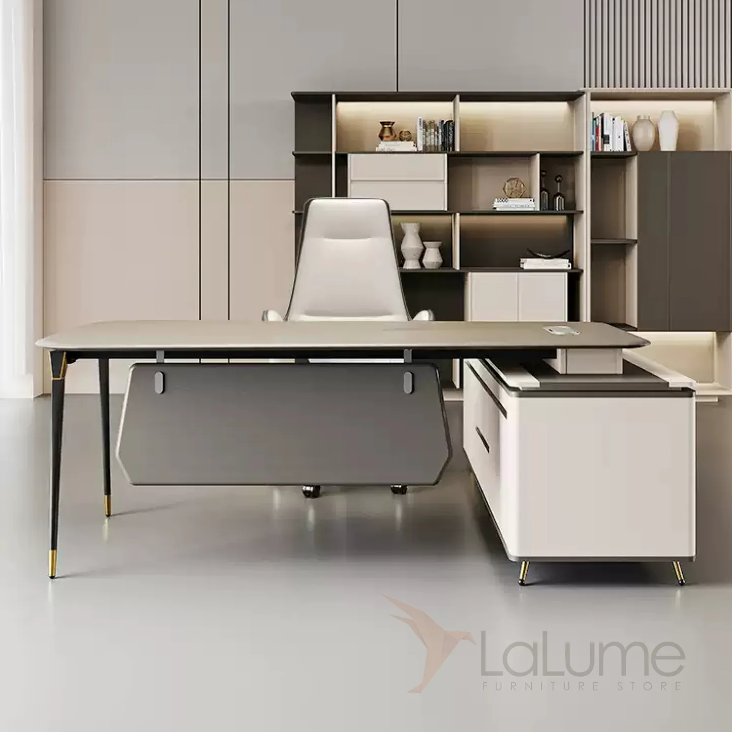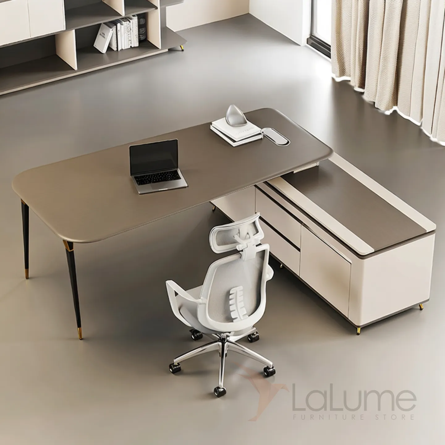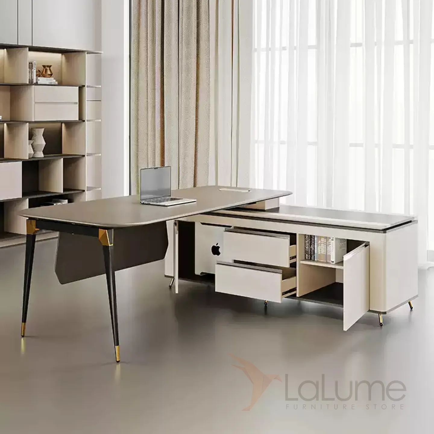 Роскошный офисный стол из ДСП с отделением для проводов, дополнительными полками, ящиками для хранения вещей. В комплекте можно приобрести кресло на колесиках.