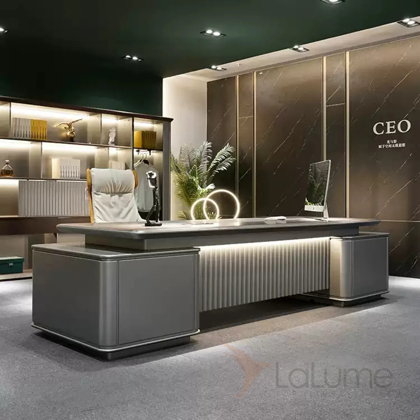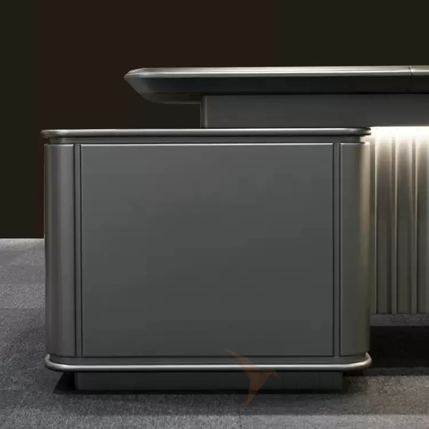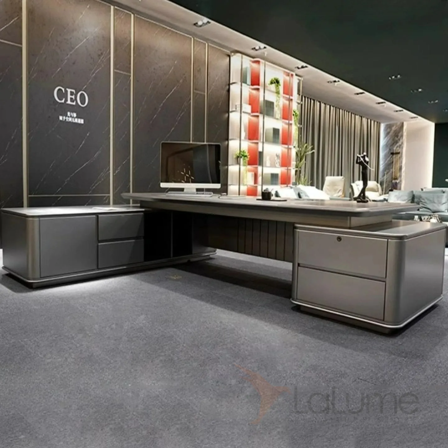 Роскошный офисный стол из МДФ с отделением для проводов, дополнительными полками, ящиками для хранения вещей. В комплекте можно приобрести кресло на колесиках, шкаф, мягкую мебель, стол для конференций, журнальный столик, комод.