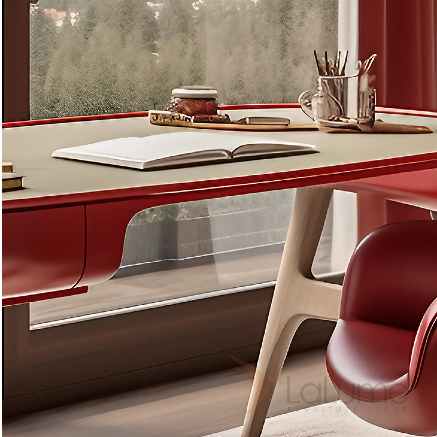Этот стильный и яркий письменный стол с плавными линиями, выполненный из массива дерева в насыщенном красном цвете, станет настоящим украшением вашего рабочего пространства. Продуманные боковые ящики помогут разместить все необходимые инструменты и письменные принадлежности, сделав работу более удобной.