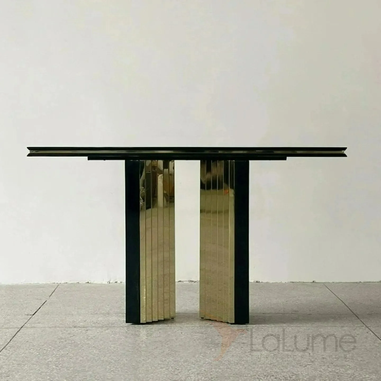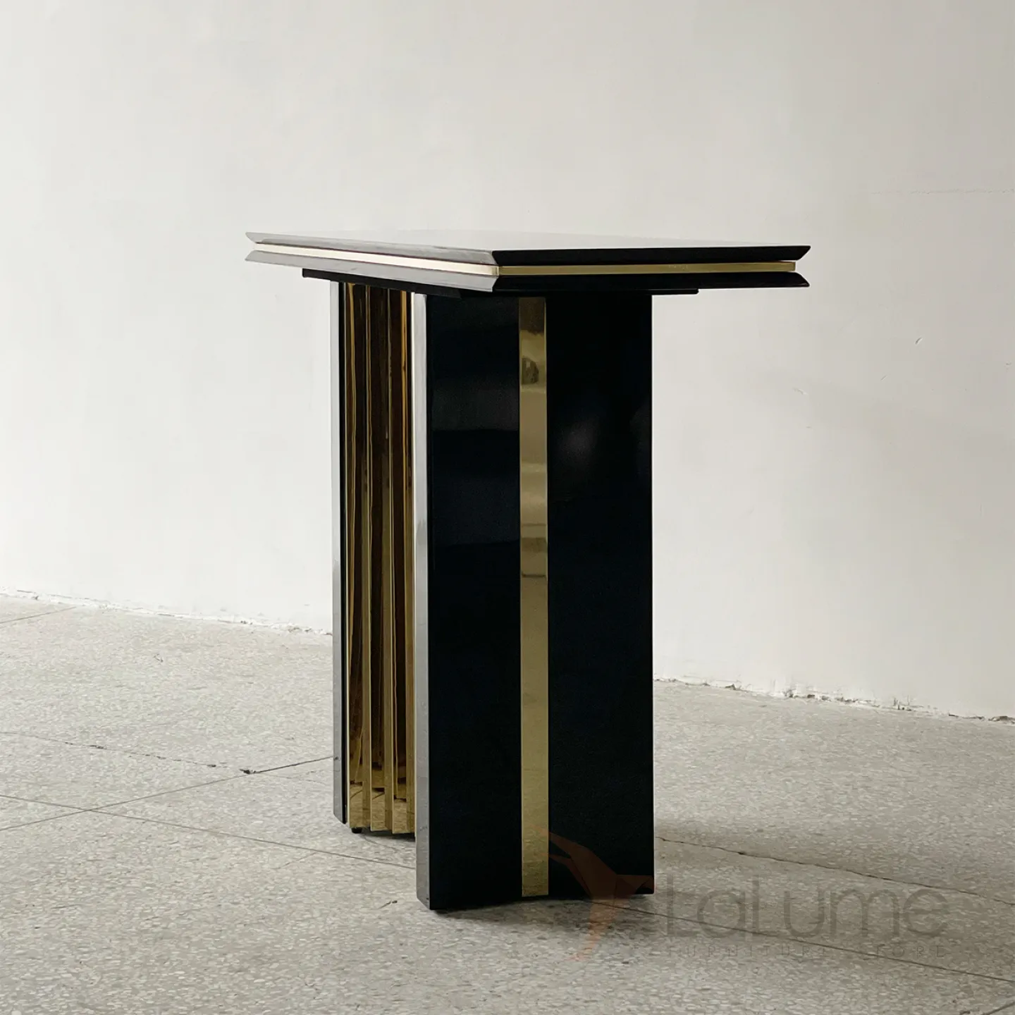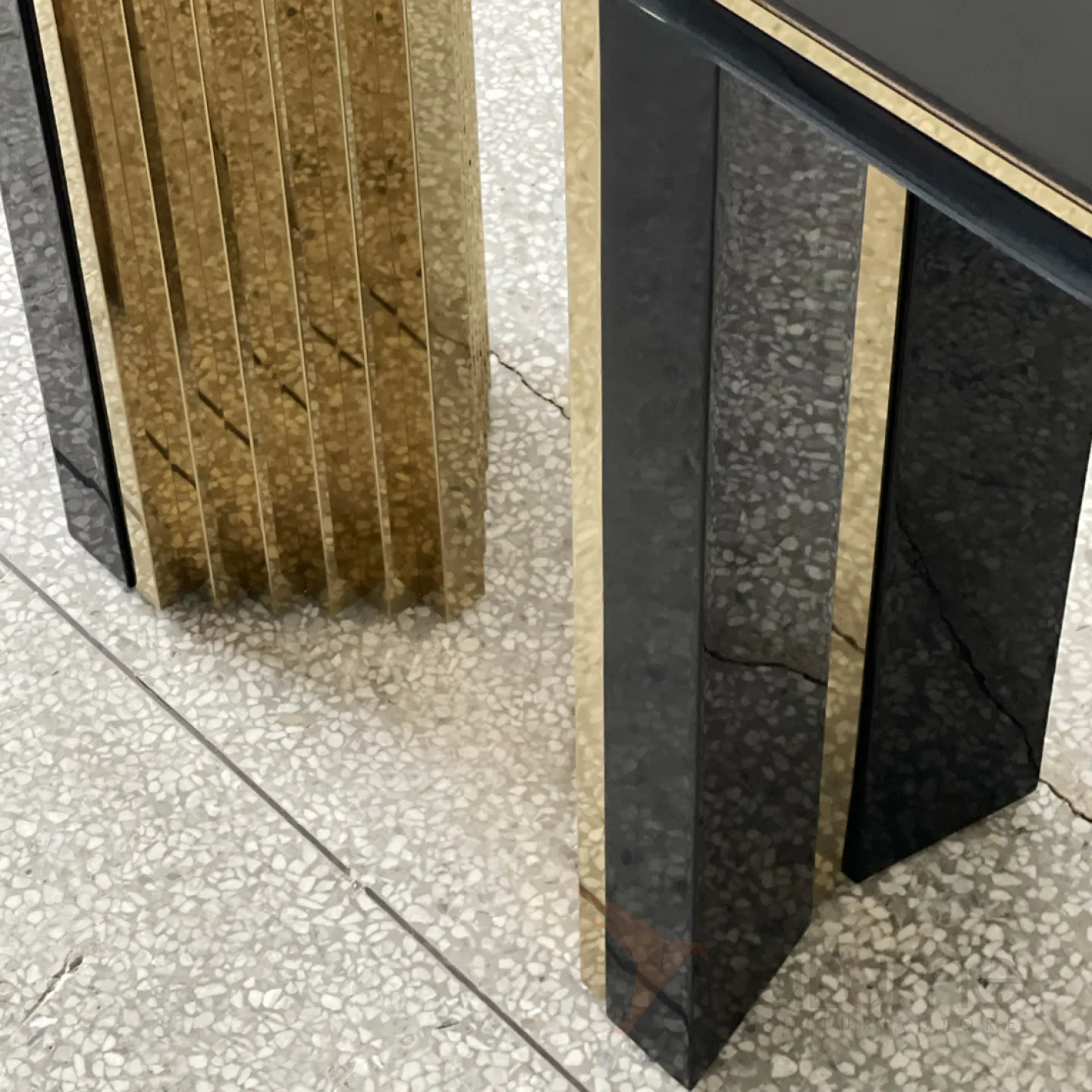 Столик с ножкой из нержавеющей стали, покрытой золотом, и деревянной столешницей из натурального мрамора станет прекрасным дополнением к классическому интерьеру, придав ему нотку элегантности.