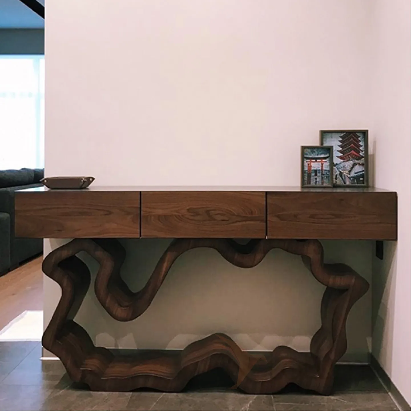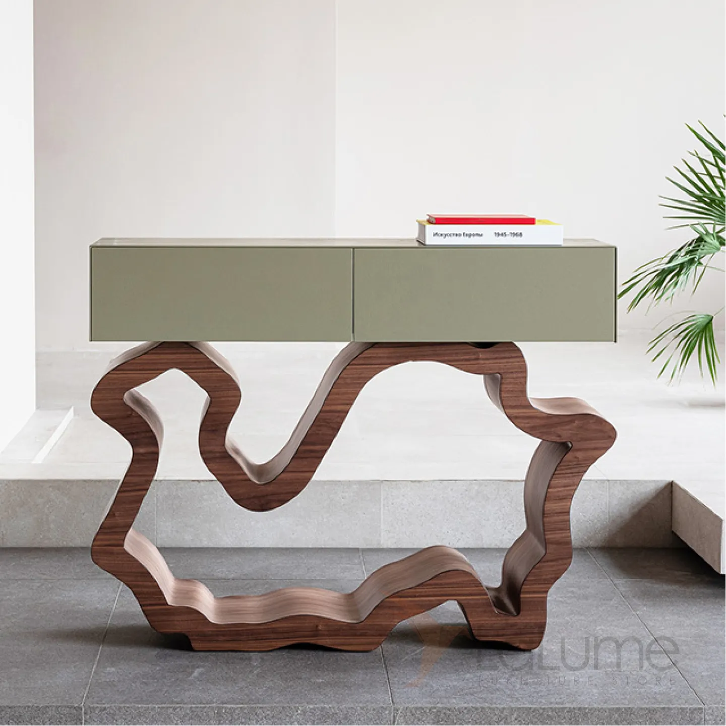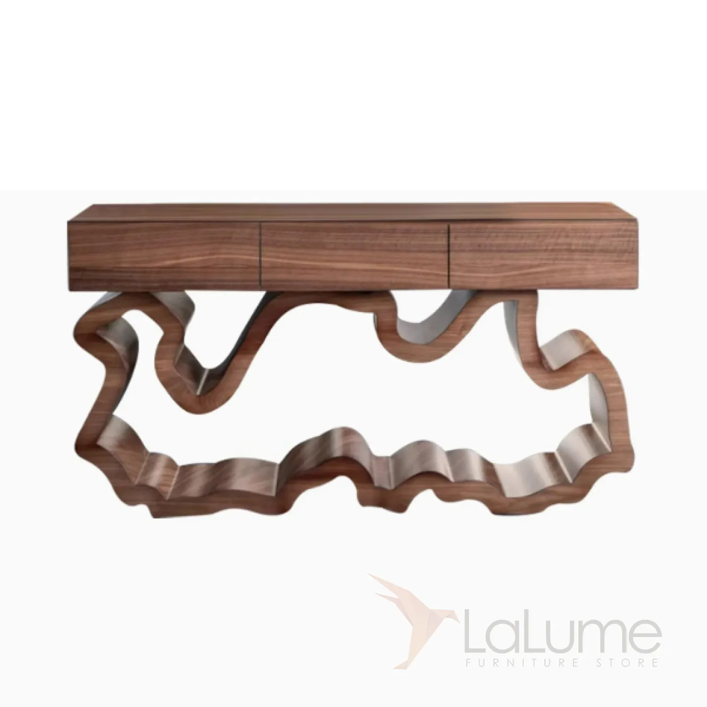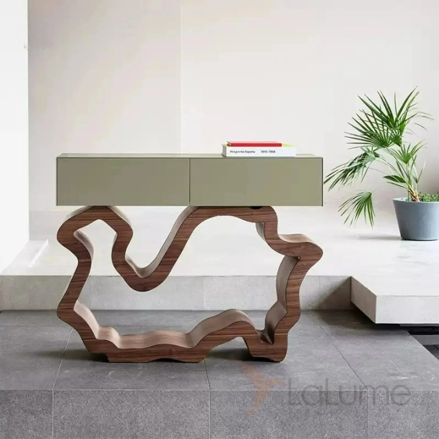 Стильный столик, который можно разместить у стены. Его ножки выполнены из прочного и долговечного материала — нержавеющей стали. Столик оснащён удобными выдвижными ящиками, фасады которых декорированы мрамором, что придаёт изделию изысканный вид.