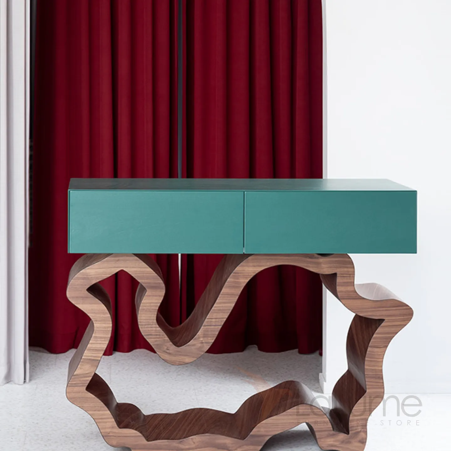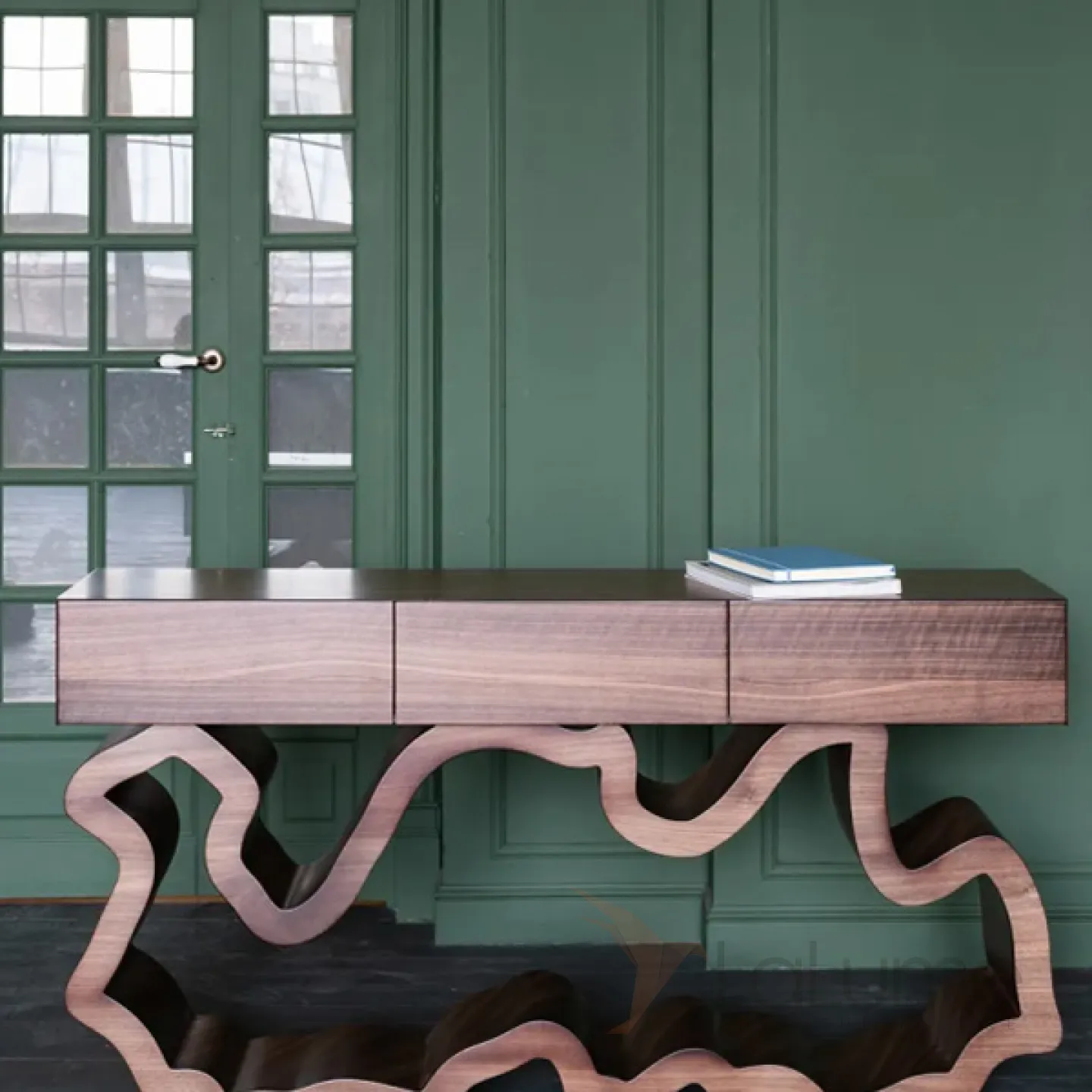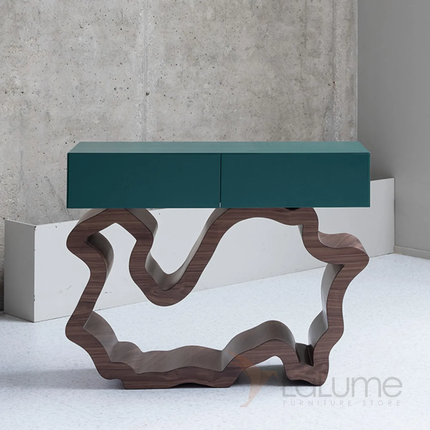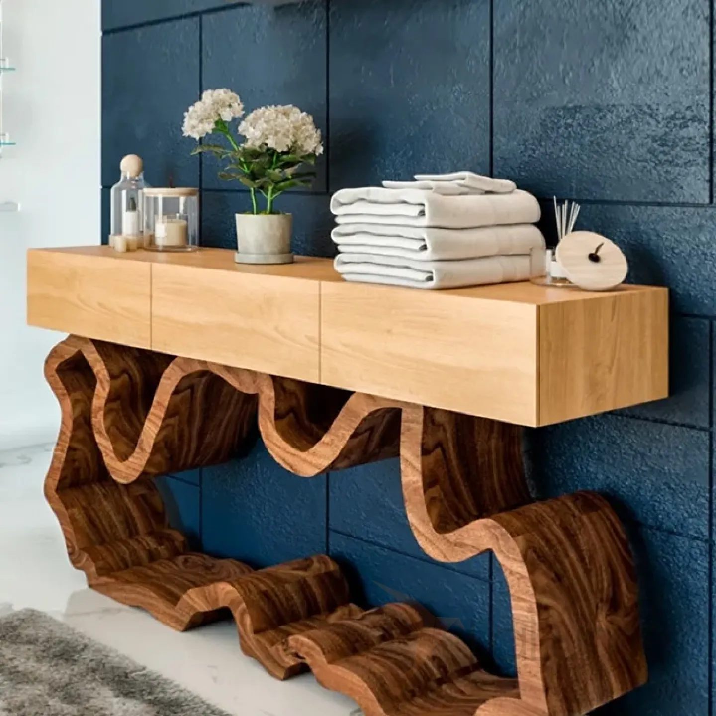 Стильный столик, который можно разместить у стены. Его ножки выполнены из прочного и долговечного материала — нержавеющей стали. Столик оснащён удобными выдвижными ящиками, фасады которых декорированы мрамором, что придаёт изделию изысканный вид.