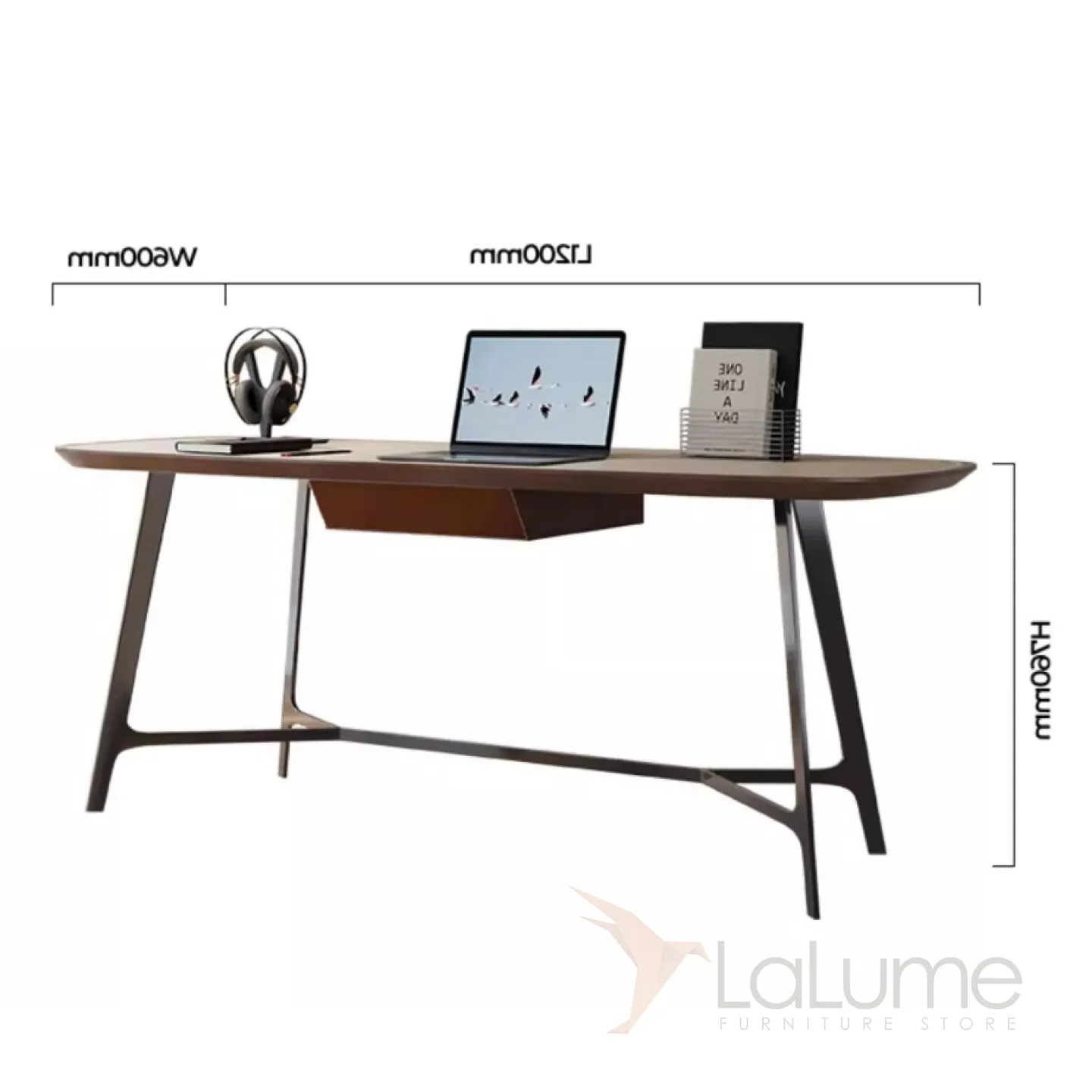 Элегантный письменный стол с закругленными углами и ножками из нержавеющей стали. Просторная столешница из дерева и кожи оснащена вместительным выдвижным ящиком.