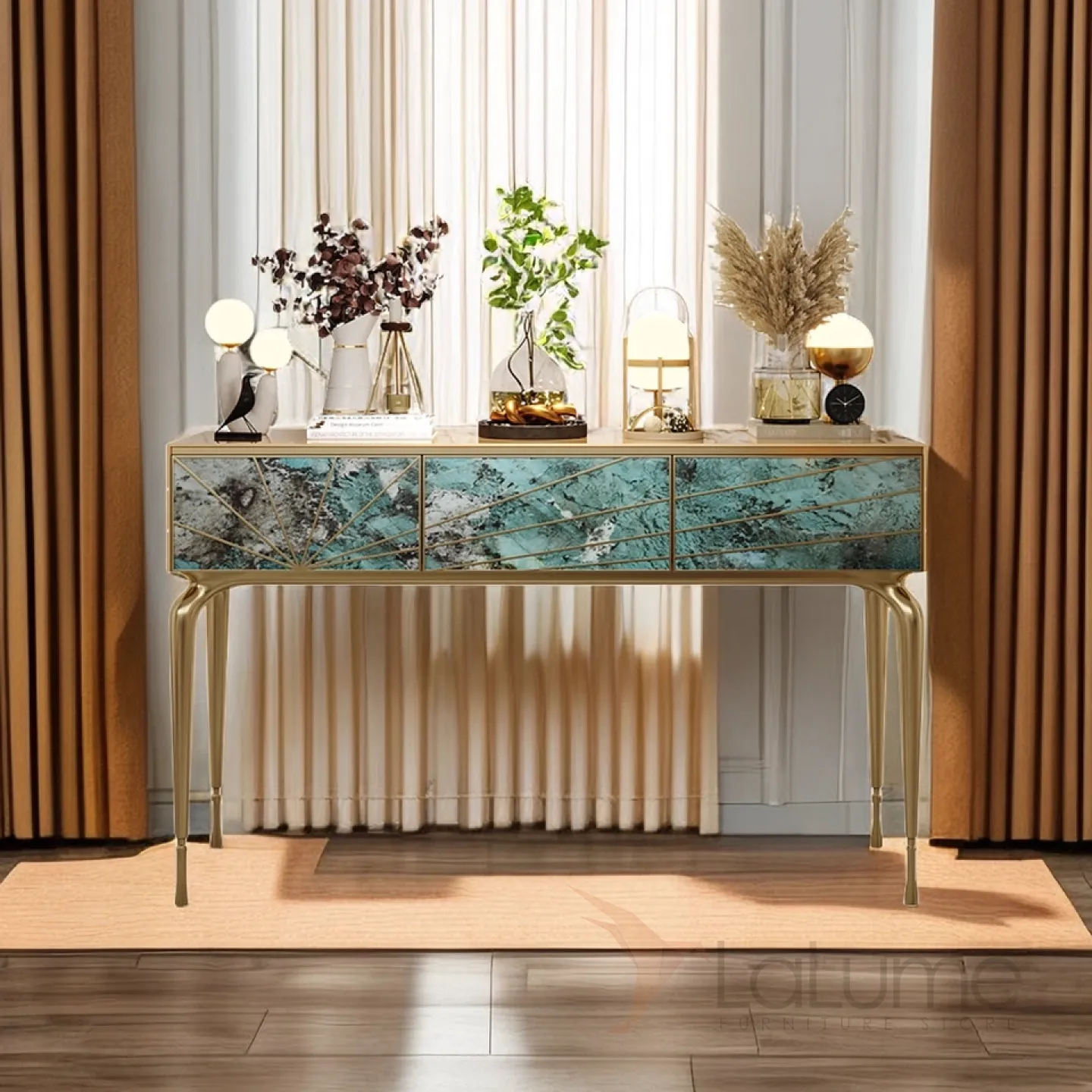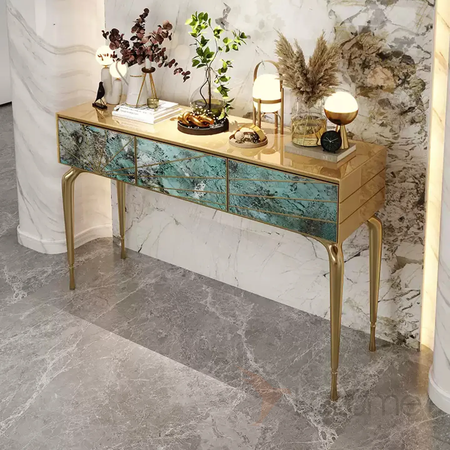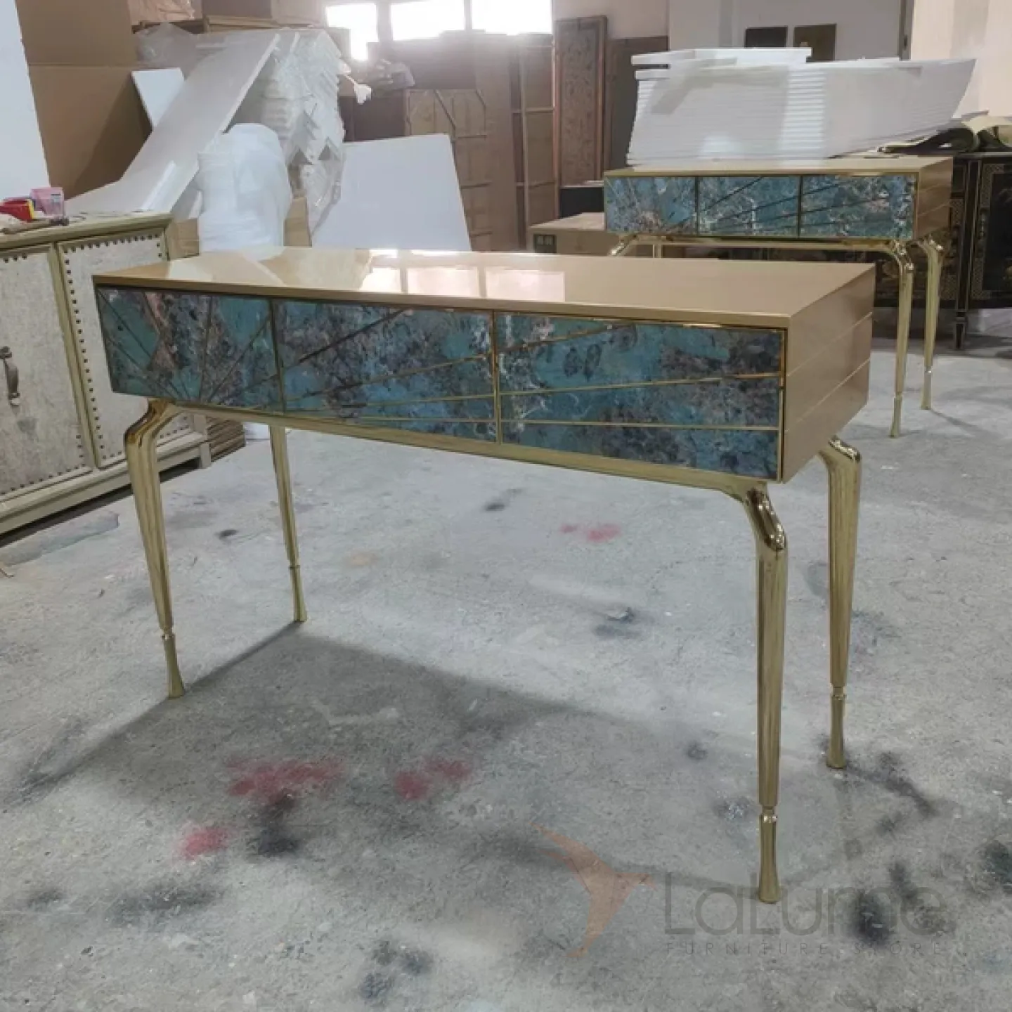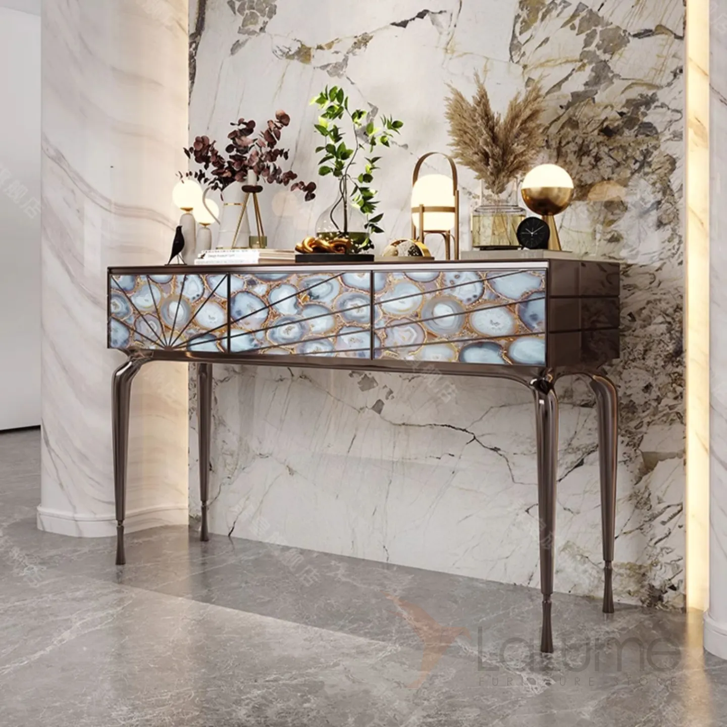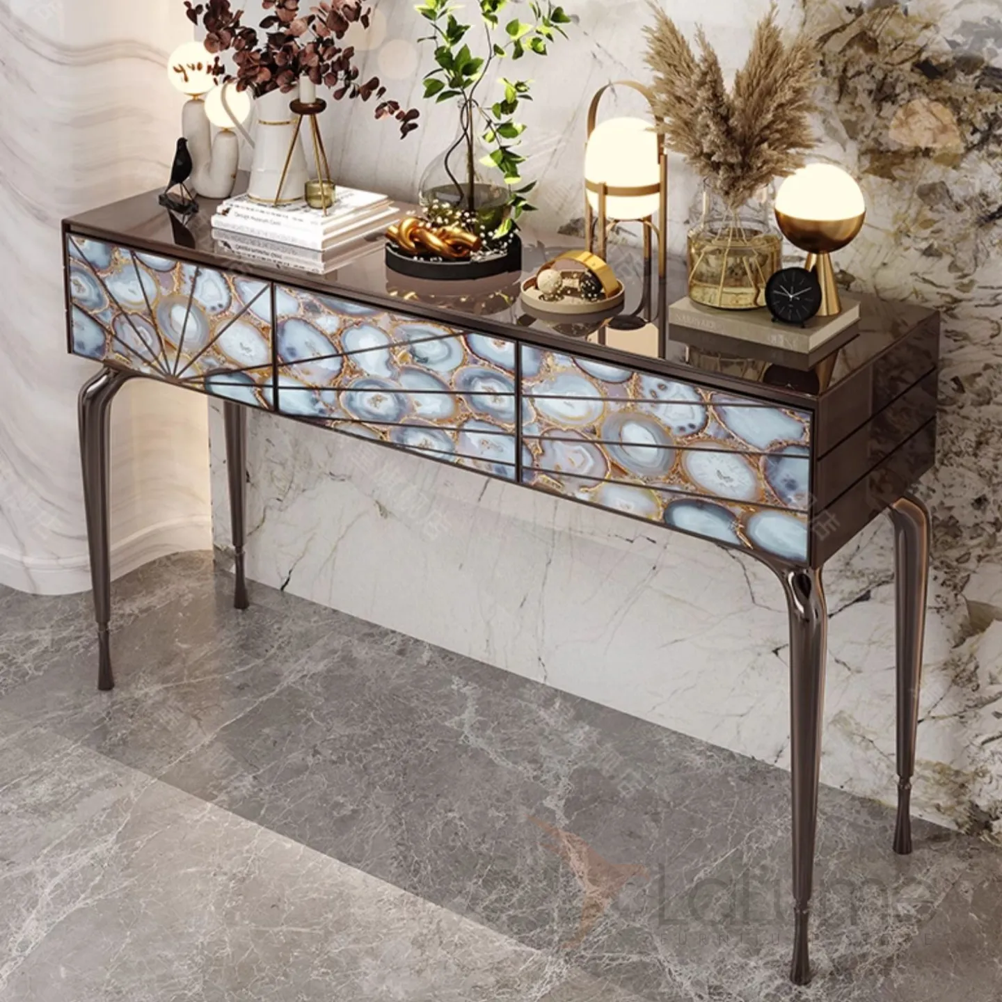 Элегантный столик для размещения у стены. Ножки из нержавеющей стали, прочной и долговечной. Внутри удобные выдвижные ящики с фасадами из агата разной текстуры, что придаёт изделию утончённый вид.