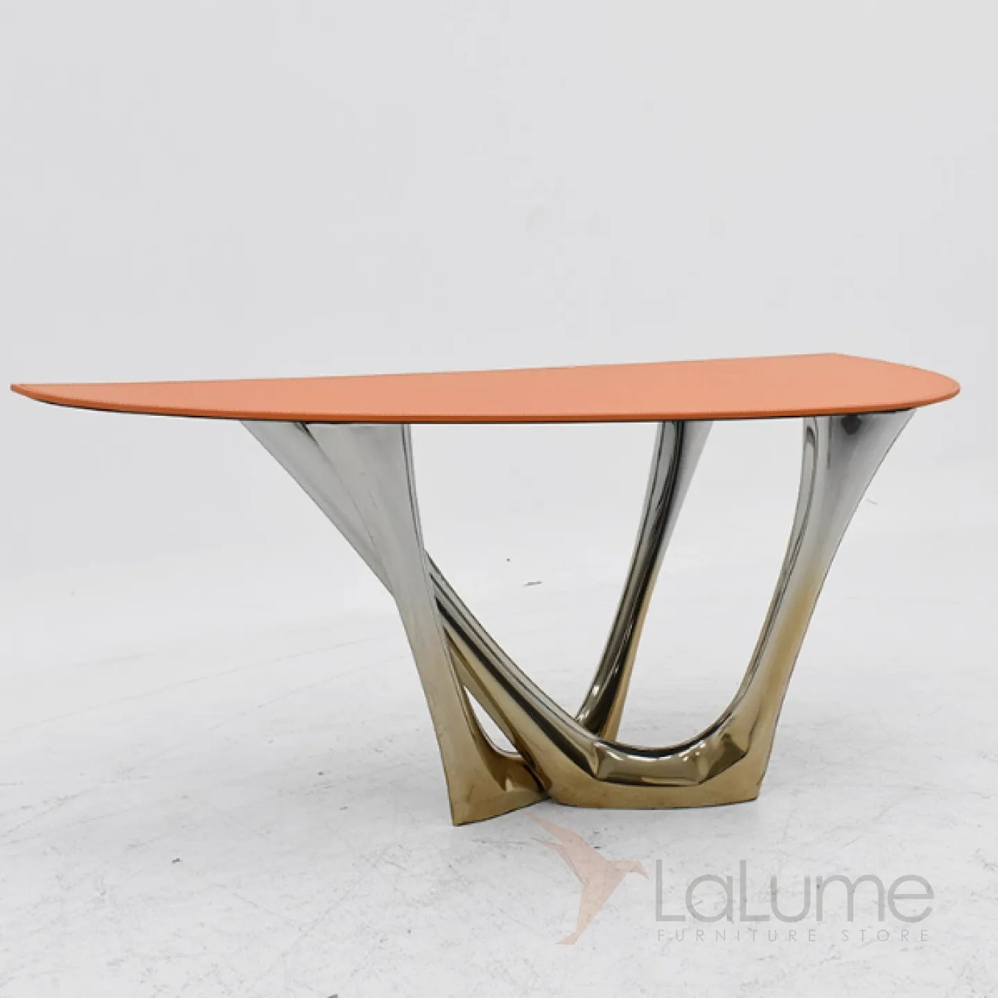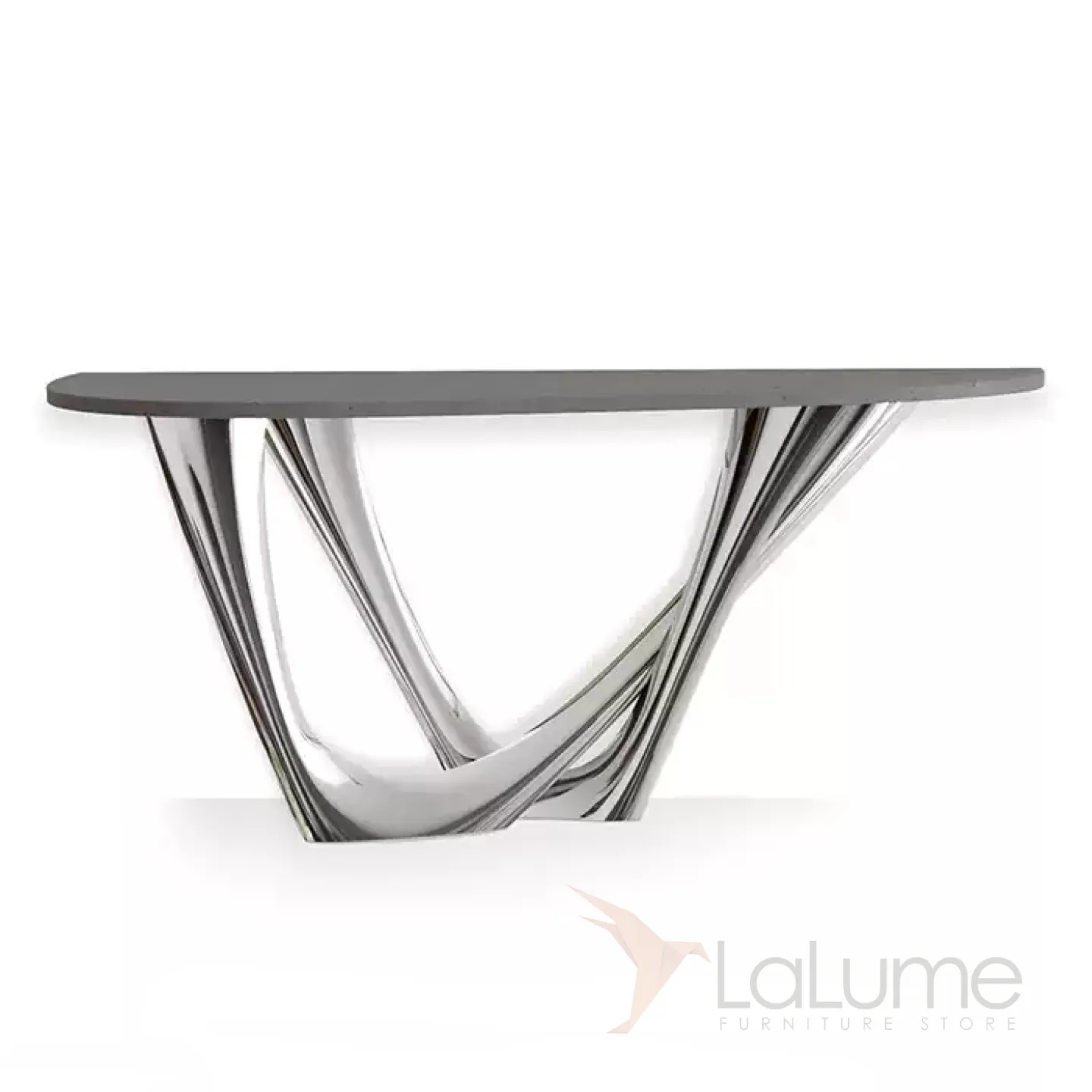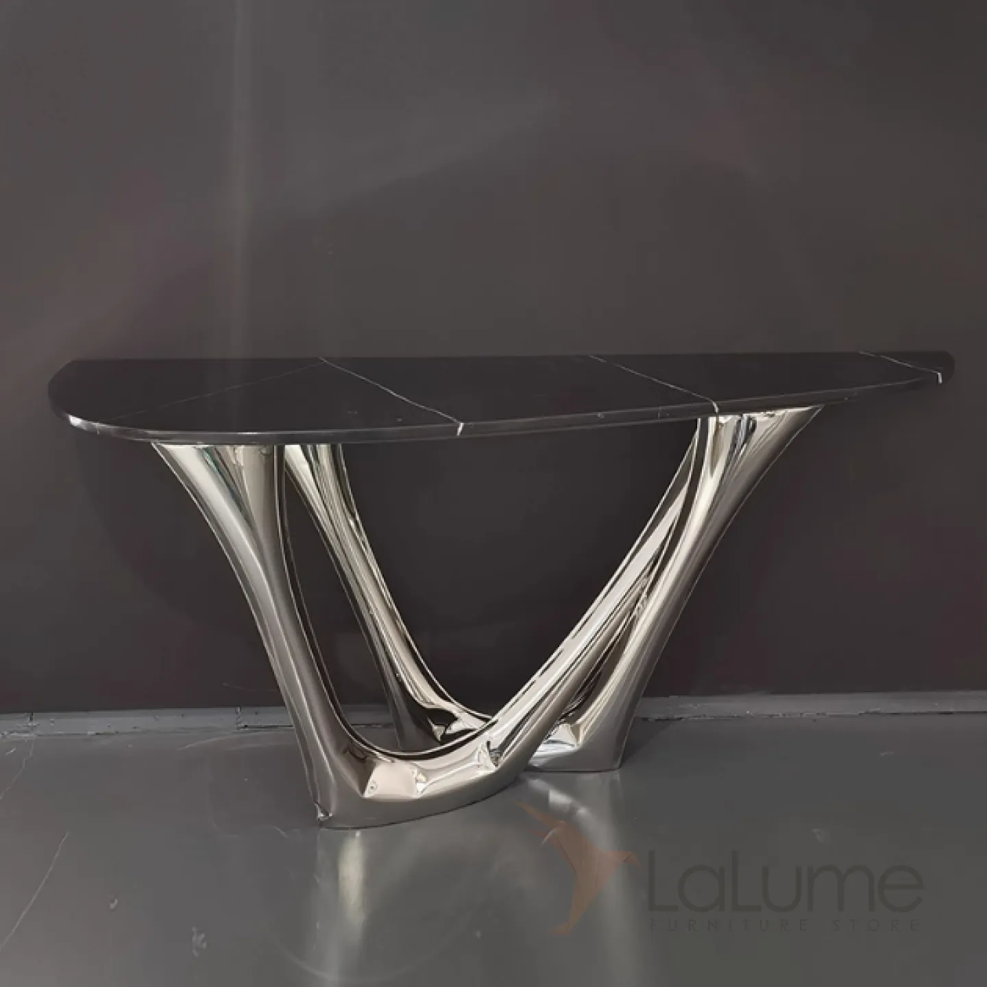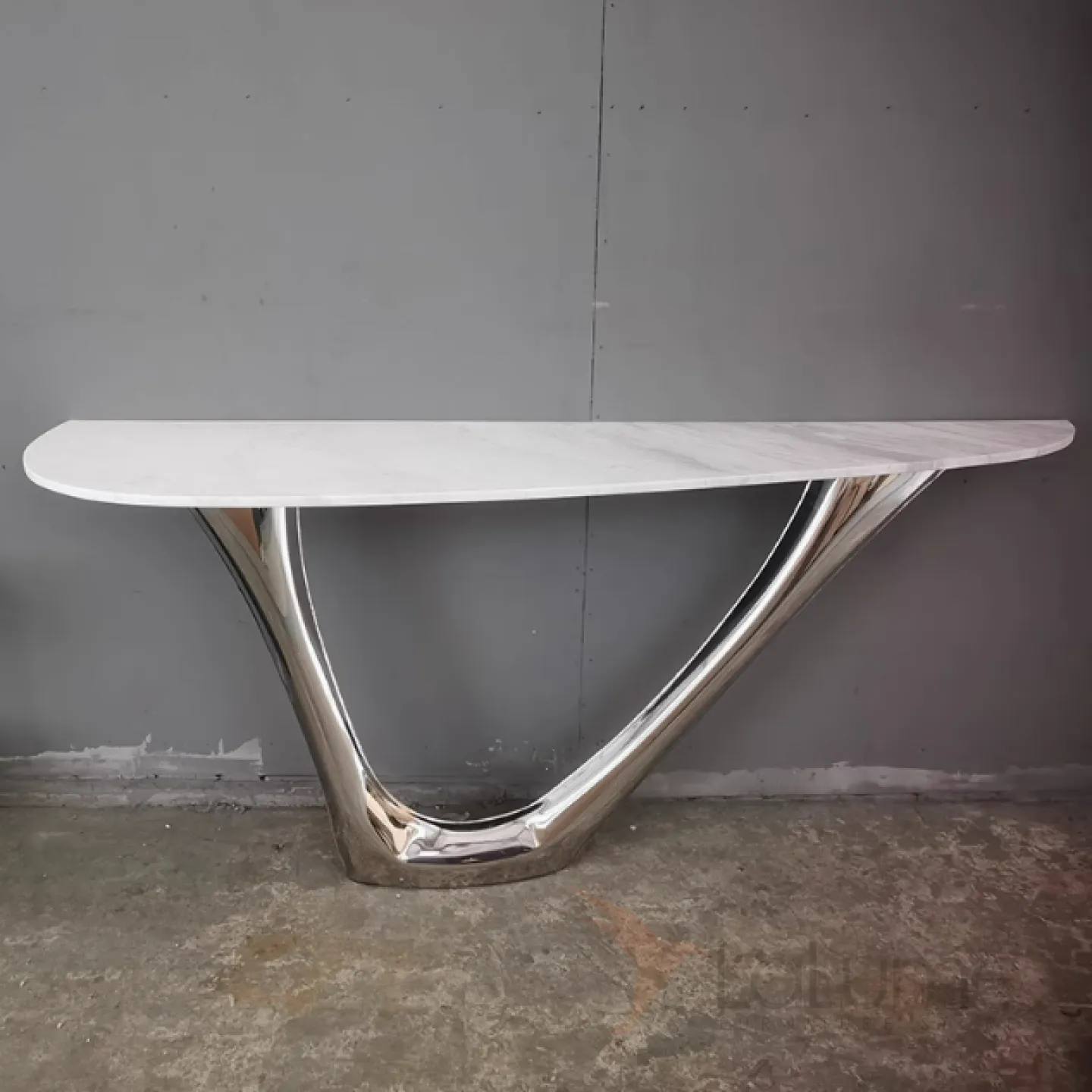 Изящный изогнутый столик с подстольем из нержавеющей стали, столешница из мрамора, кожи в зависимости от модели. Он гармонично впишется в интерьер гостиной, коридора или спальни.