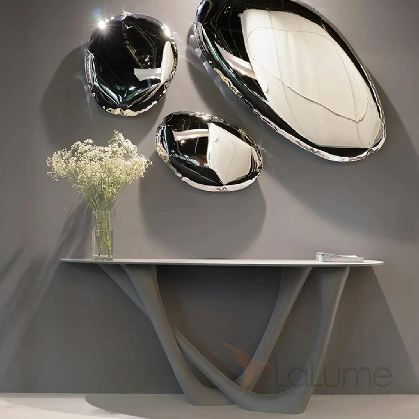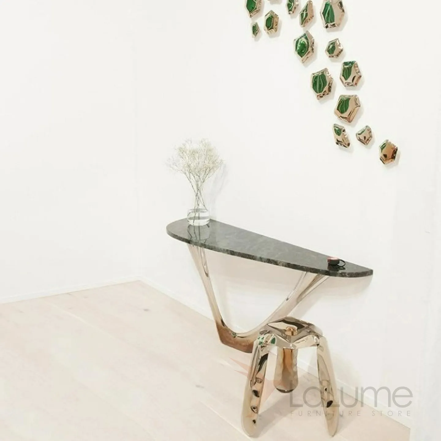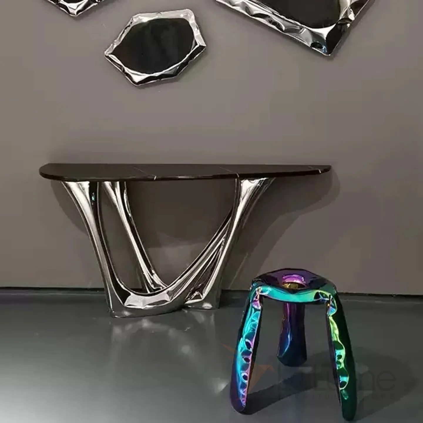 Изящный изогнутый столик с подстольем из нержавеющей стали, столешница из мрамора, кожи в зависимости от модели. Он гармонично впишется в интерьер гостиной, коридора или спальни.