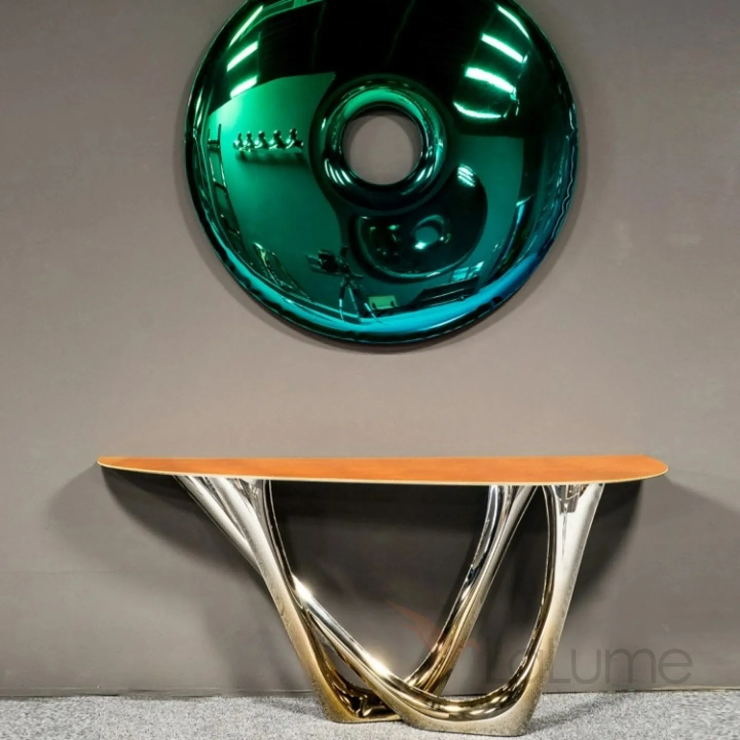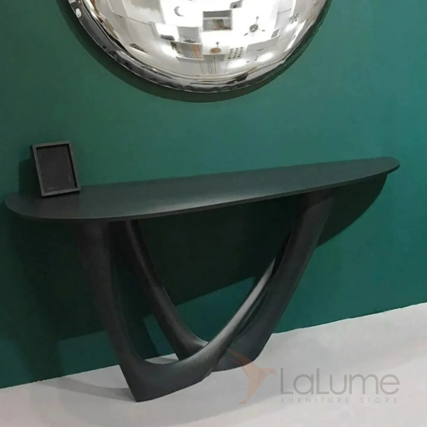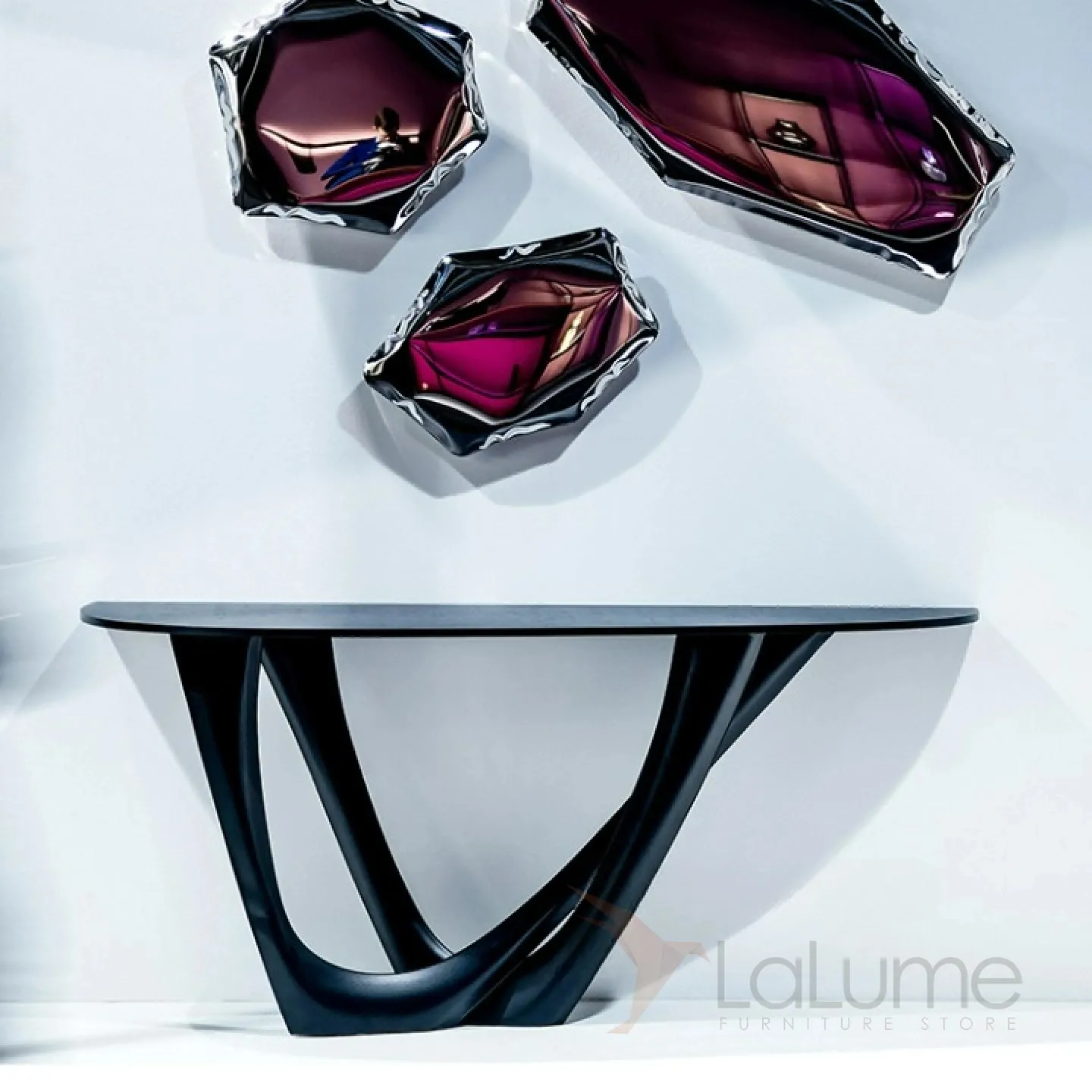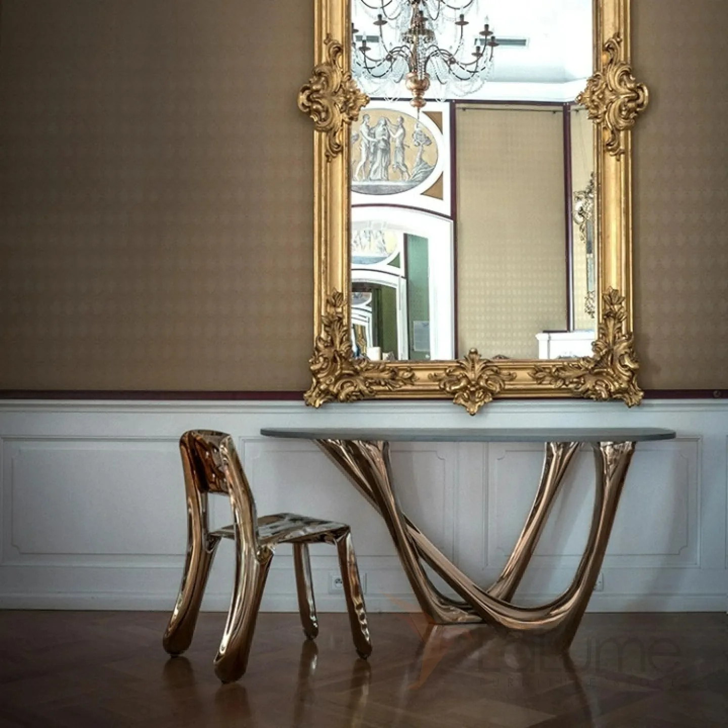 Изящный изогнутый столик с подстольем из нержавеющей стали, столешница из мрамора, кожи в зависимости от модели. Он гармонично впишется в интерьер гостиной, коридора или спальни.