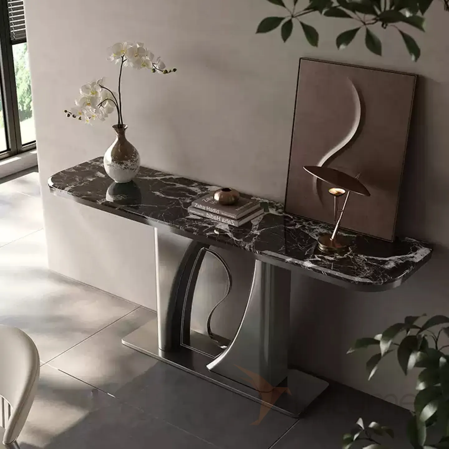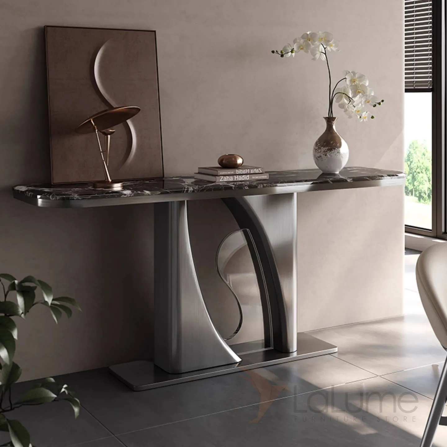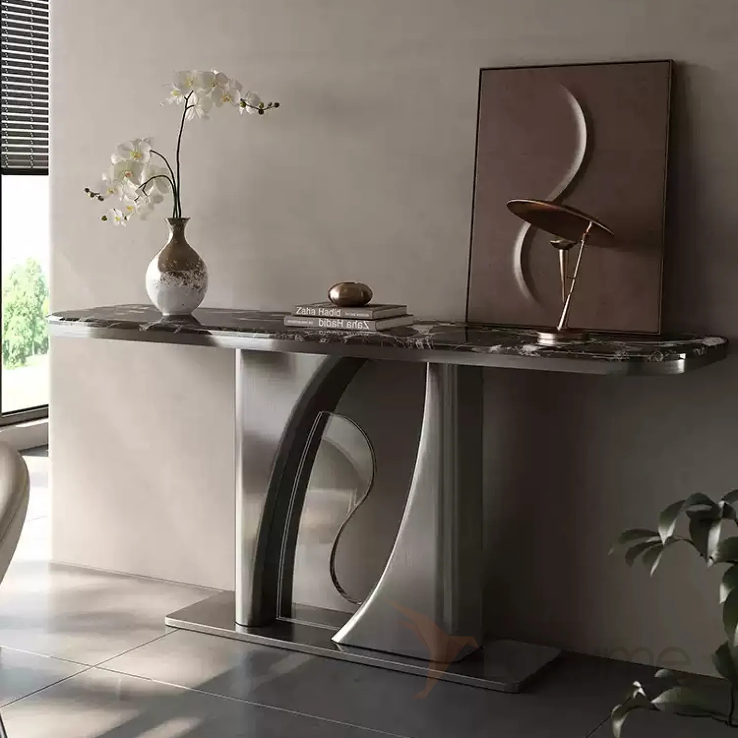 Элегантный пристенный столик с выразительным дизайнерским силуэтом с основанием из нержавеющей стали. Столешница из разных видов мрамора, либо древесины.