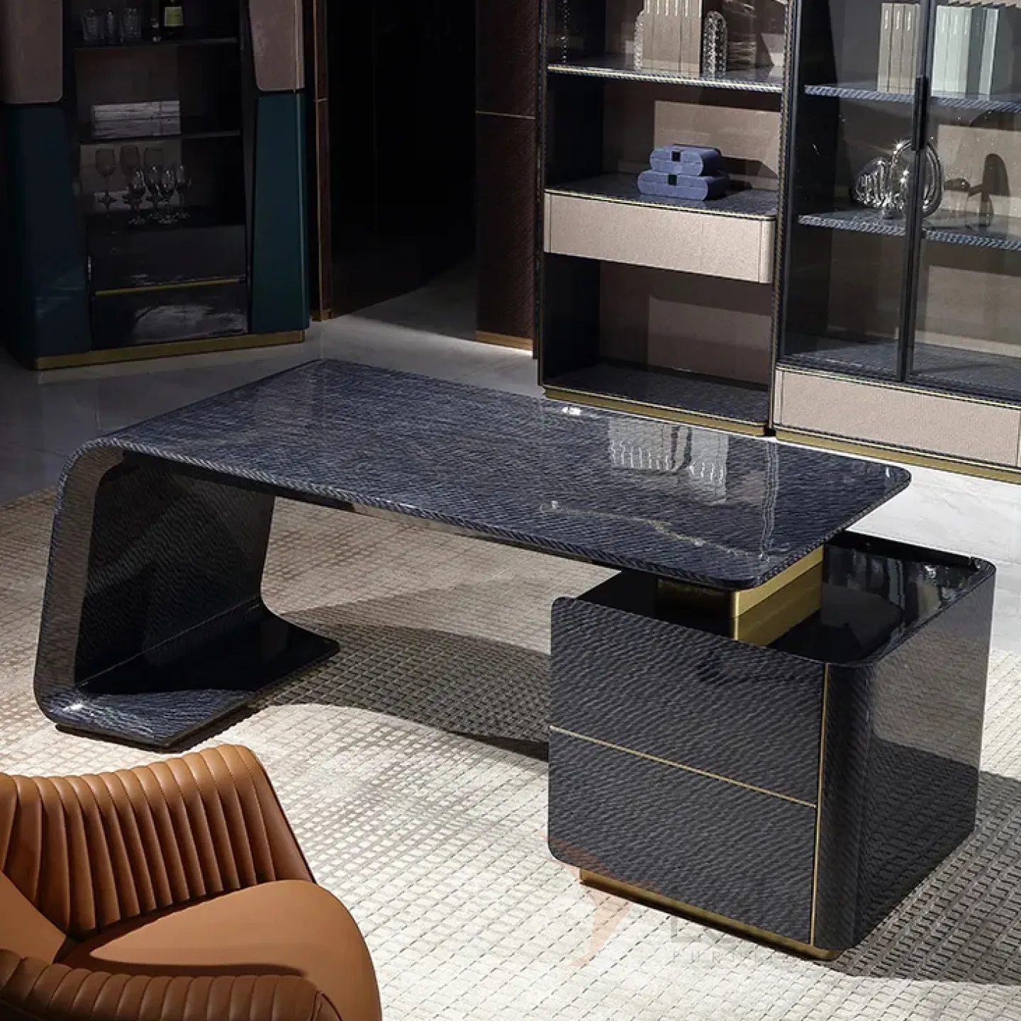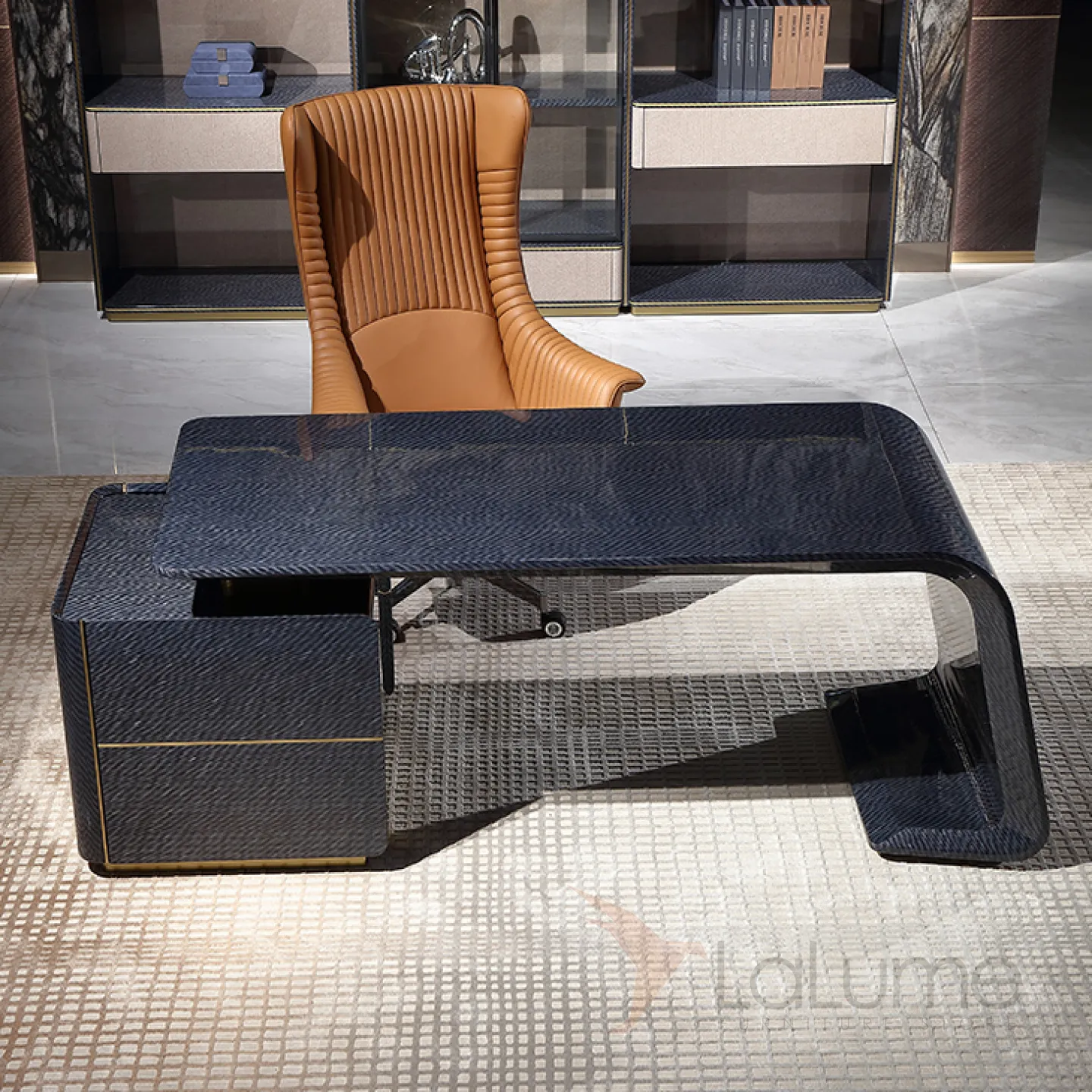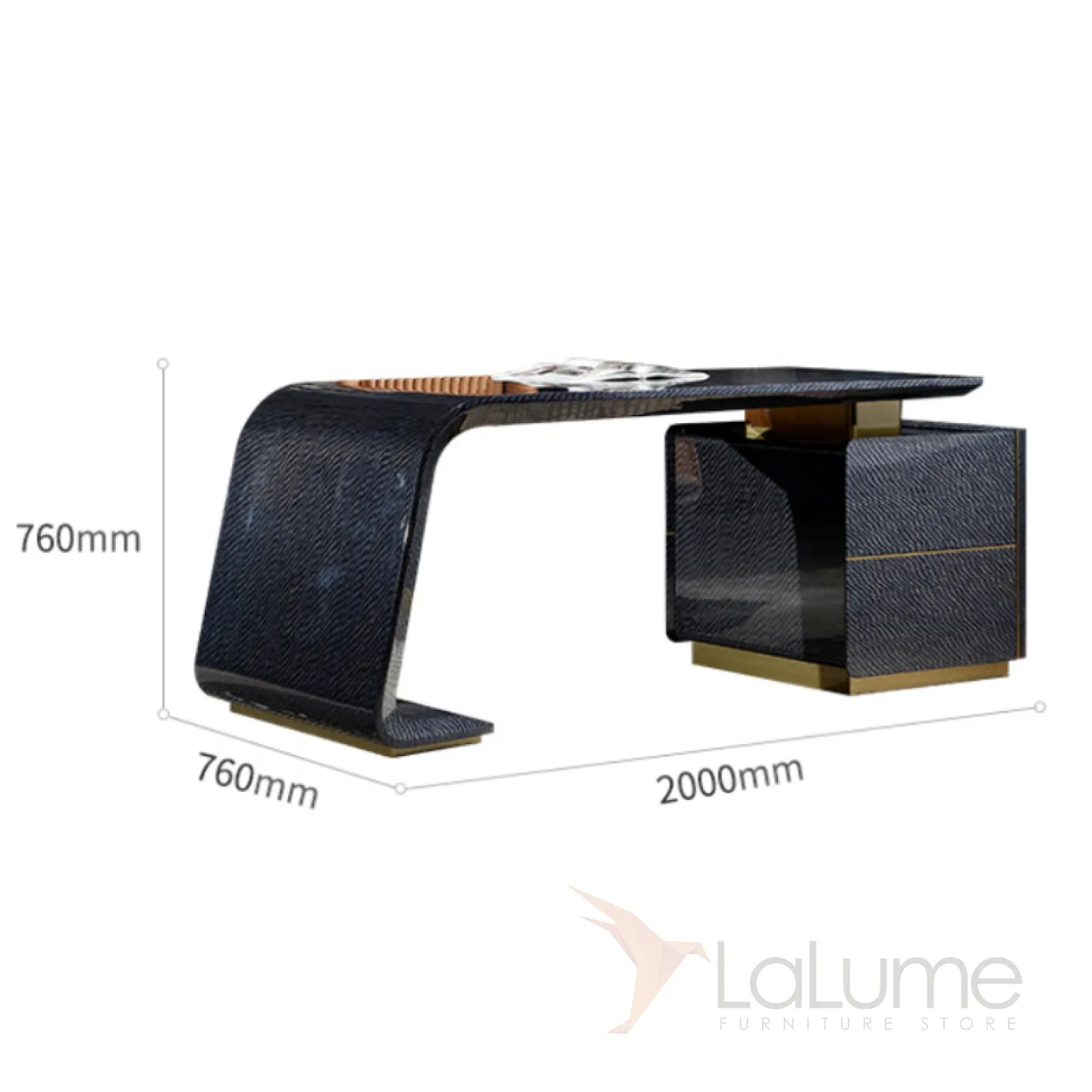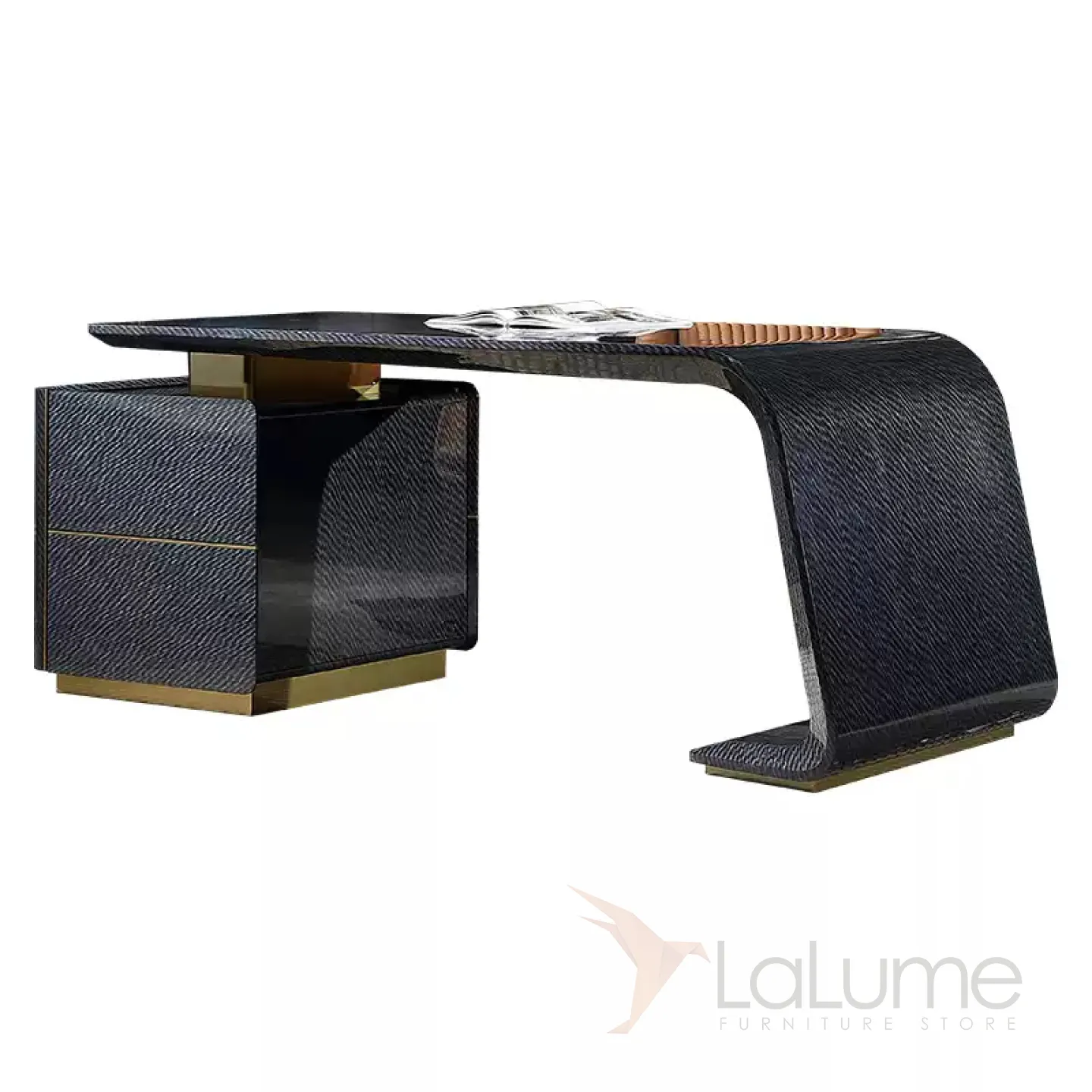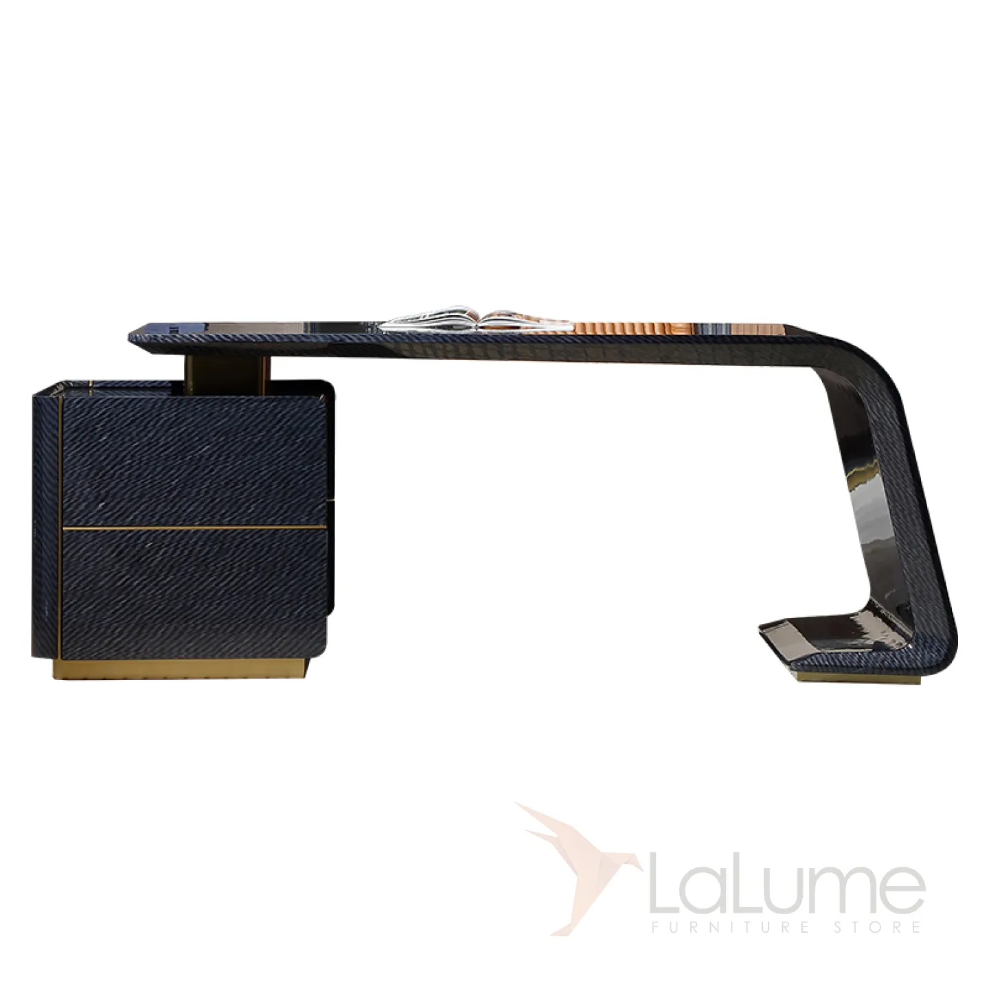 Этот роскошный письменный стол с плавными и строгими линиями выполнен в тёмно-синем цвете. Он изготовлен из отборного красного дерева с качественным шпоном, а его основание украшено латунью, которая создаёт эффект позолоты. Дополнительную функциональность столу придают два выдвижных ящика.