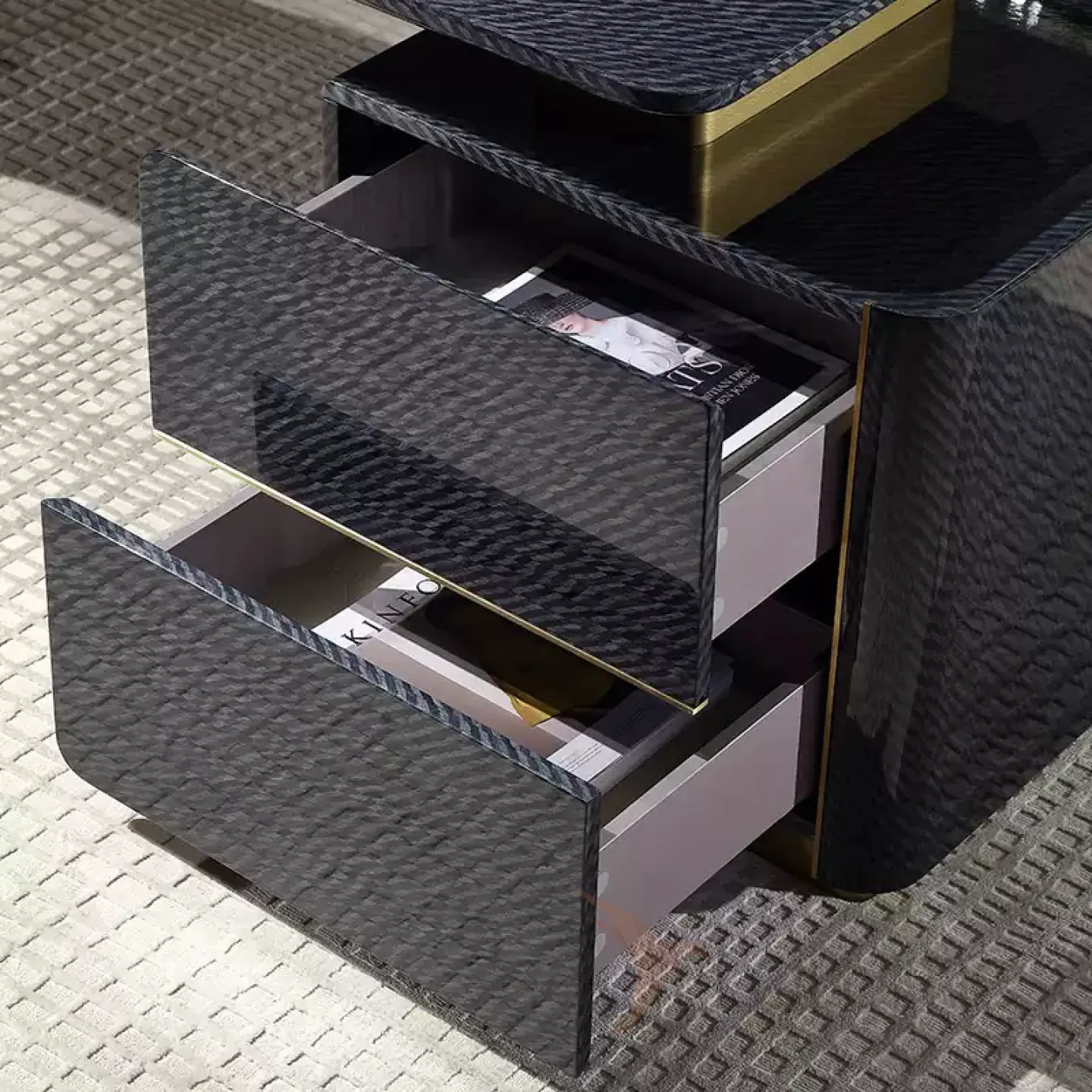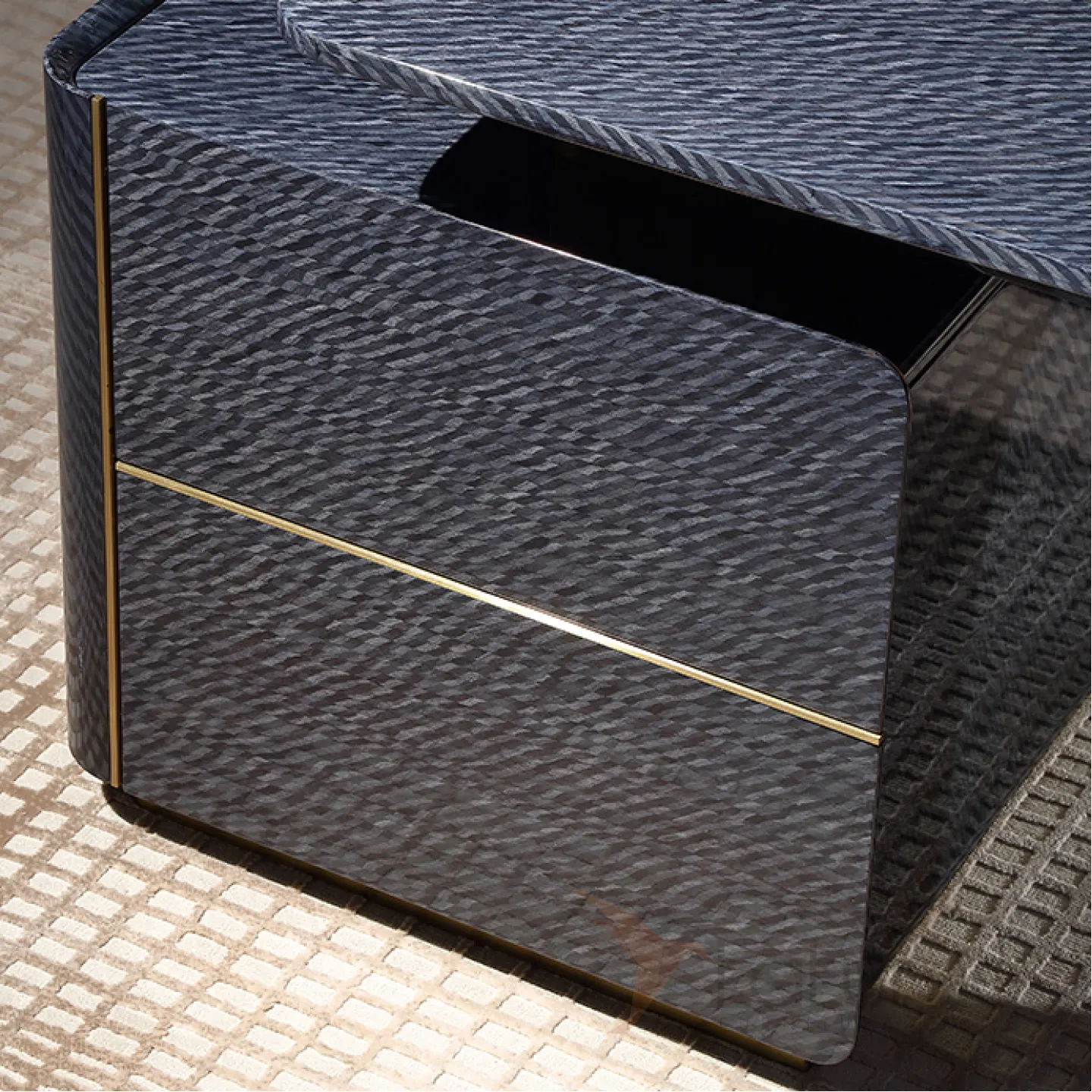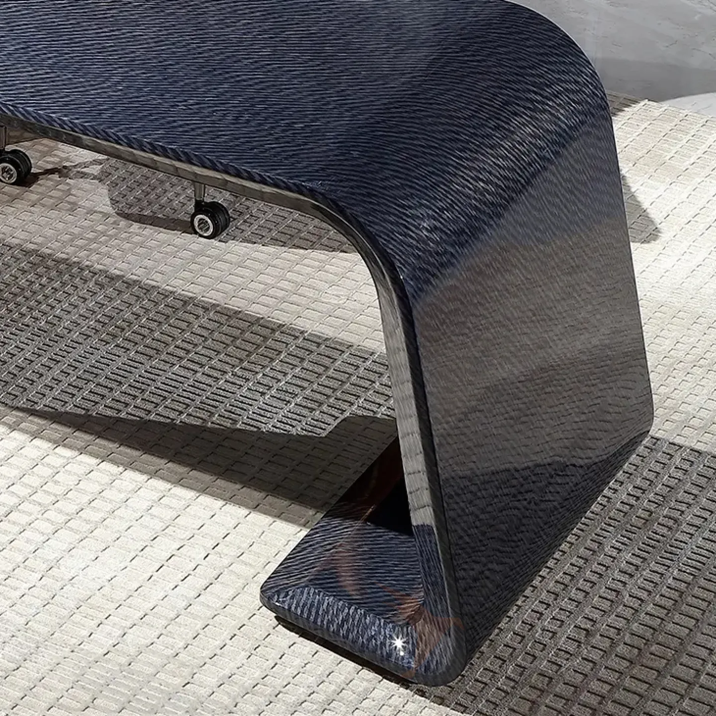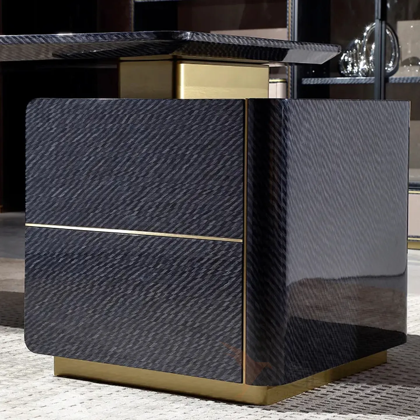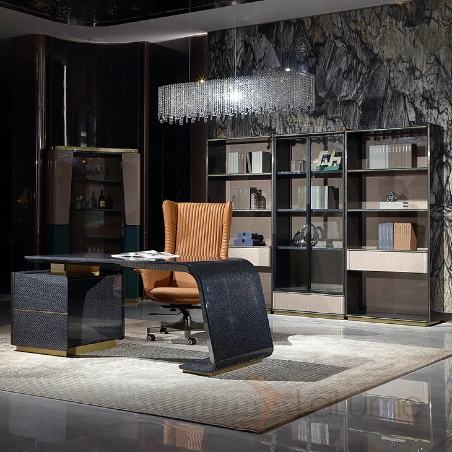 Этот роскошный письменный стол с плавными и строгими линиями выполнен в тёмно-синем цвете. Он изготовлен из отборного красного дерева с качественным шпоном, а его основание украшено латунью, которая создаёт эффект позолоты. Дополнительную функциональность столу придают два выдвижных ящика.