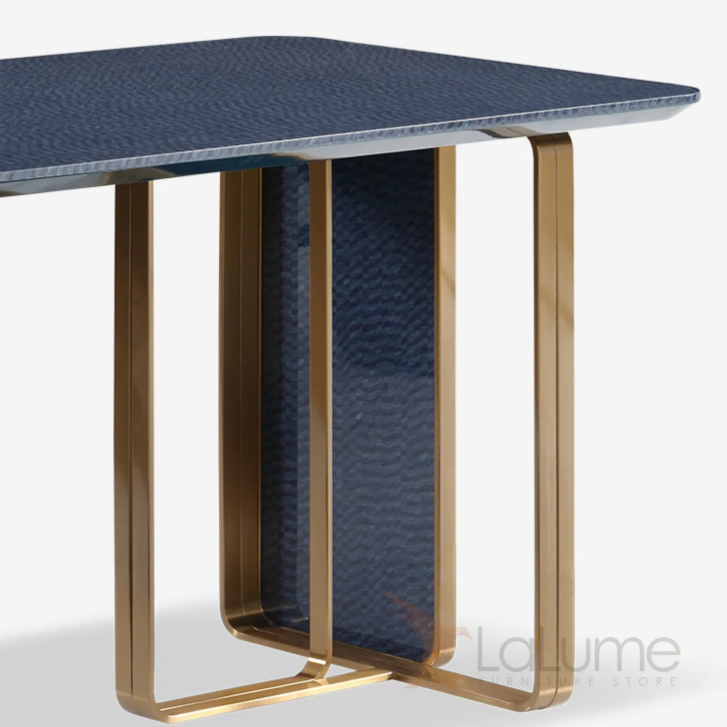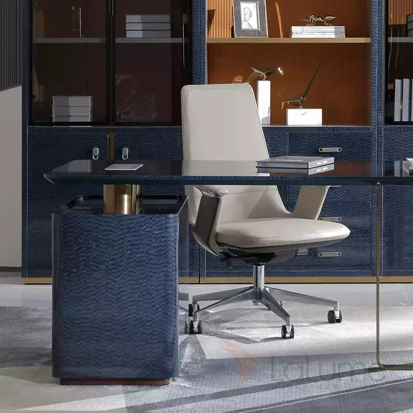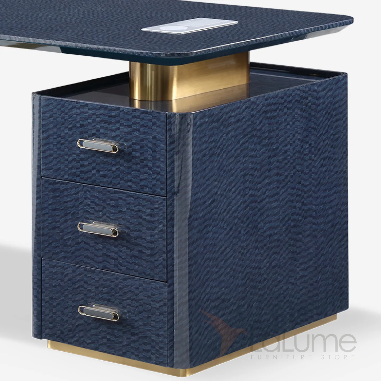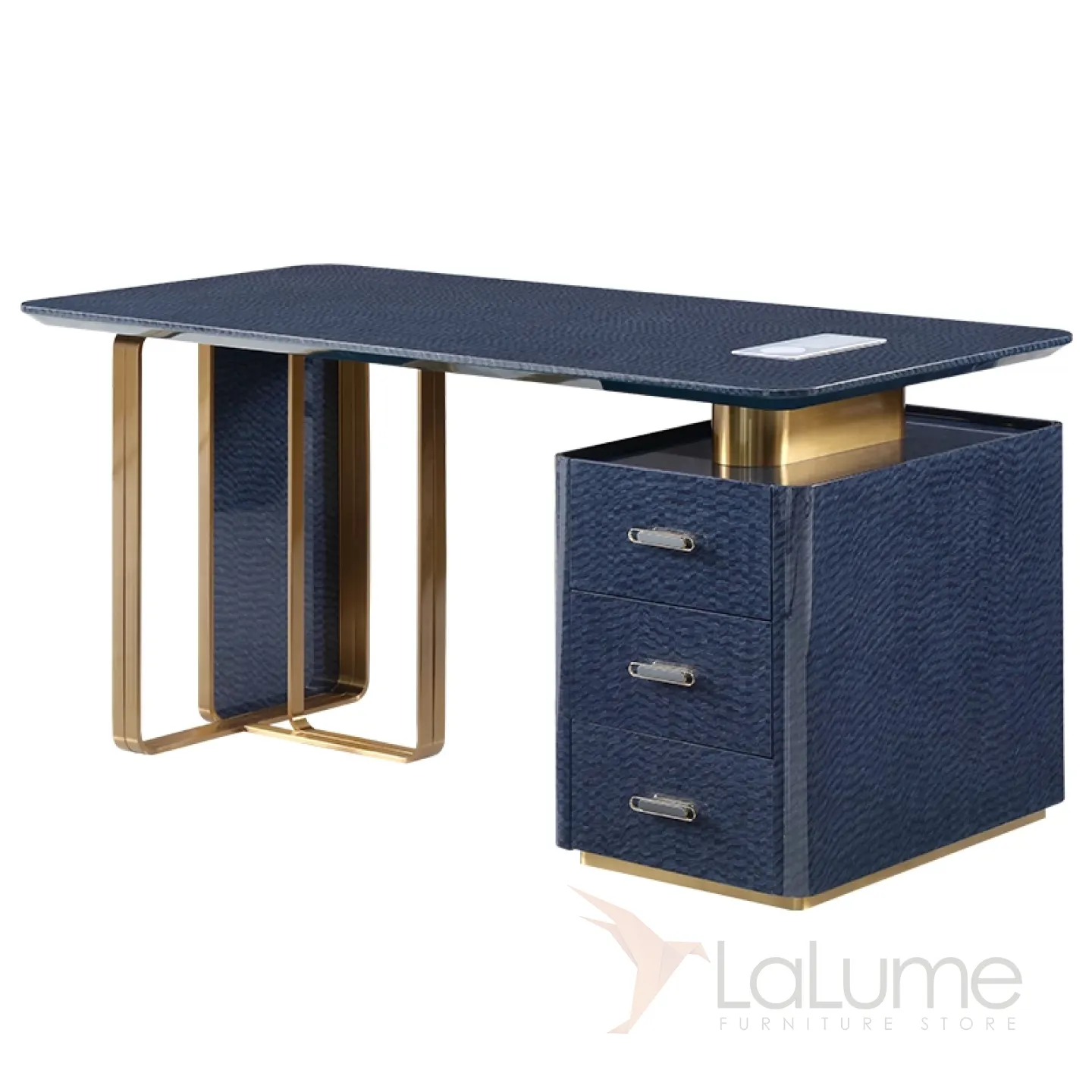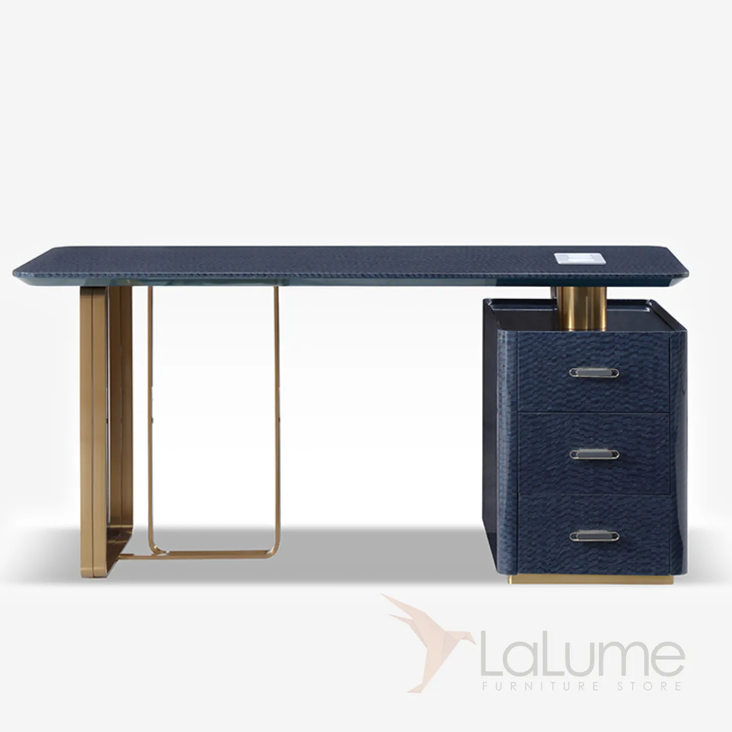 Этот элегантный письменный стол с плавными и строгими линиями выполнен в тёмно-синем цвете. Он изготовлен из бука с использованием высококачественного шпона, а его основание выполнено в золотистом оттенке. Три выдвижных ящика придают столу дополнительную функциональность.