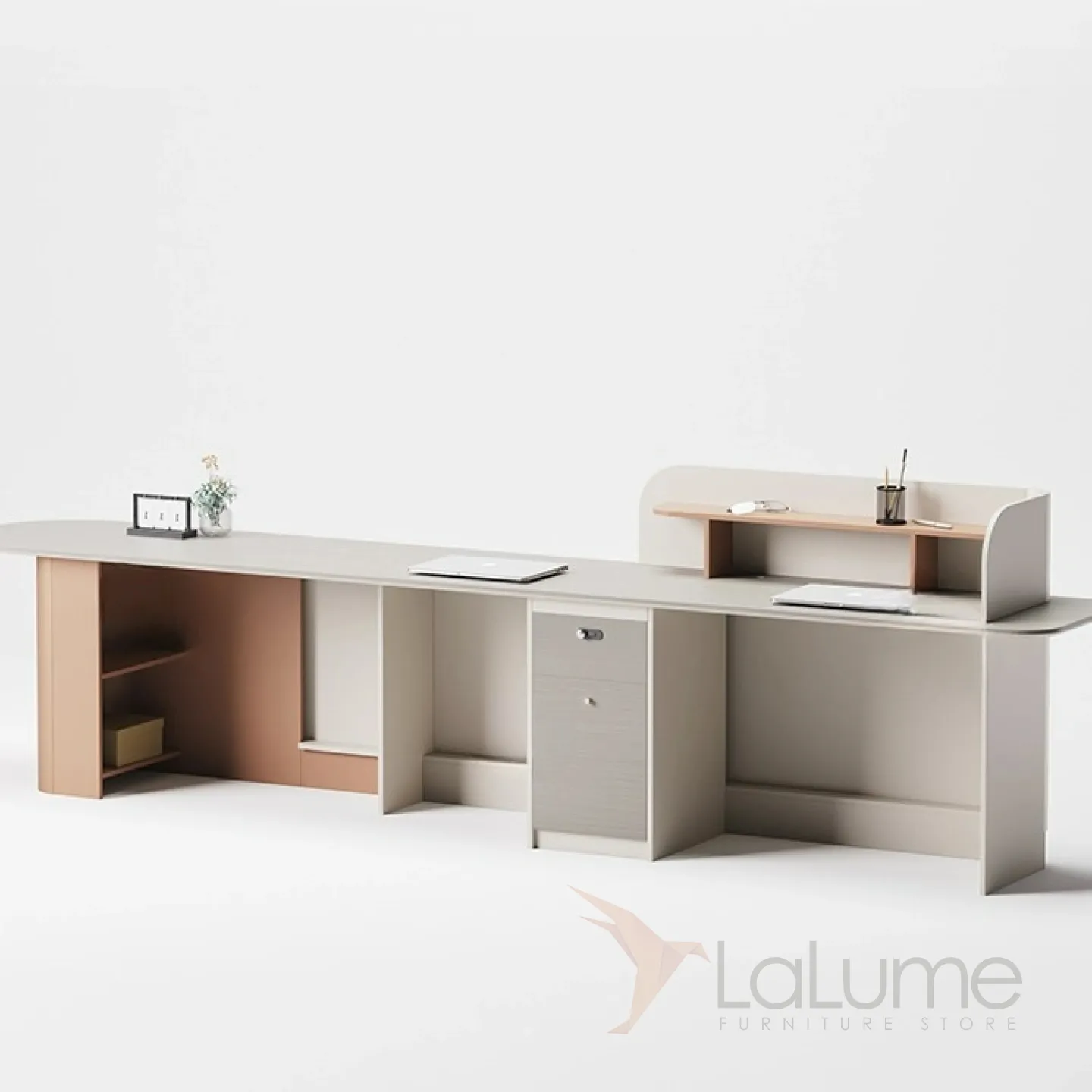 Стойка ресепшен из ДСП и меламина с подсветкой, рассчитана на 1-4 человек, с дополнительным комодом с дверкой и ящиком на замке.