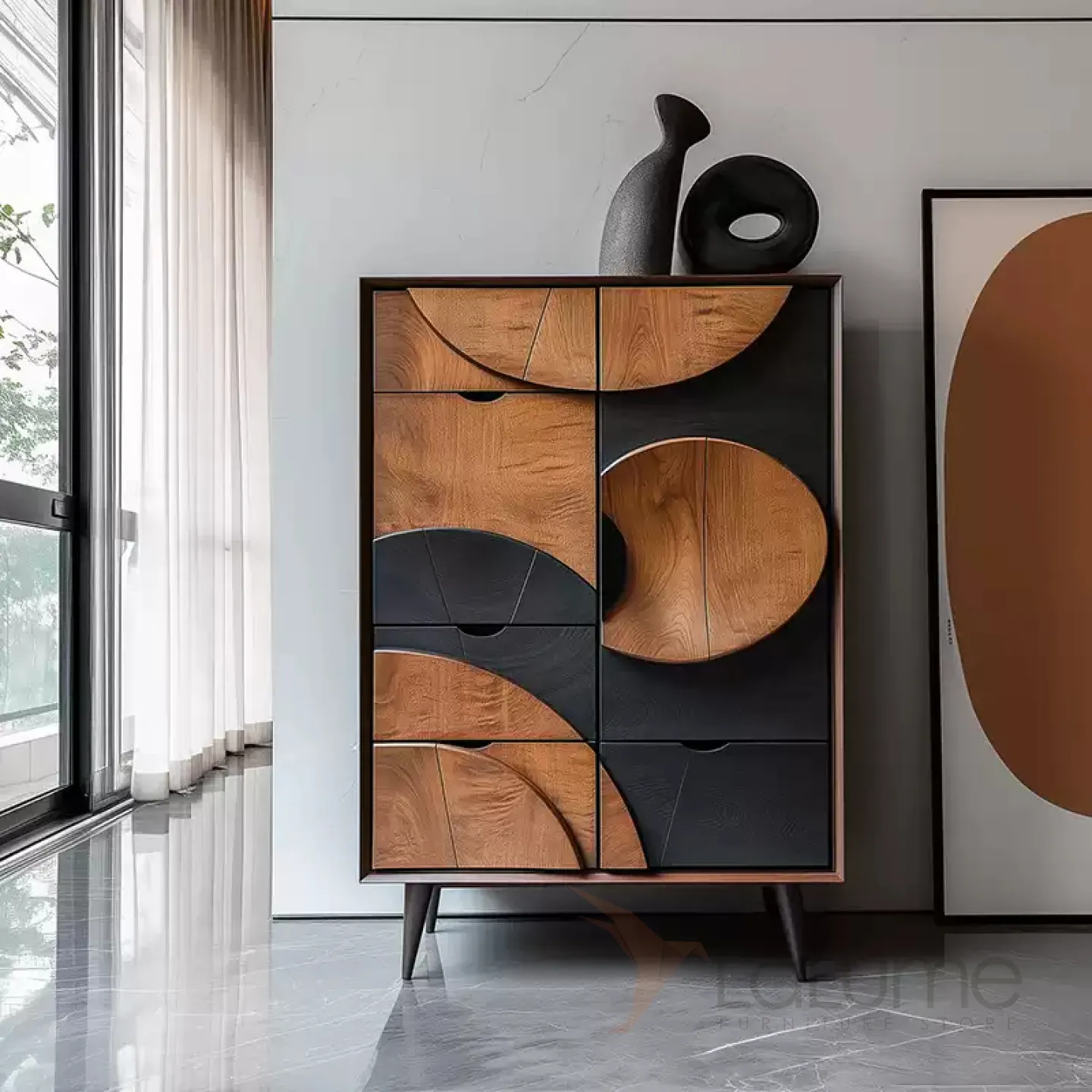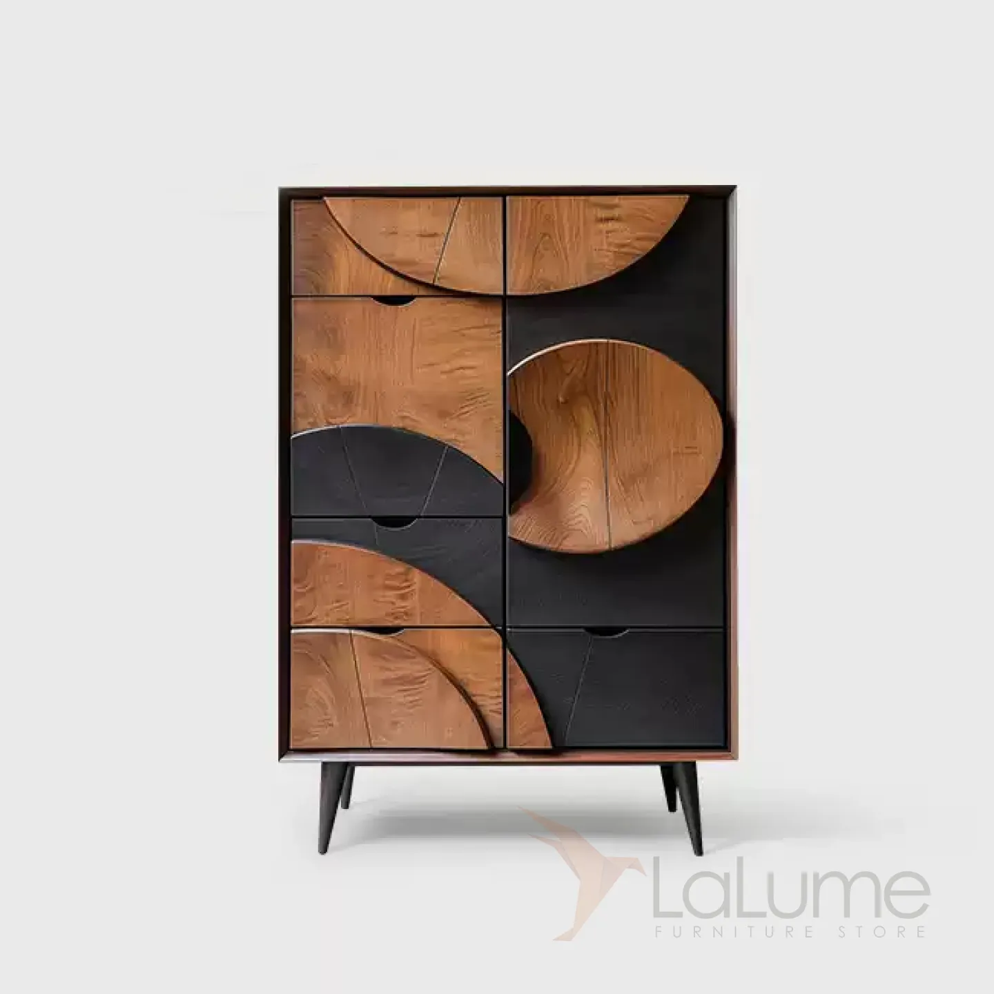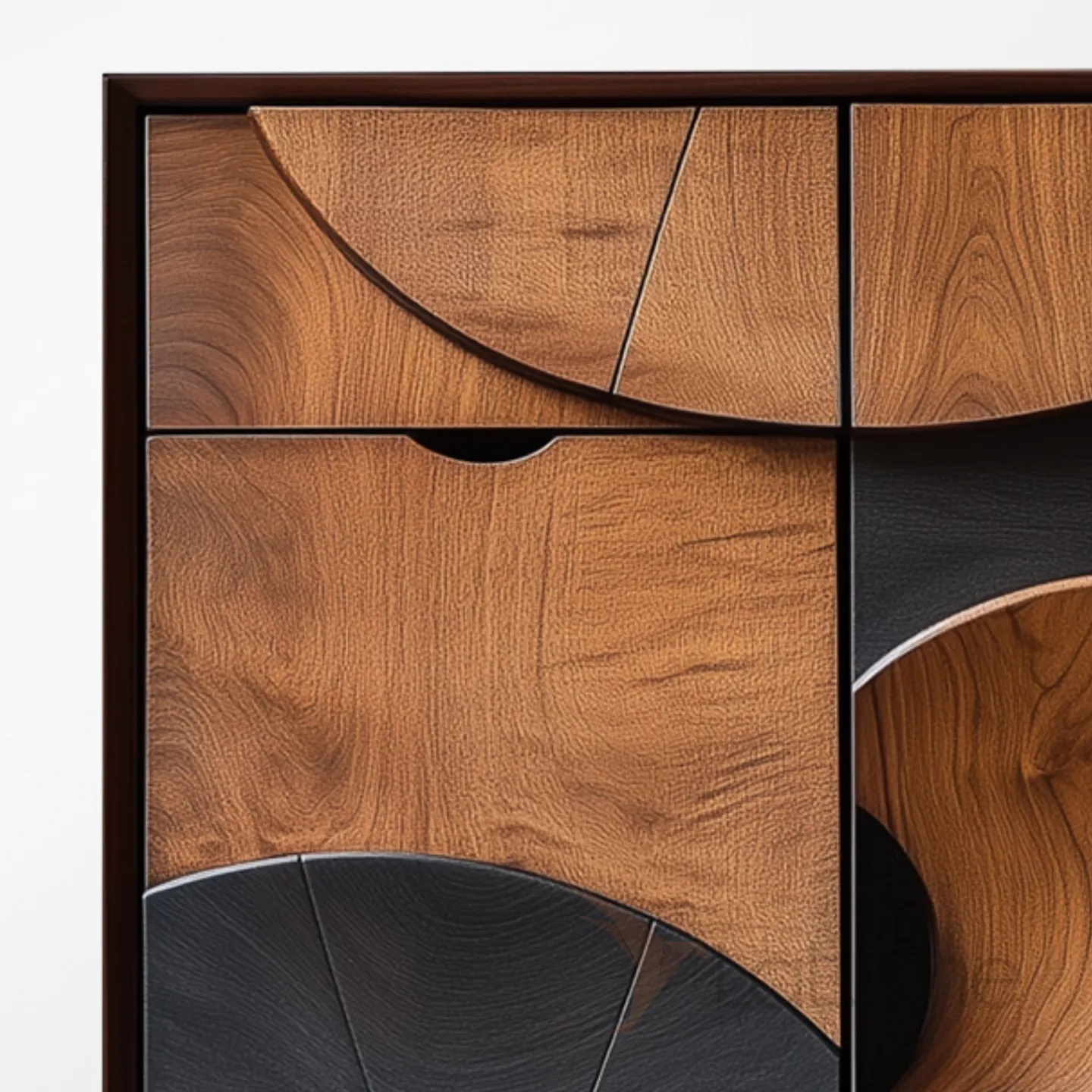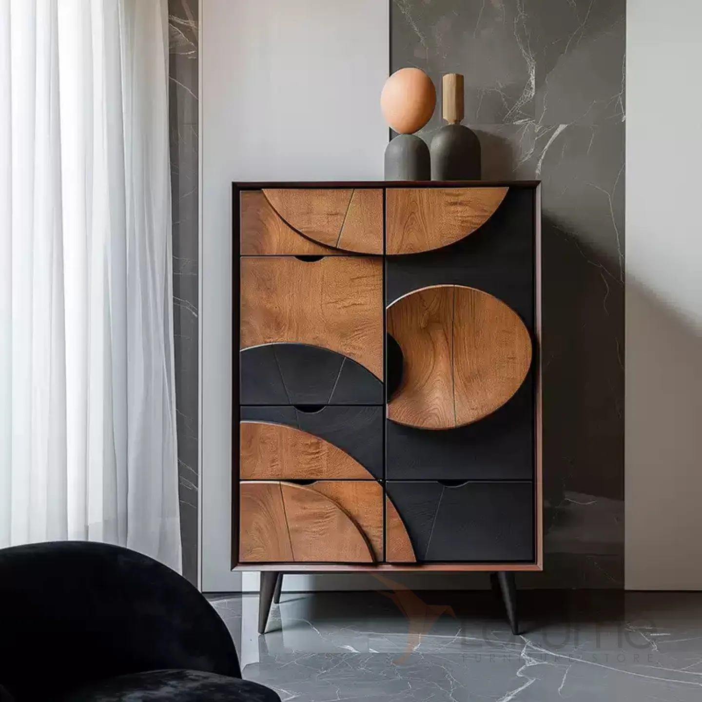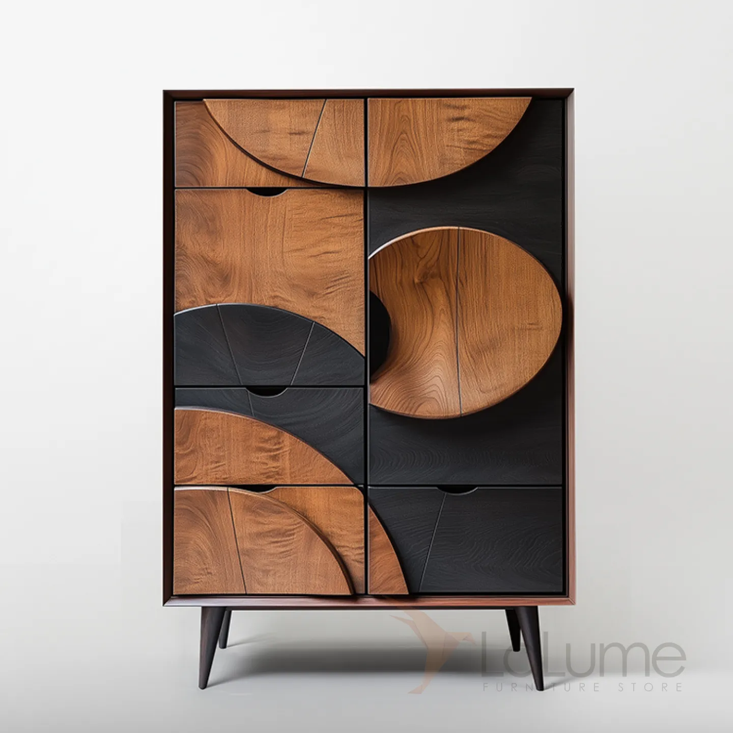 Шкаф из грецкого ореха ручной работы имеет необычный дизайн, что позволит сделать дополнительный акцент в интерьере. Множества выдвижных ящиков и распашная дверка помогут организовать пространство, систему хранения вещей.