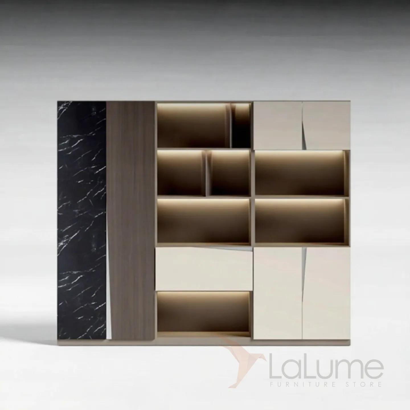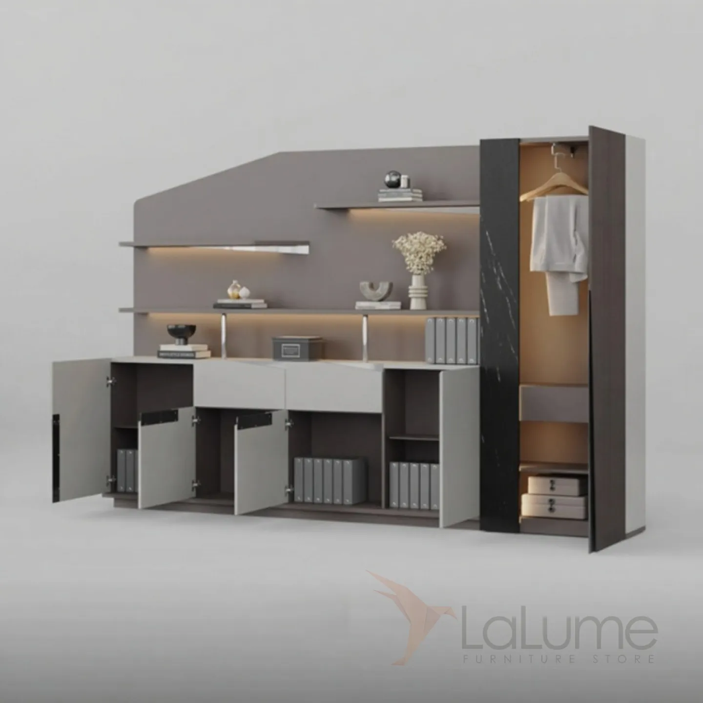 Современный практичный шкаф из ДСП с подсветкой, с большим количеством открытых полок, ящиков и дверцы для хранения, штангой для одежды. Несколько моделей на выбор.