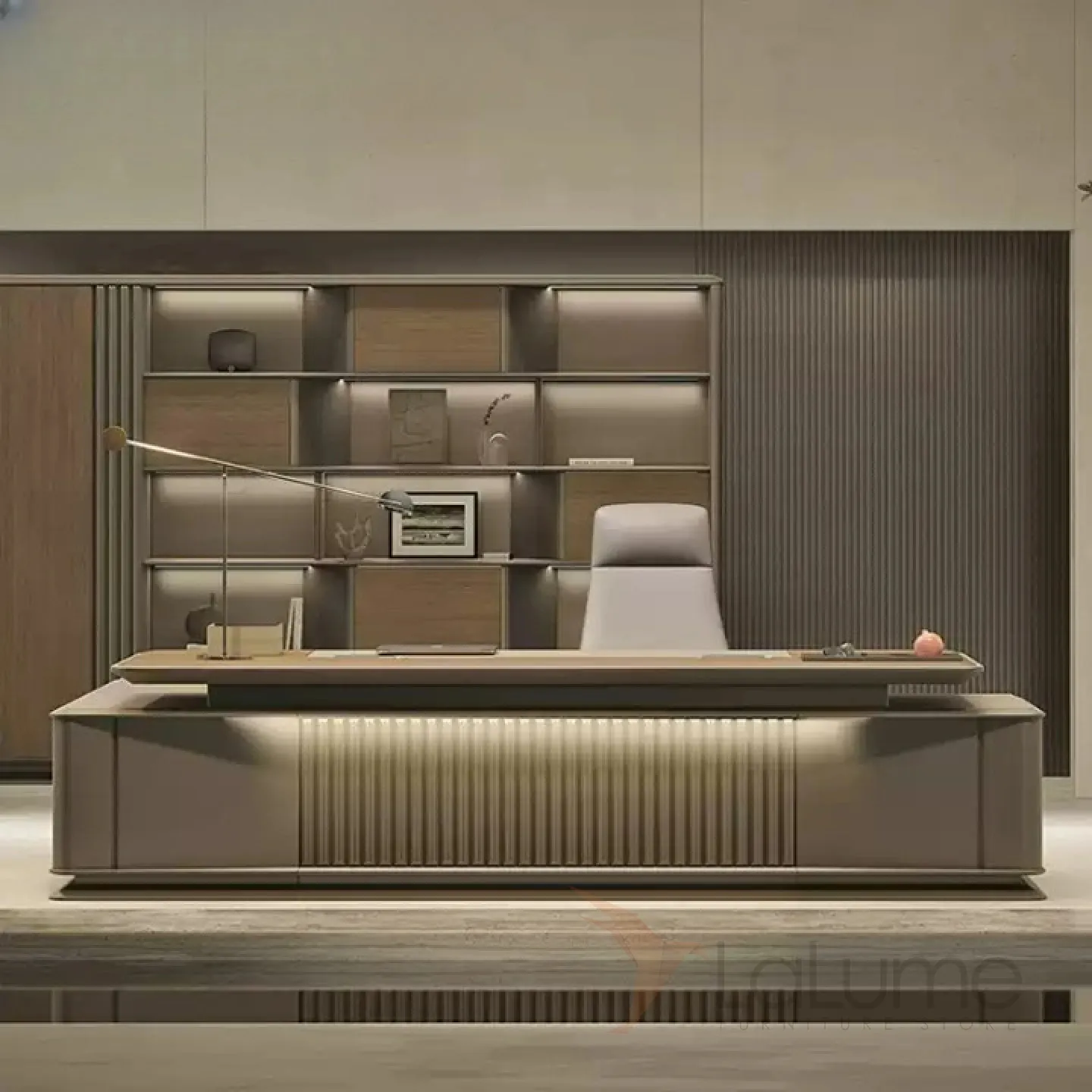Современный практичный шкаф из МДФ с подсветкой, с большим количеством открытых полок, ящиков и дверцы для хранения. Несколько моделей на выбор.