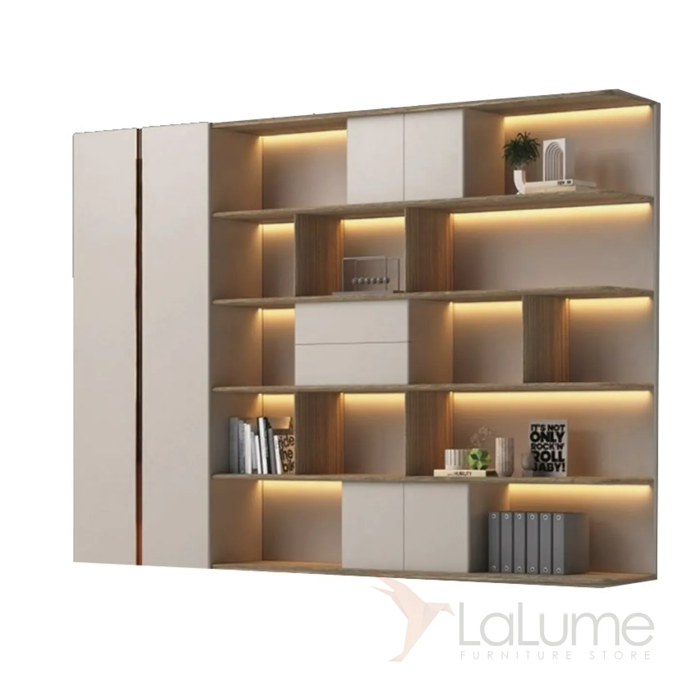 Современный практичный шкаф из МДФ с подсветкой, с большим количеством открытых полок, ящиков и дверцы для хранения. Несколько моделей на выбор.