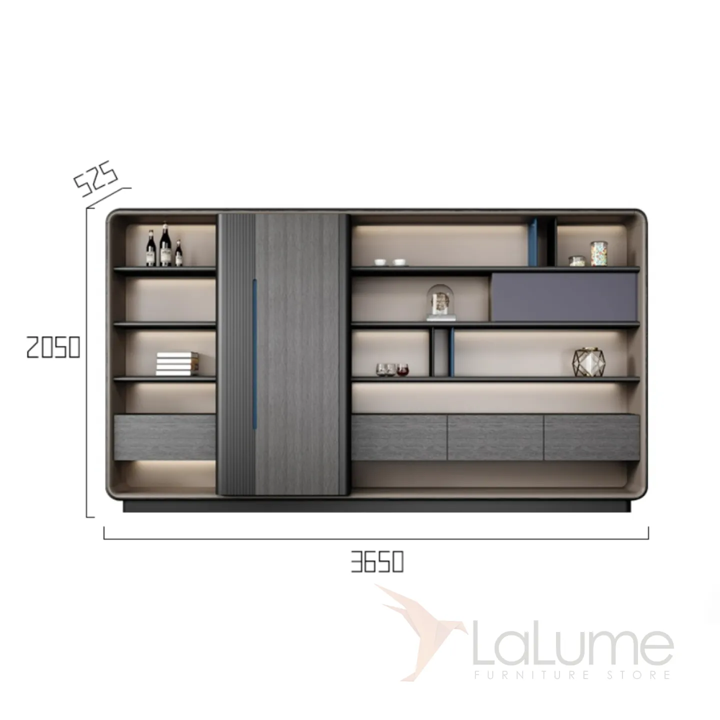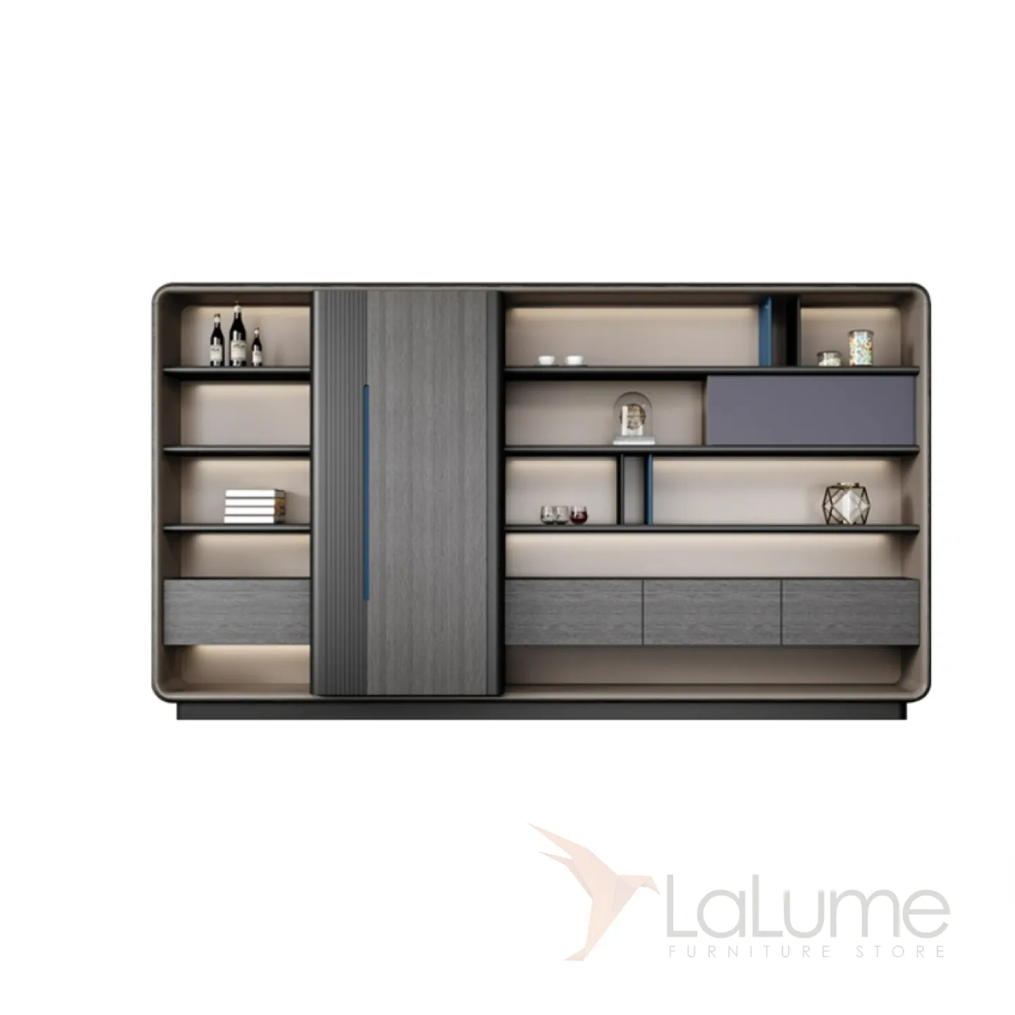 Современный практичный шкаф из ДСП с подсветкой, с большим количеством открытых полок, ящиков и дверцы для хранения.