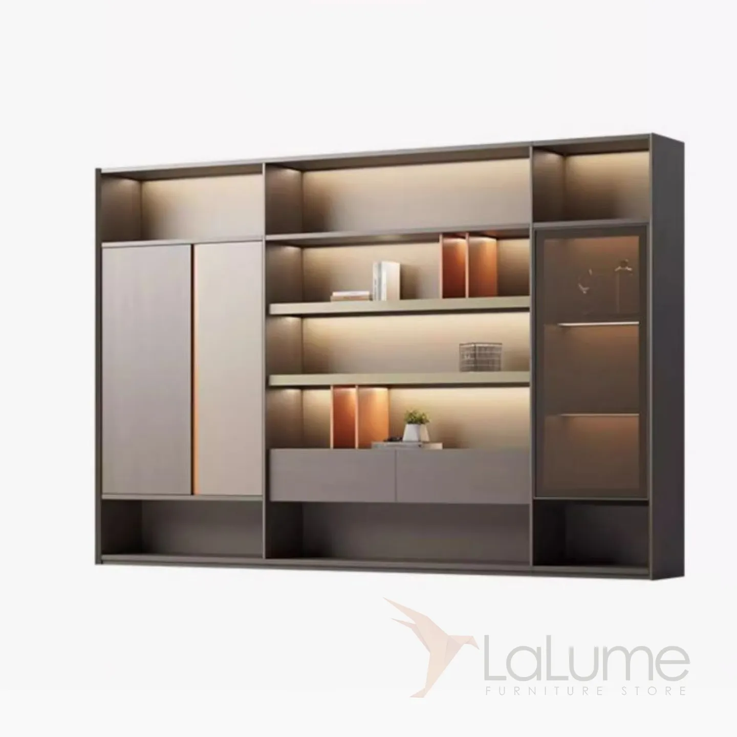 Современный практичный шкаф из ДСП с подсветкой, с большим количеством открытых полок, ящиков и дверцы для хранения. Несколько размеров на выбор.