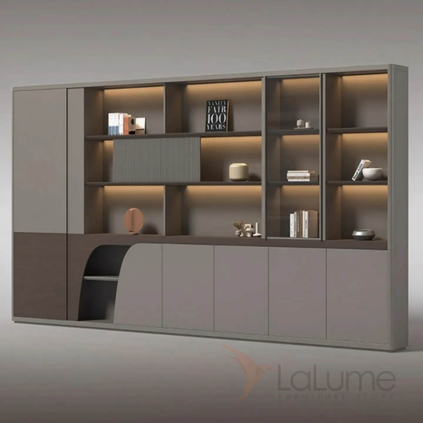Современный шкаф из меламина с подсветкой, с большим количеством открытых полок, отделов с дверцами для хранения.