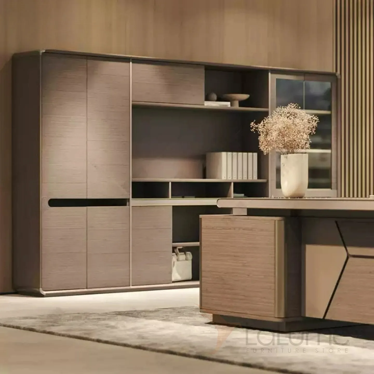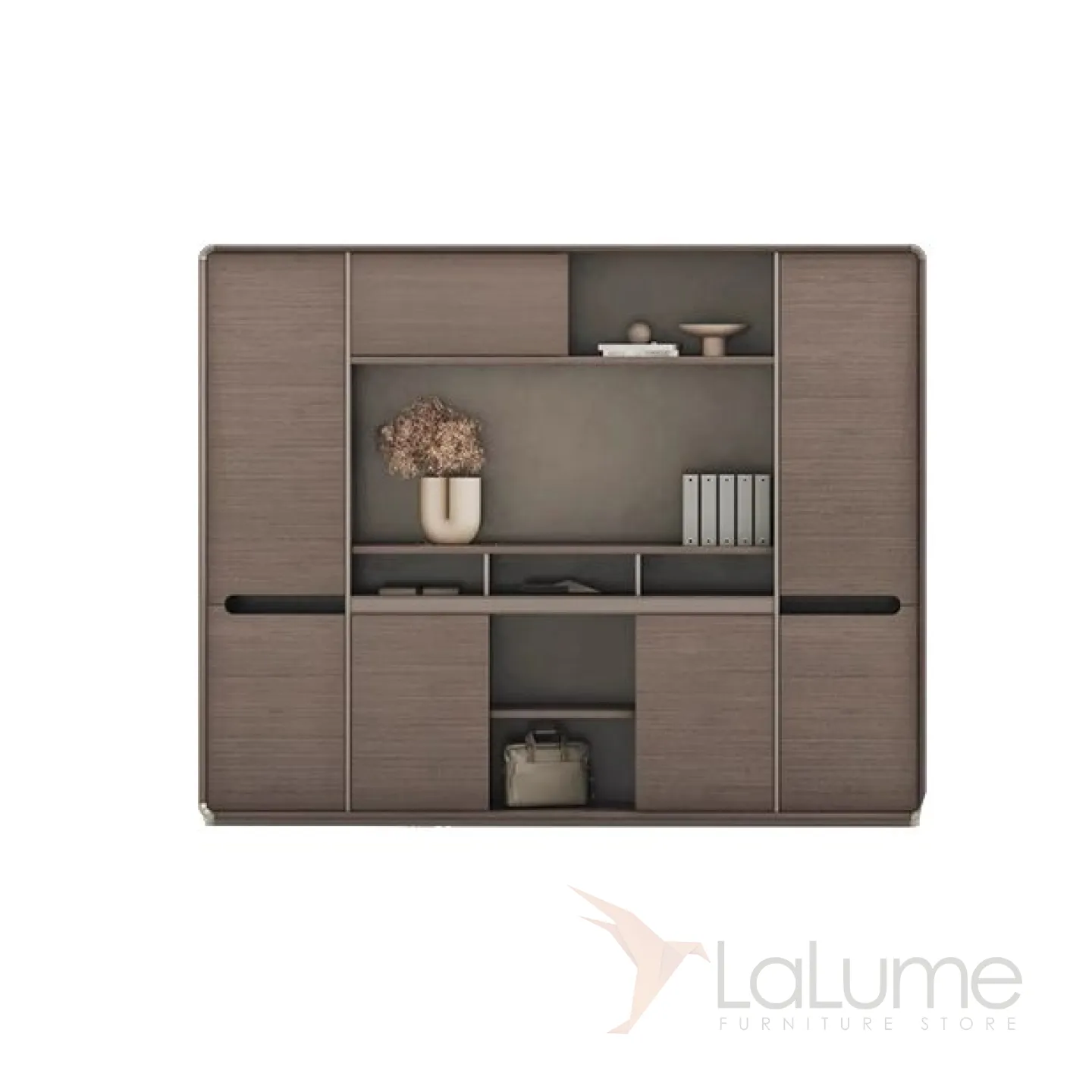 Удобный офисный шкаф из МДФ с открытыми полками, закрытыми отделами за стеклянной дверцей для хранения вещей. Два варианта.