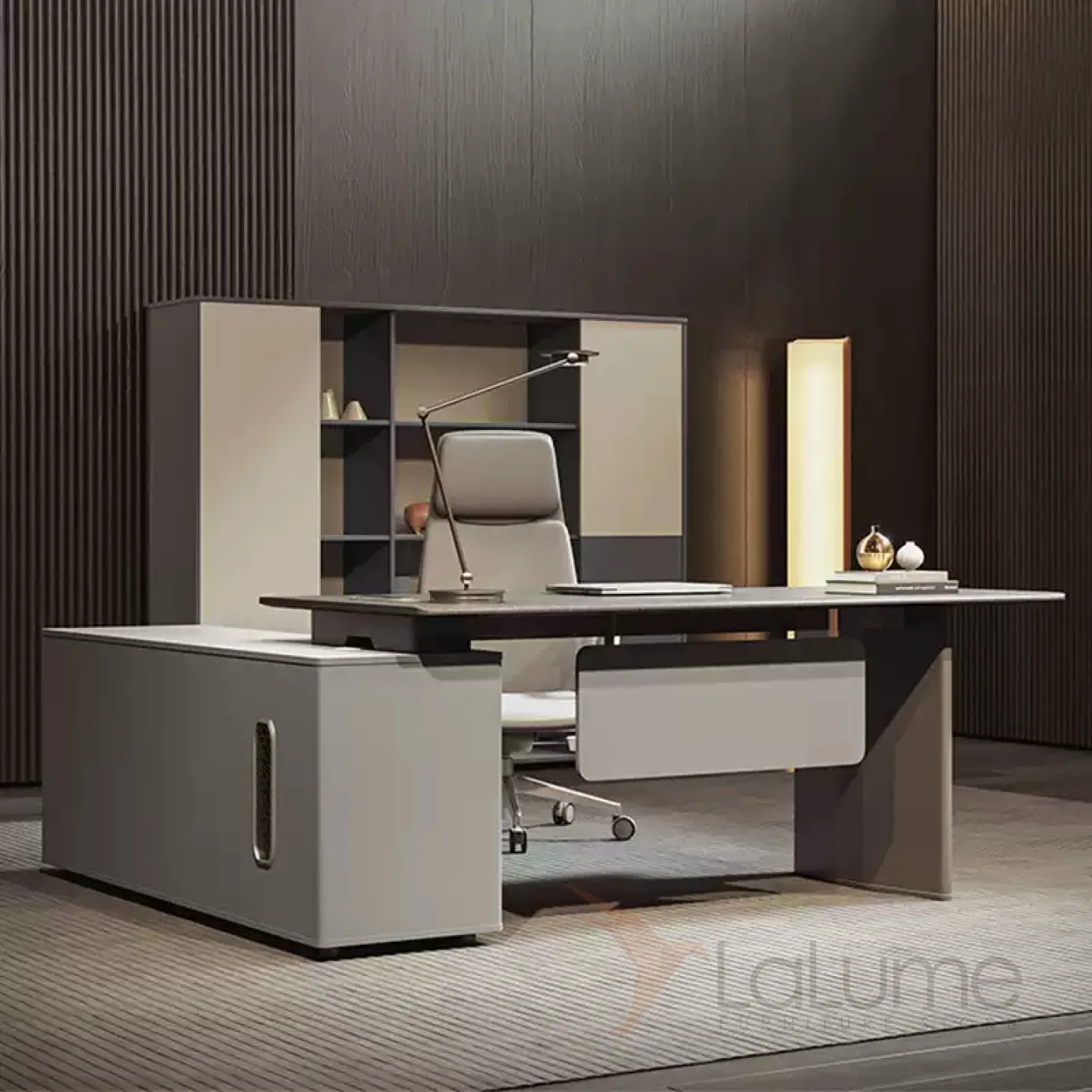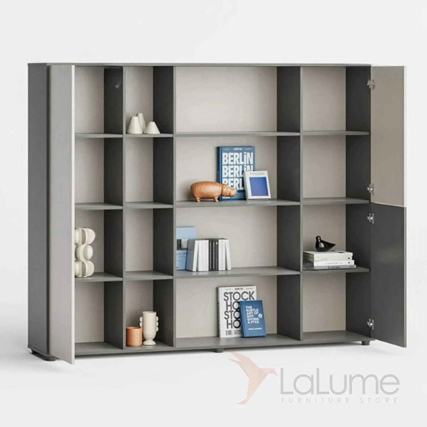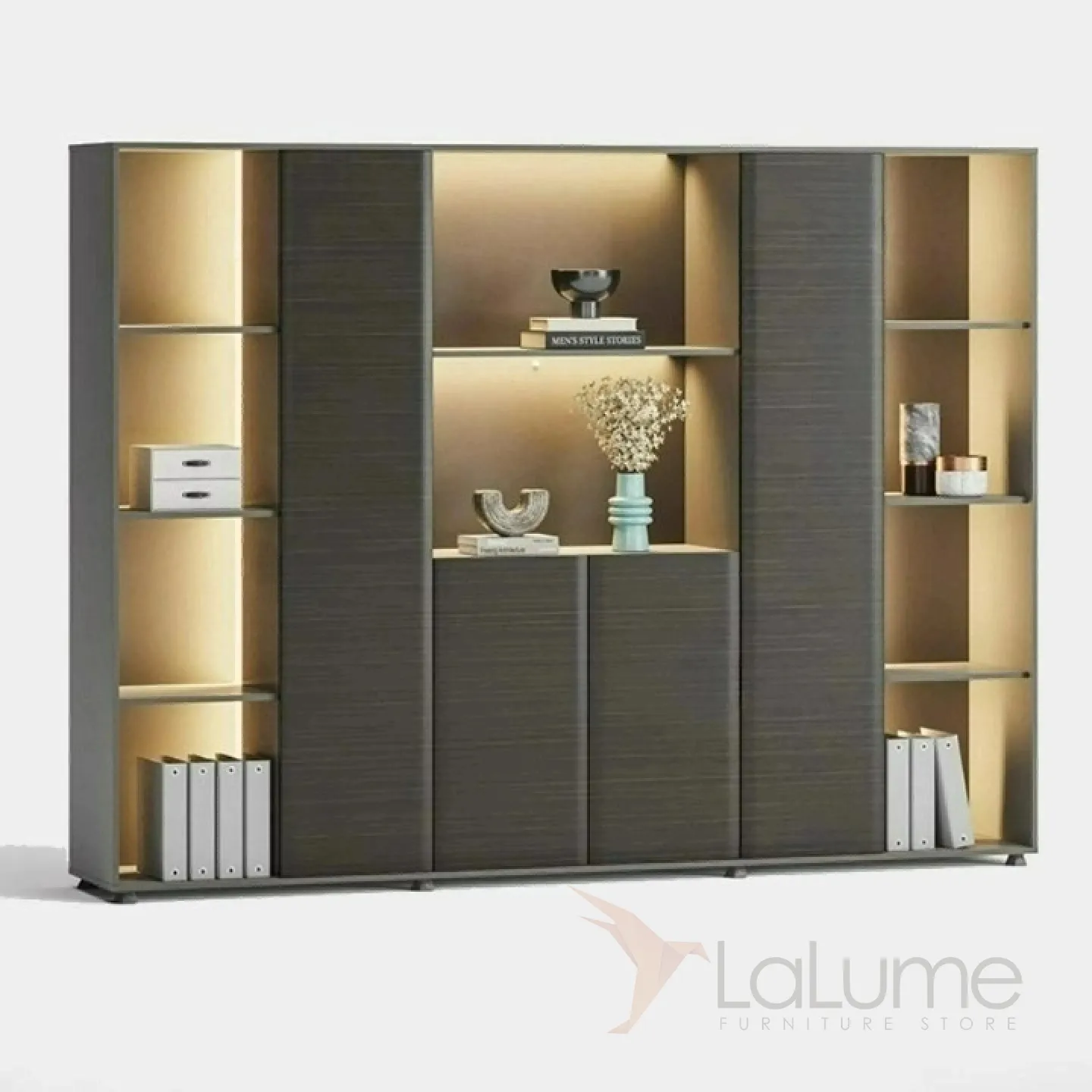 Удобный офисный шкаф из ДСП с подсветкой, с открытыми полками, закрытыми отделами за стеклянной дверцей для хранения вещей. Четыре варианта.