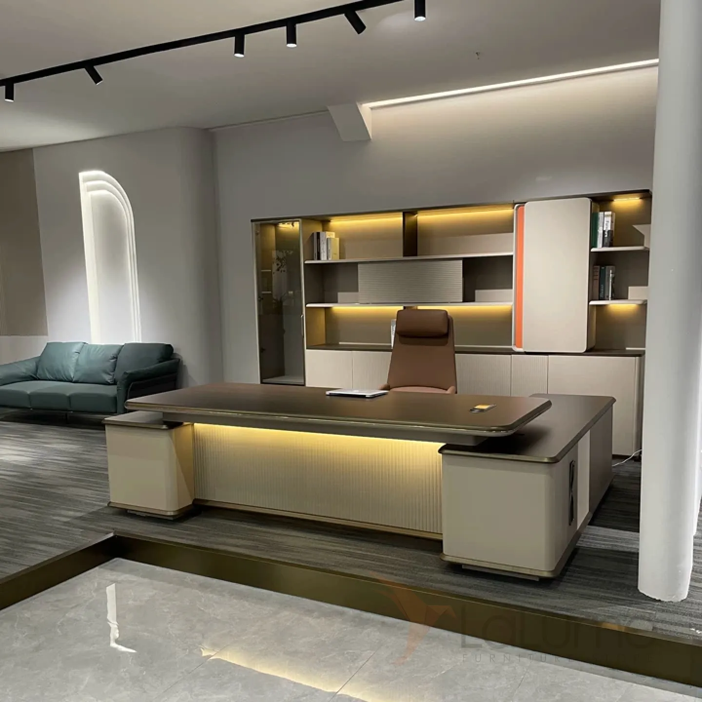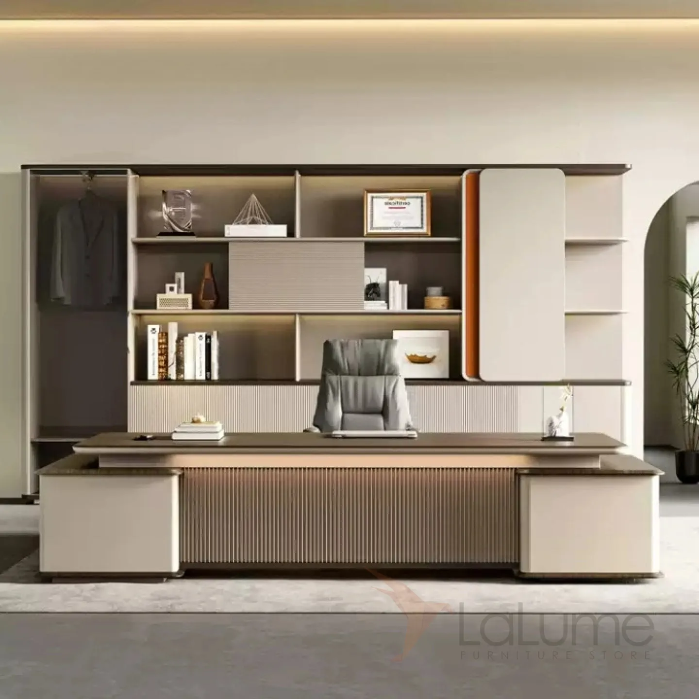 Практичный офисный шкаф из меламина с подсветкой с множеством открытых полок, закрытых мест для хранения вещей. На выбор 4 варианта.