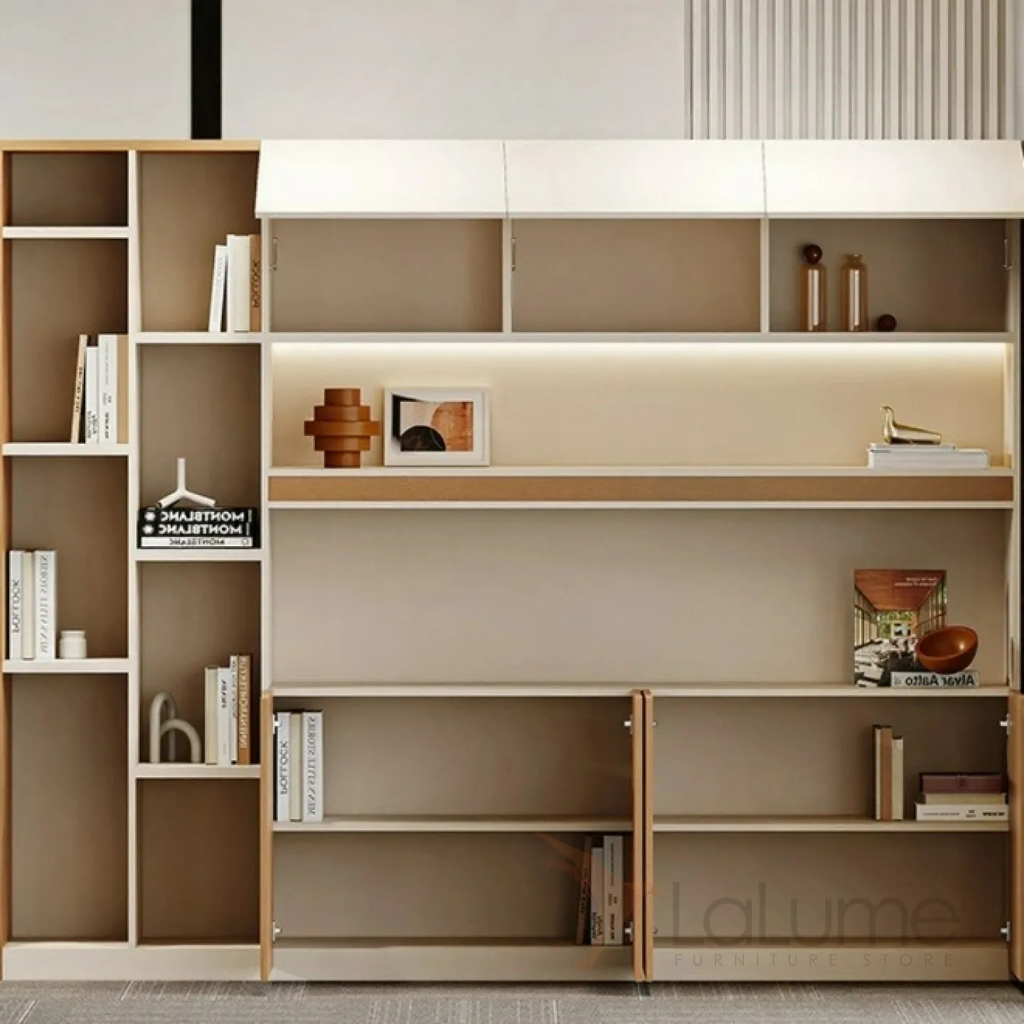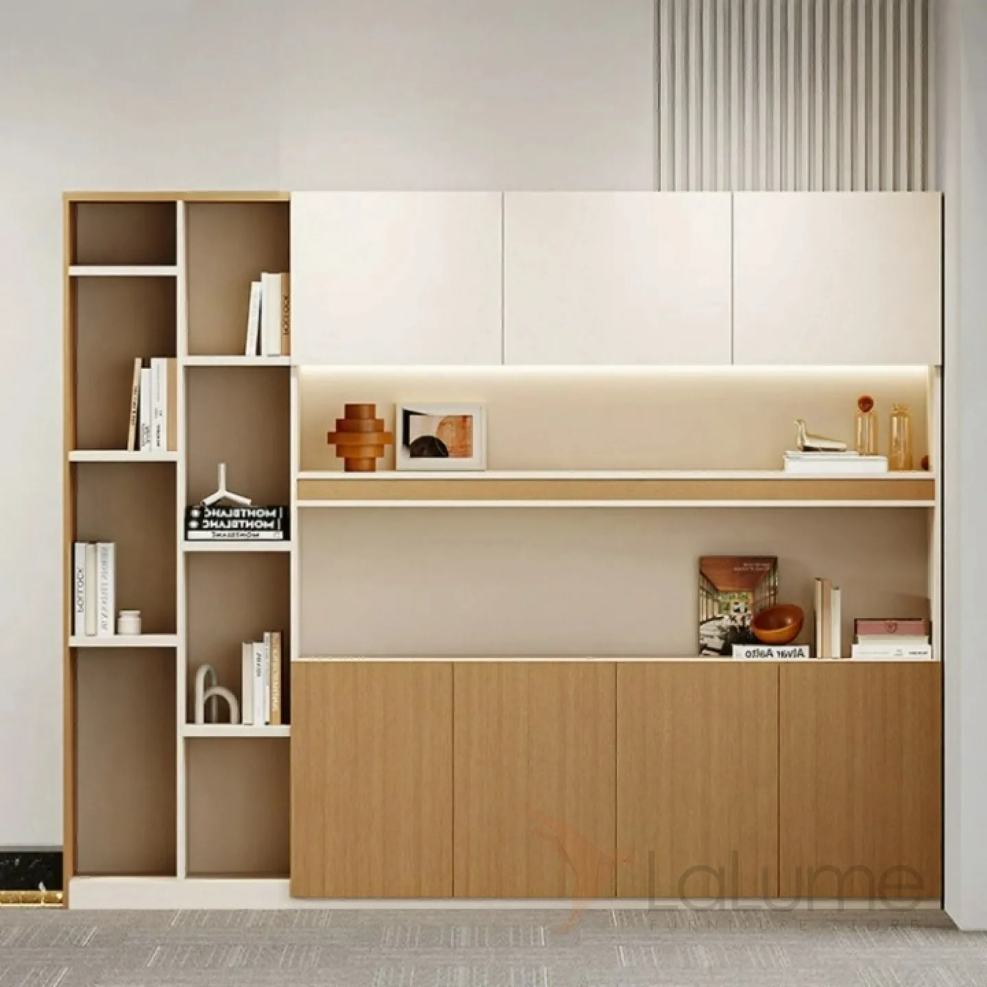 Практичный офисный шкаф из МДФ с подсветкой с множеством открытых полок, закрытых мест для хранения вещей. На выбор 3 варианта.