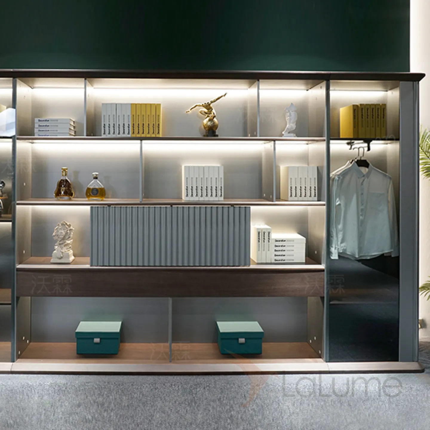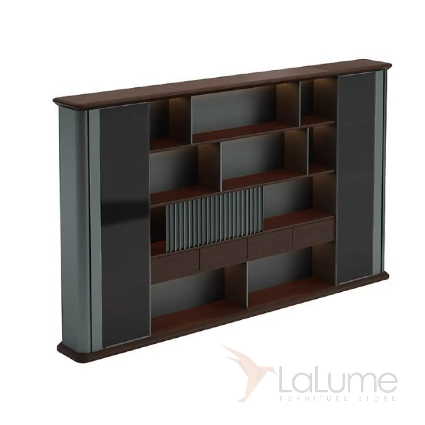 Практичный офисный шкаф из МДФ с подсветкой с множеством открытых полок, закрытых мест для хранения вещей. На выбор 2 варианта.