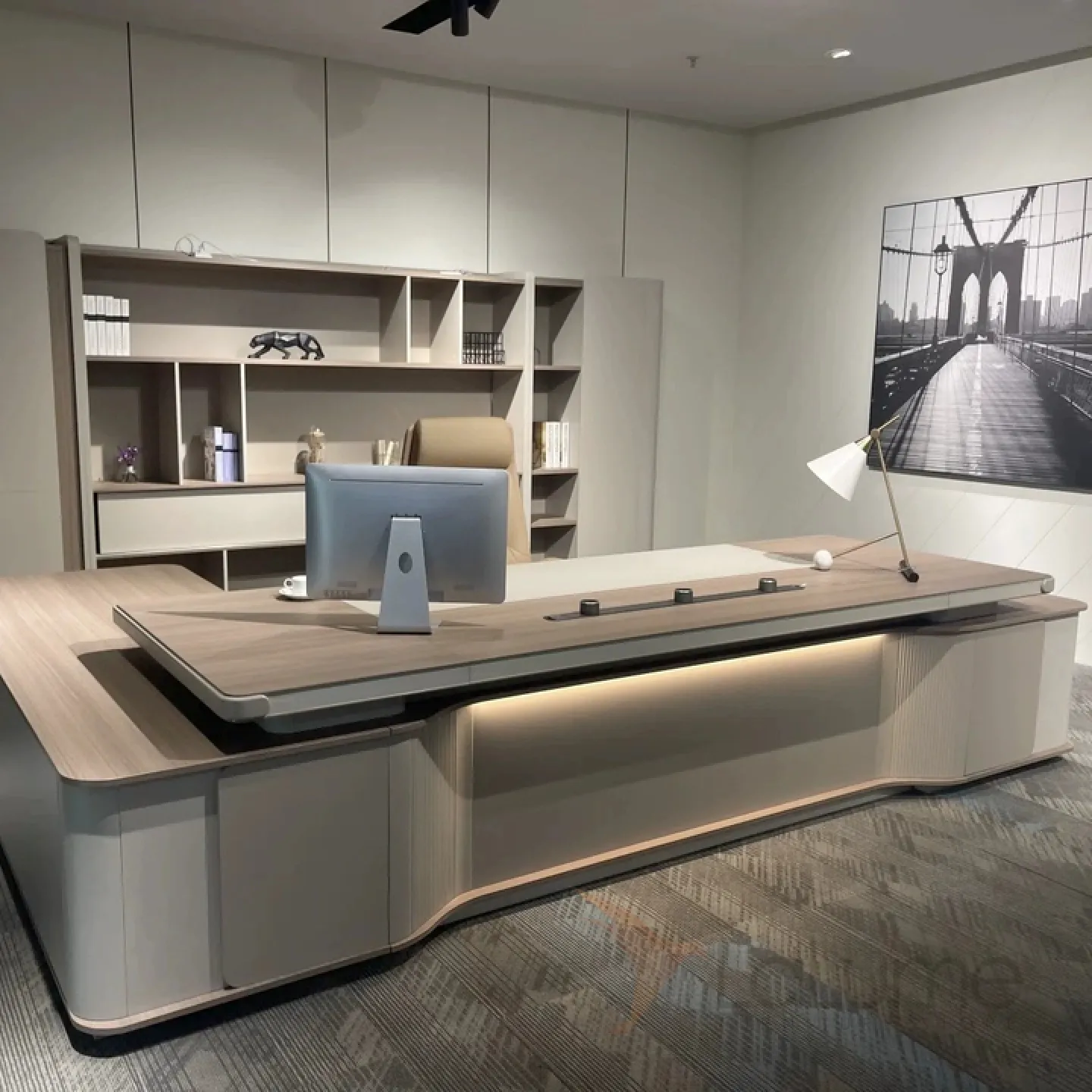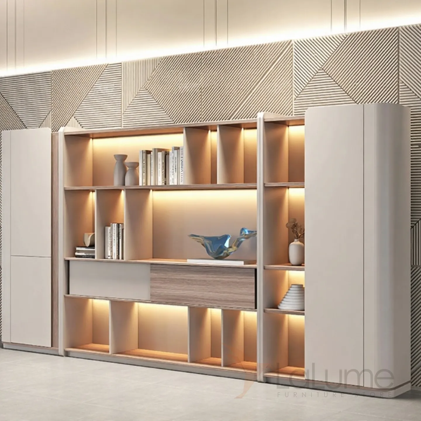 Практичный офисный шкаф из меламина с подсветкой с множеством открытых полок, закрытых мест для хранения вещей. На выбор 6 вариантов.