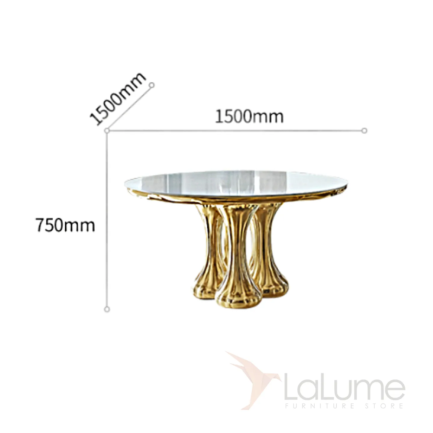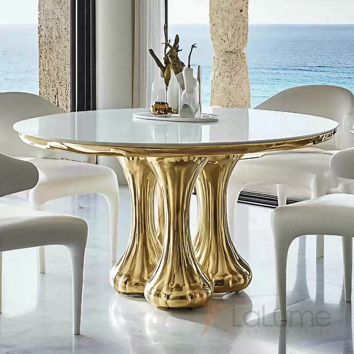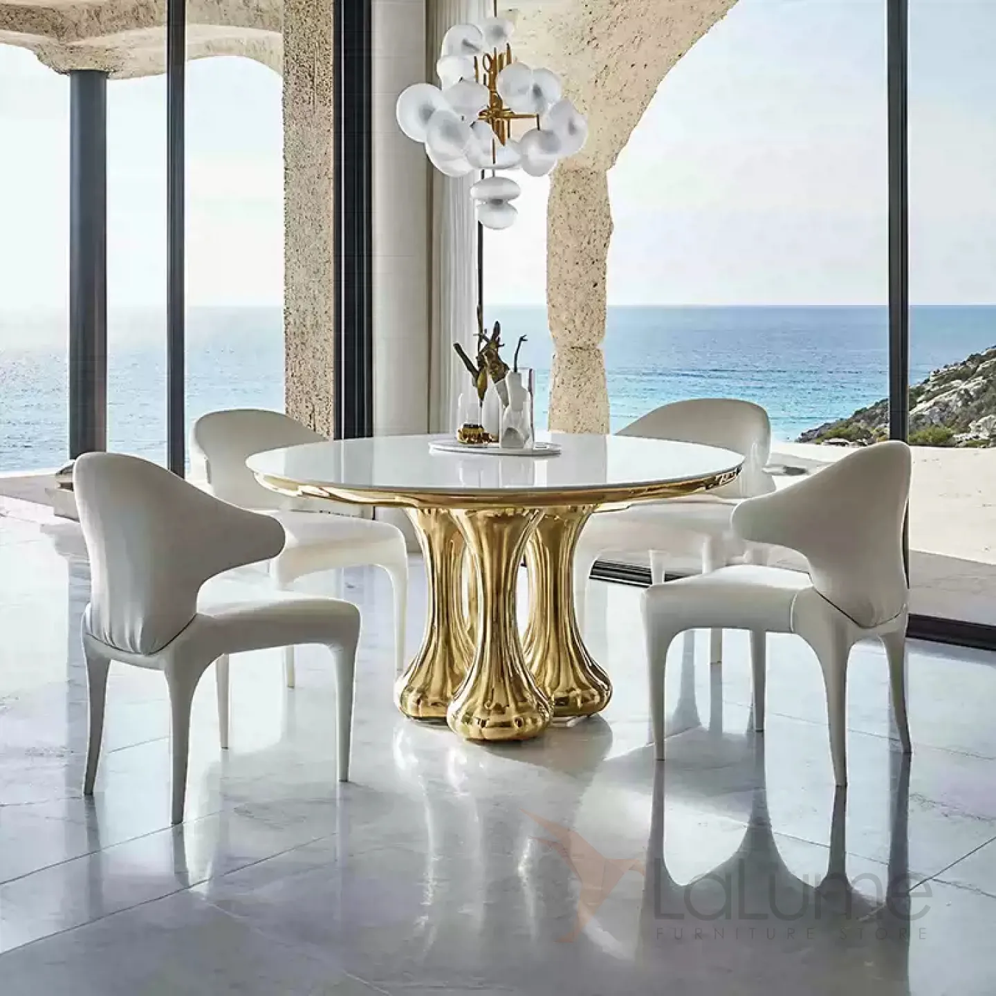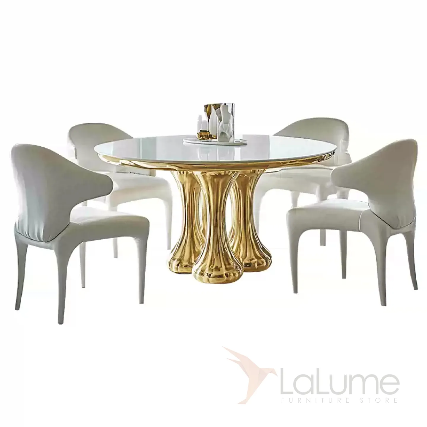 Изысканный обеденный стол с мраморной столешницей и золотой ножкой станет настоящим украшением вашей столовой. Его качественные материалы и уникальный дизайн привлекут внимание всех гостей. За обеденным столом могут разместиться до 10 человек.