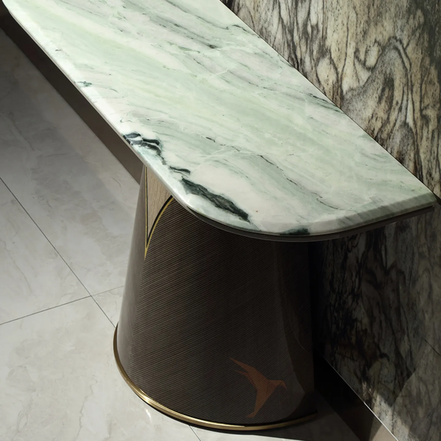 Элегантный столик, украшенный столешницей из натурального мрамора с переливающимися белыми и зелеными оттенками, а также обрамлённый красным деревом и латунью с золотистым отливом, станет настоящим шедевром в вашем доме. Он прекрасно впишется в любую интерьерную композицию — будь то входная зона, гостиная или кабинет. Благодаря своему удобному расположению у стены, столик станет неотъемлемой частью вашего пространства.