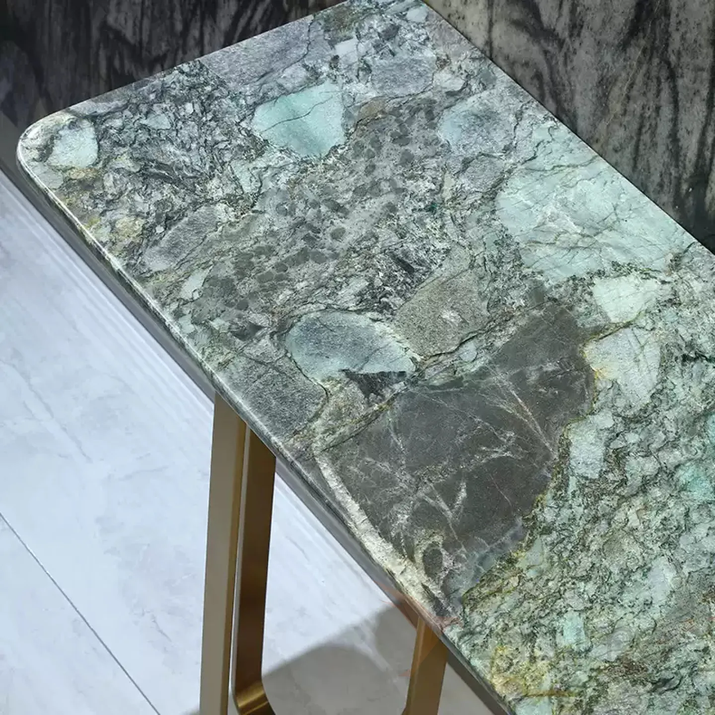 Изящный столик с поверхностью из натурального зелёного мрамора и основанием из латуни, имитирующим золото, а также с ножкой из красного дерева, покрытой шпоном, — это настоящее украшение для любого интерьера. Будь то прихожая, гостиная или кабинет, этот стол станет гармоничным дополнением обстановки. Благодаря своему расположению у стены, он станет неотъемлемой частью вашего пространства.