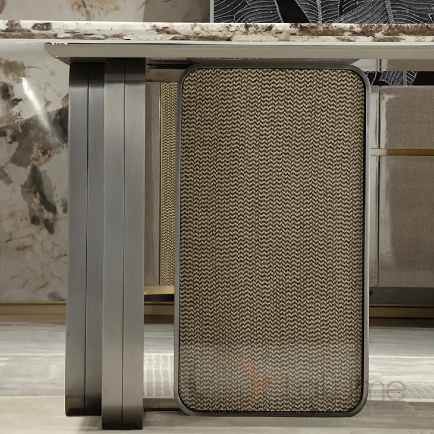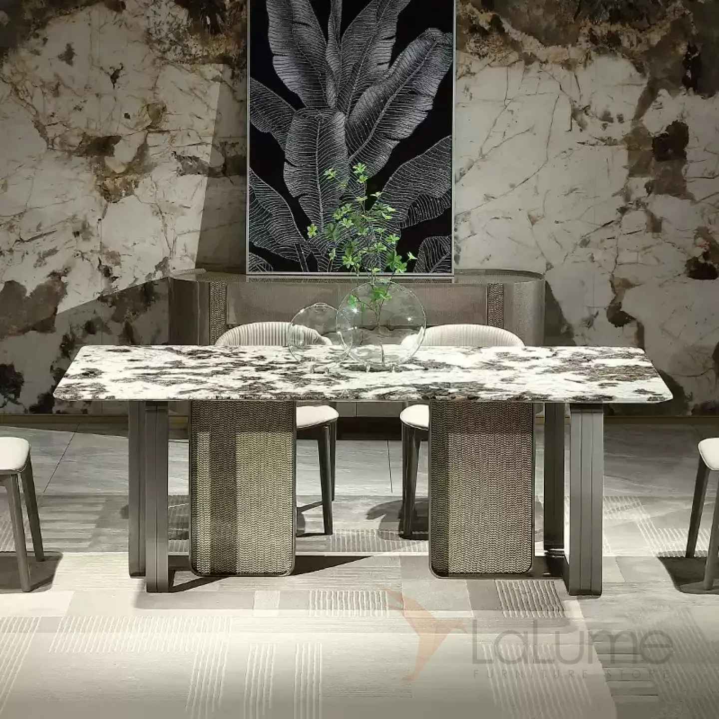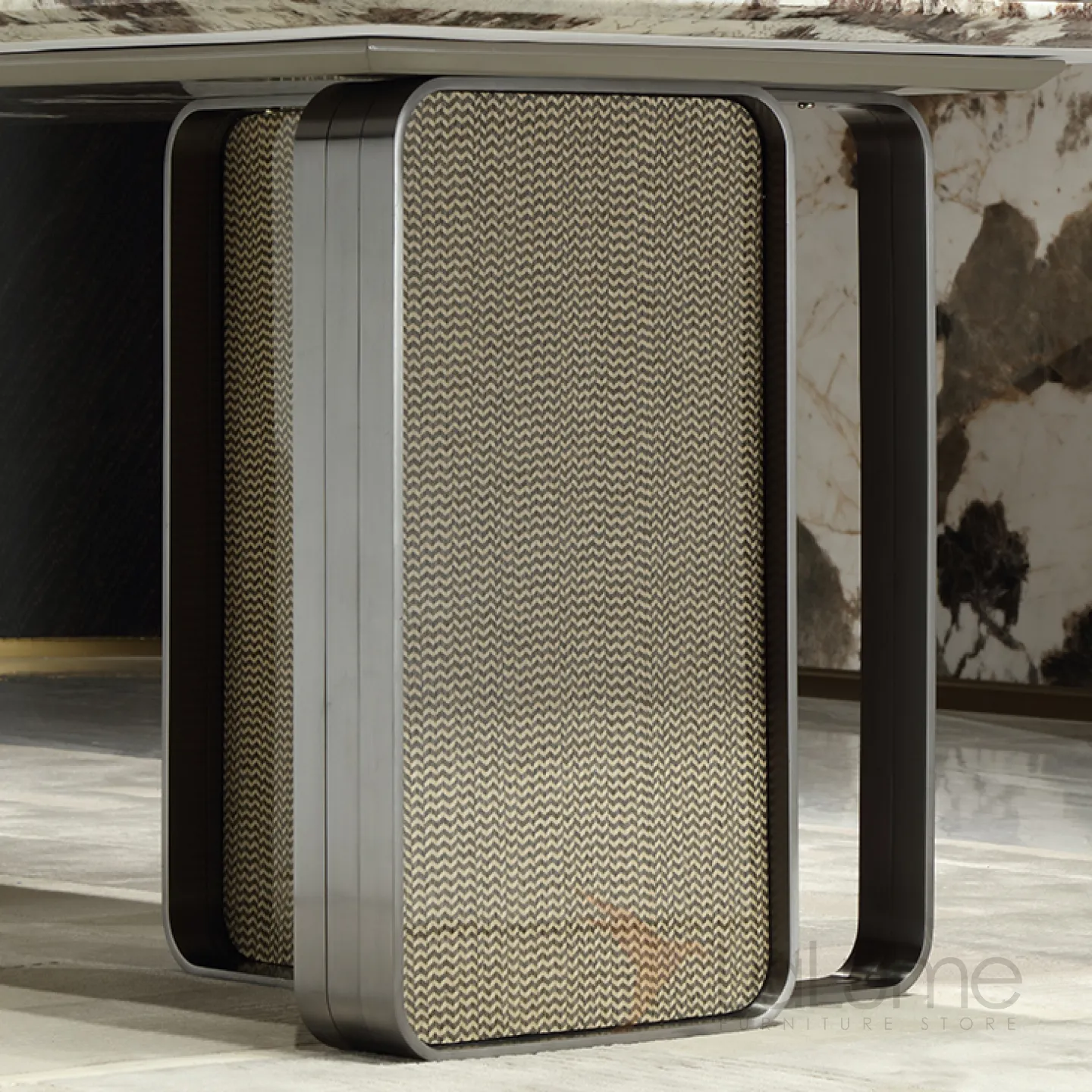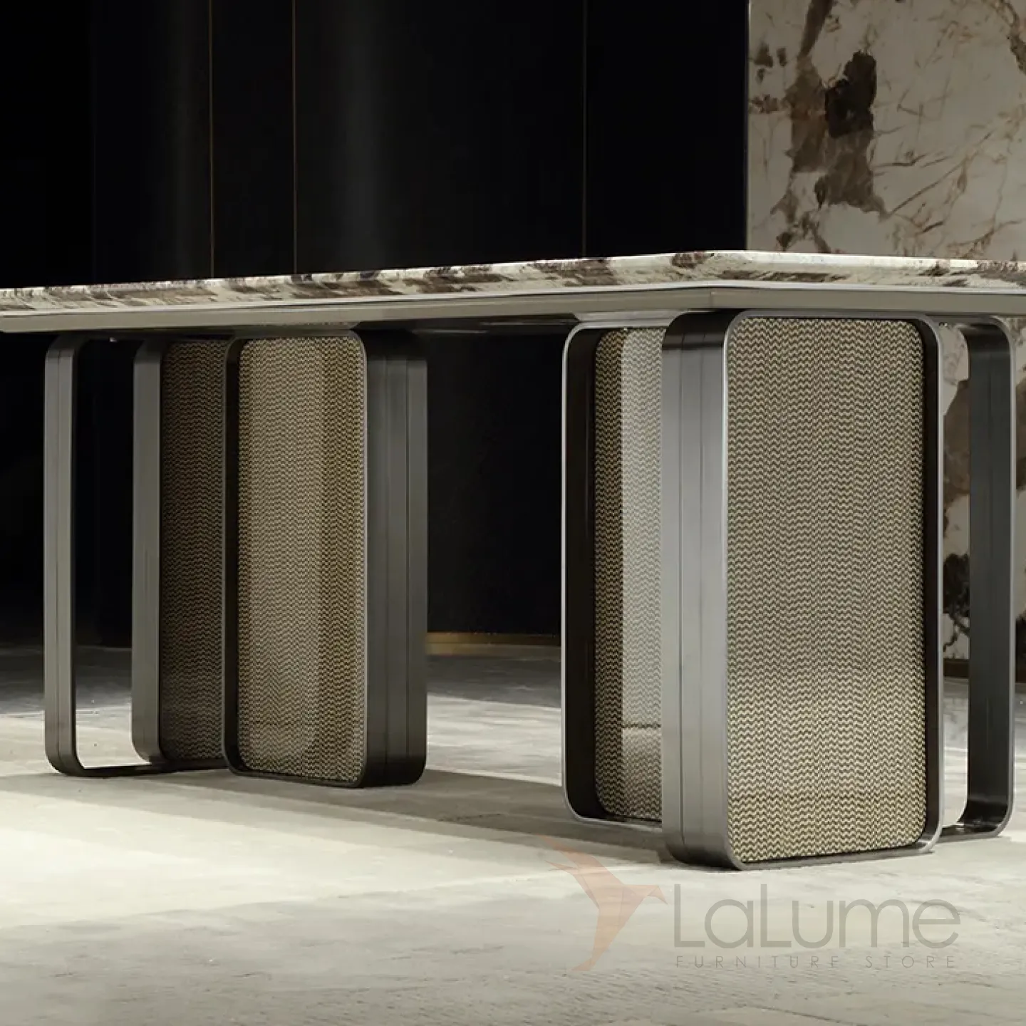 Этот большой обеденный стол имеет уникальную столешницу из пакистанского мрамора коричневого оттенка. Графичное основание из нержавеющей стали и красное дерево со шпоном придают столу изысканность и элегантность. За таким столом могут разместиться до восьми человек.