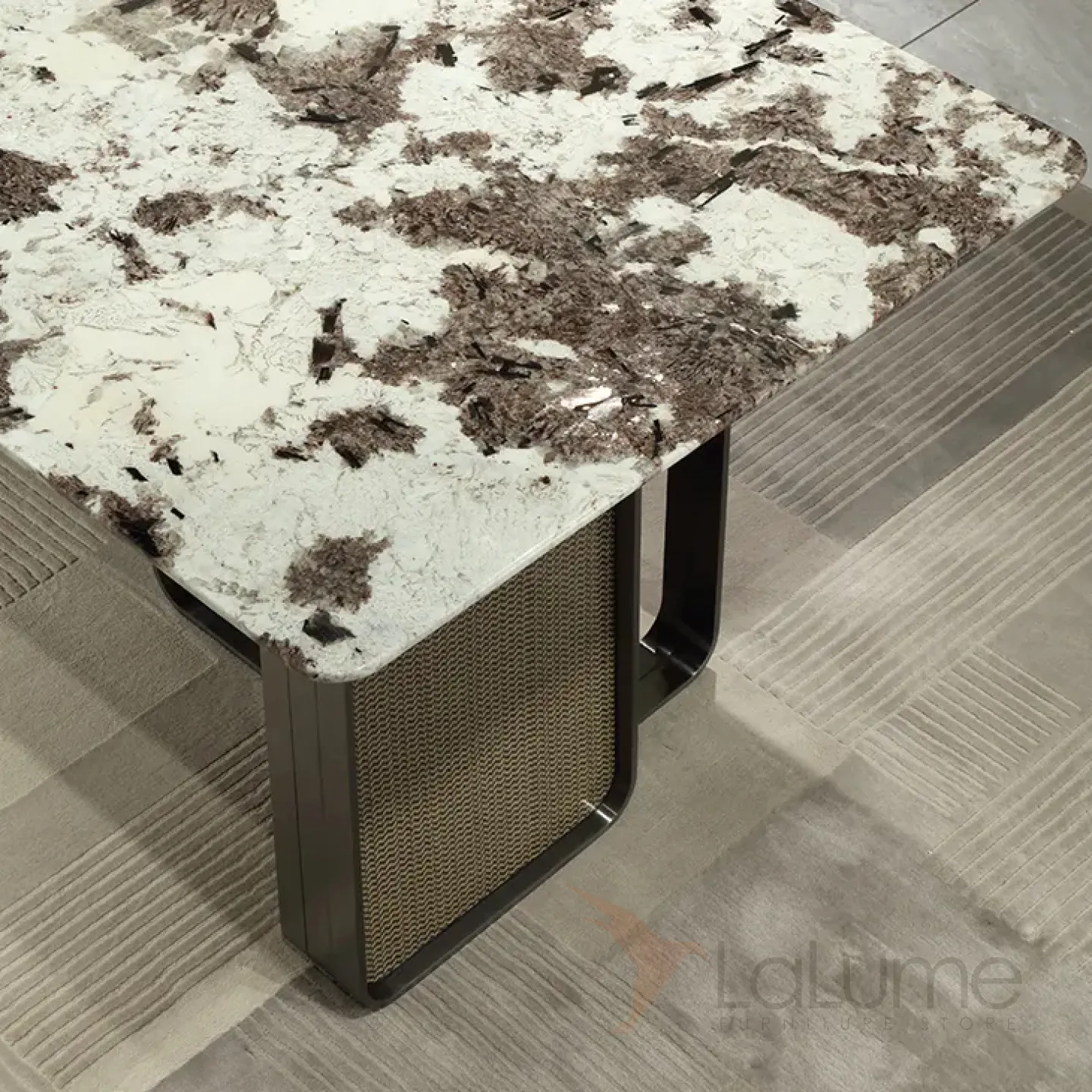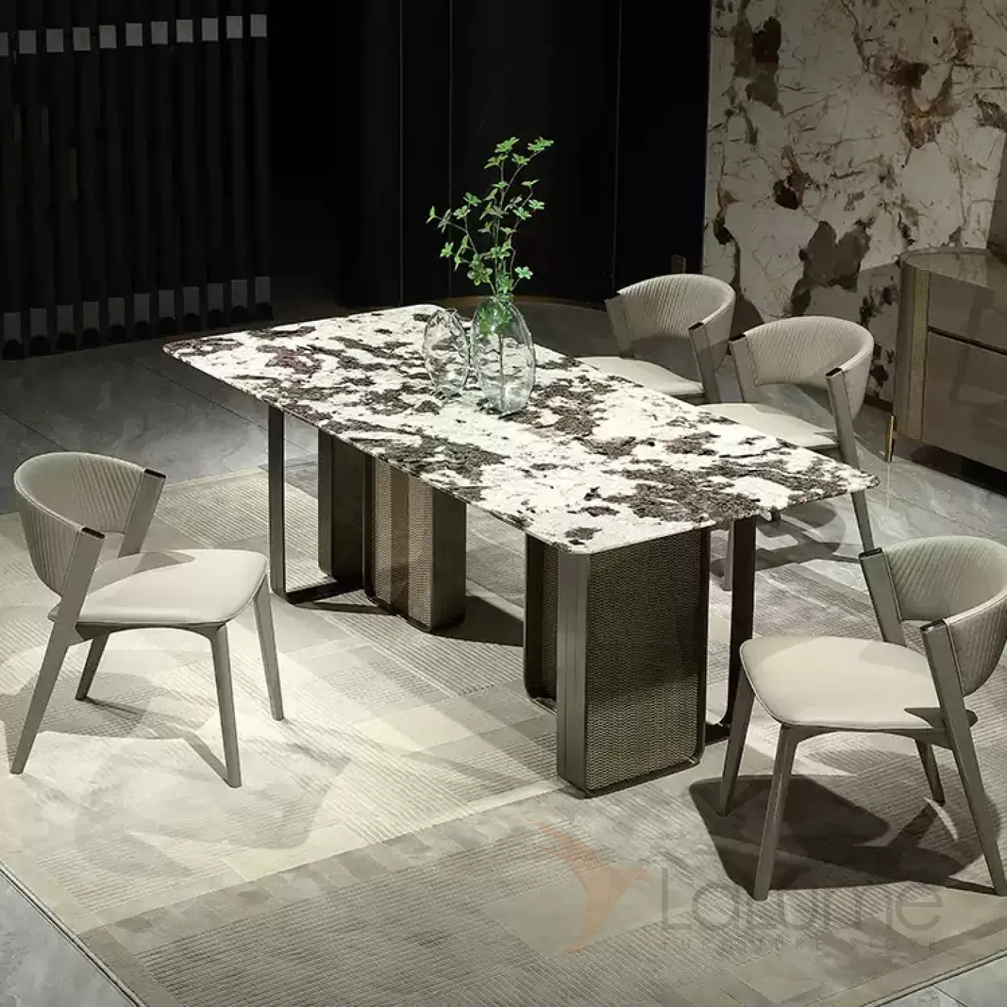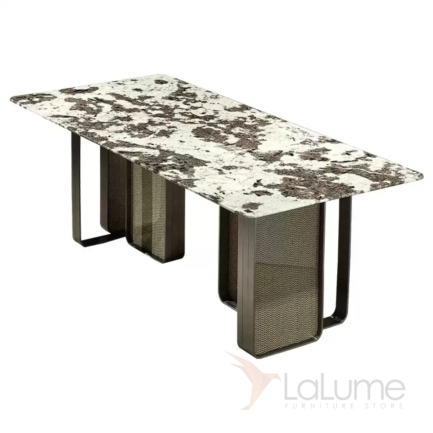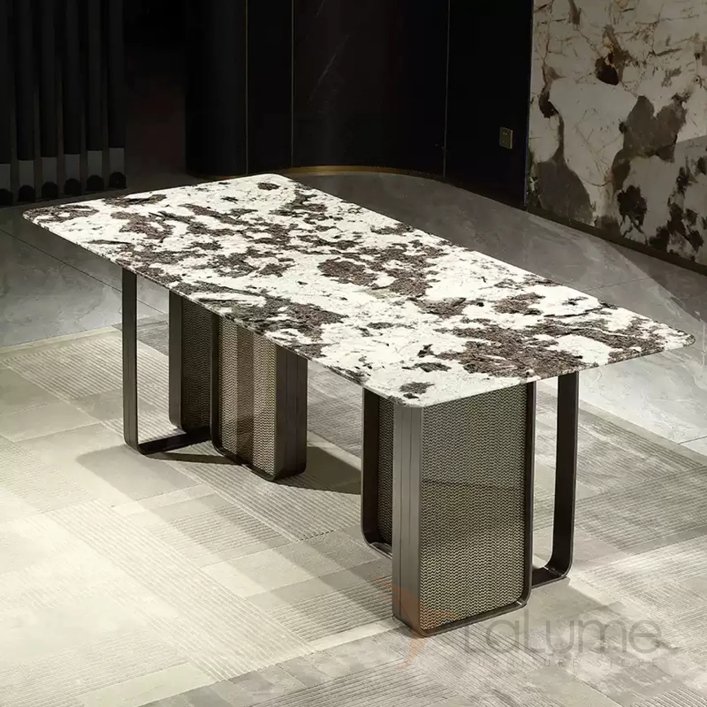 Этот большой обеденный стол имеет уникальную столешницу из пакистанского мрамора коричневого оттенка. Графичное основание из нержавеющей стали и красное дерево со шпоном придают столу изысканность и элегантность. За таким столом могут разместиться до восьми человек.