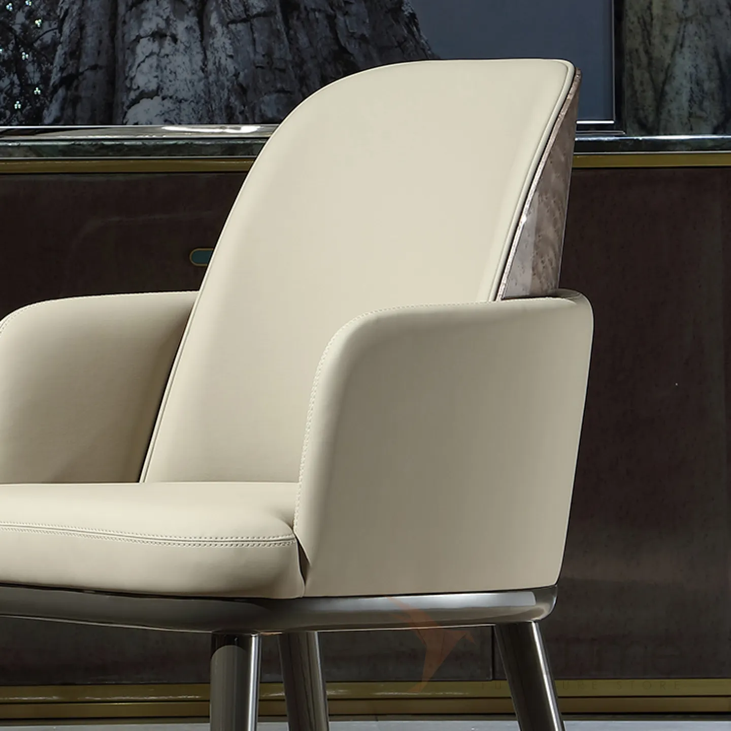 Обеденный стул станет настоящим украшением вашего интерьера и великолепным дополнением к обеденному столу. Его удобная спинка и сиденье подарят комфорт во время приема пищи. Выполненный из натуральной кожи и красного дерева, он обладает особой роскошью и элегантностью.