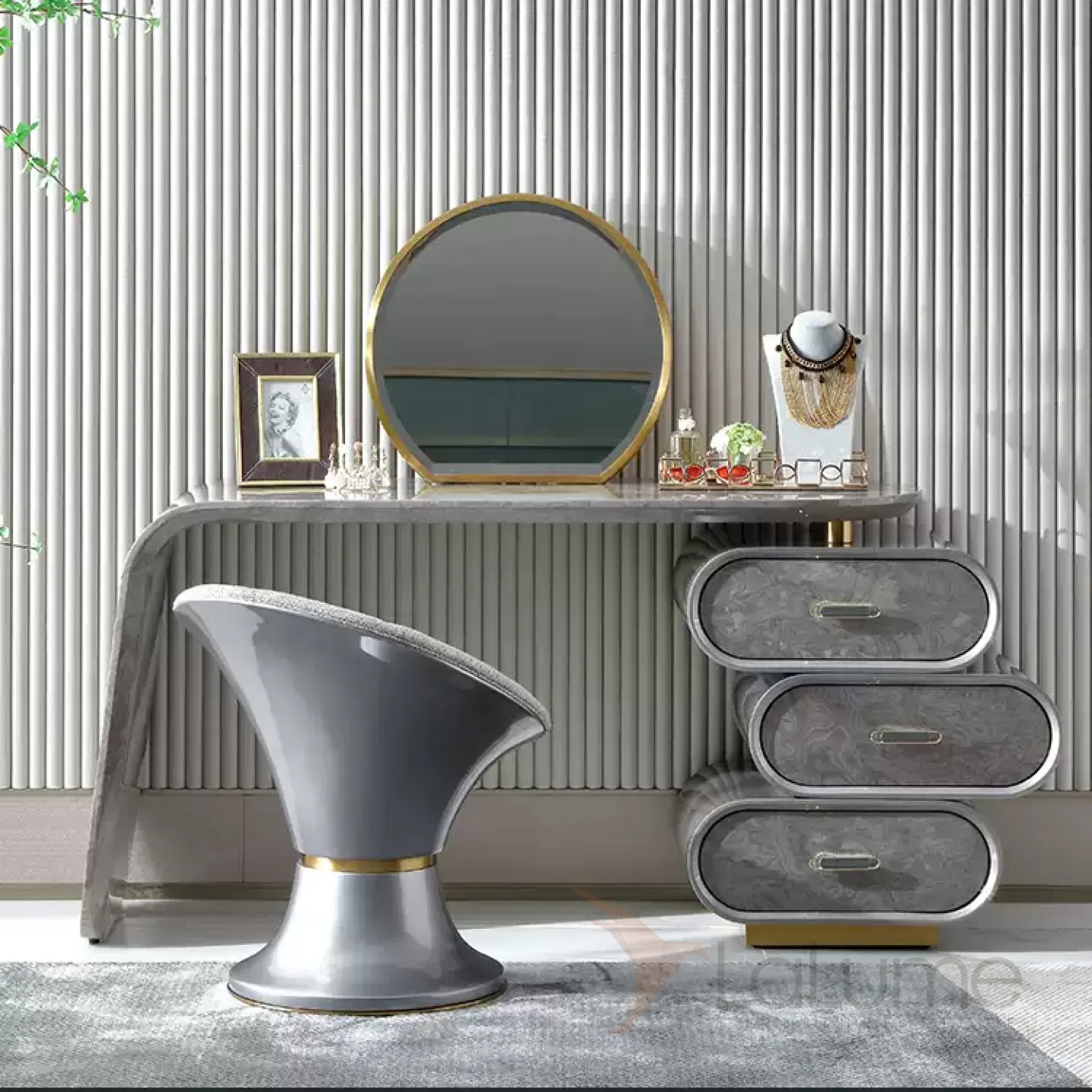 Роскошный табурет с отделкой серебряным шпоном и мягкой кожей создан для истинных ценителей красоты и комфорта. Идеально гармонирует с туалетным столиком, добавляя интерьеру утончённости