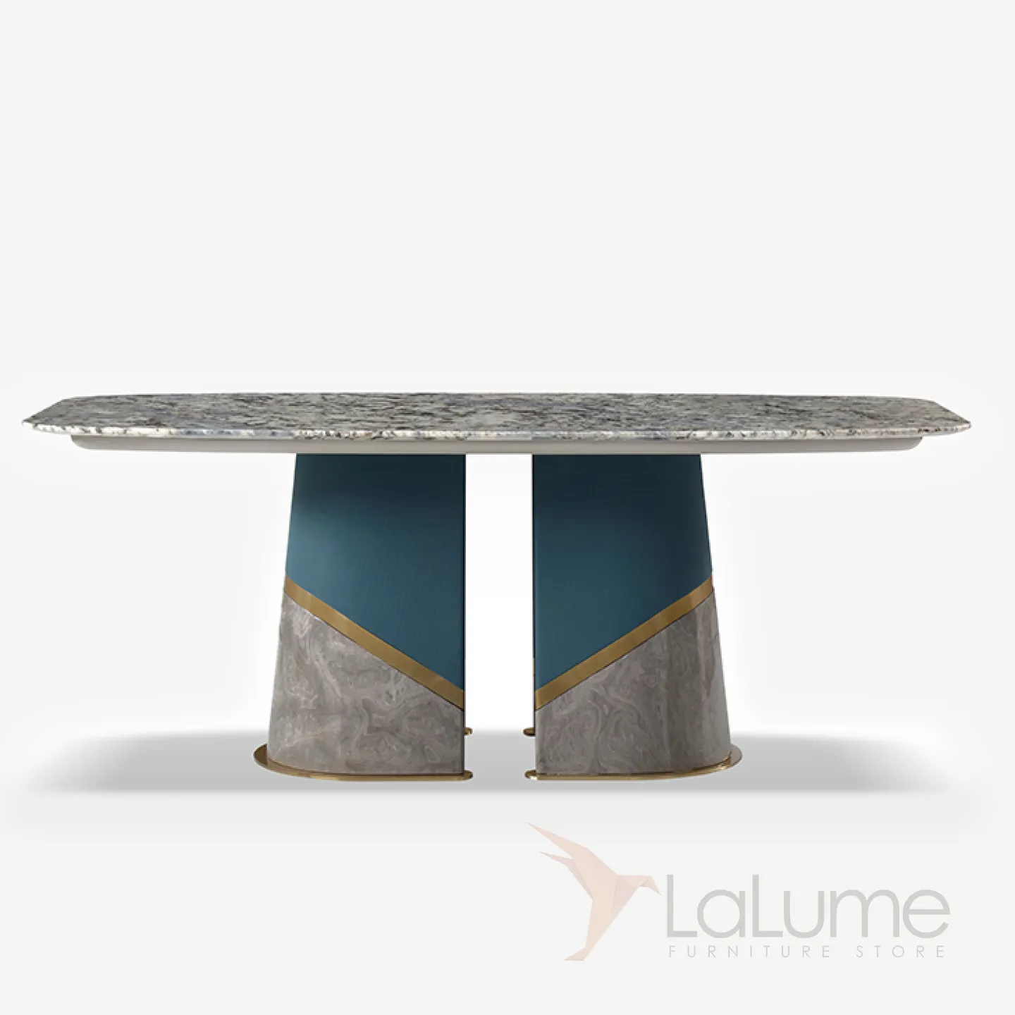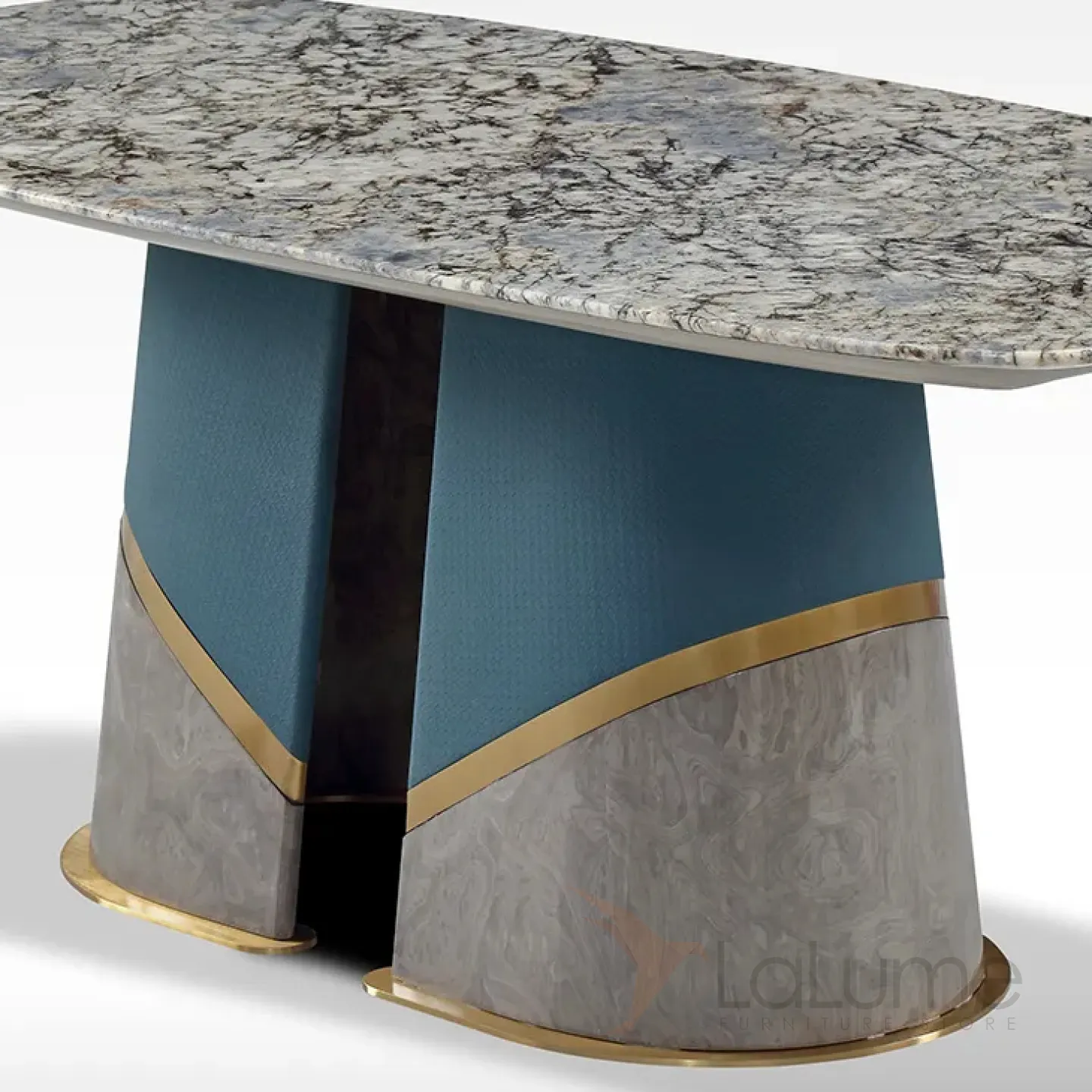 Элитный стол на 8 персон с изысканной столешницей из серого мрамора. Дизайнерское основание сочетает позолоченную сталь и шпонированное дерево, придавая интерьеру особый шик и респектабельность.