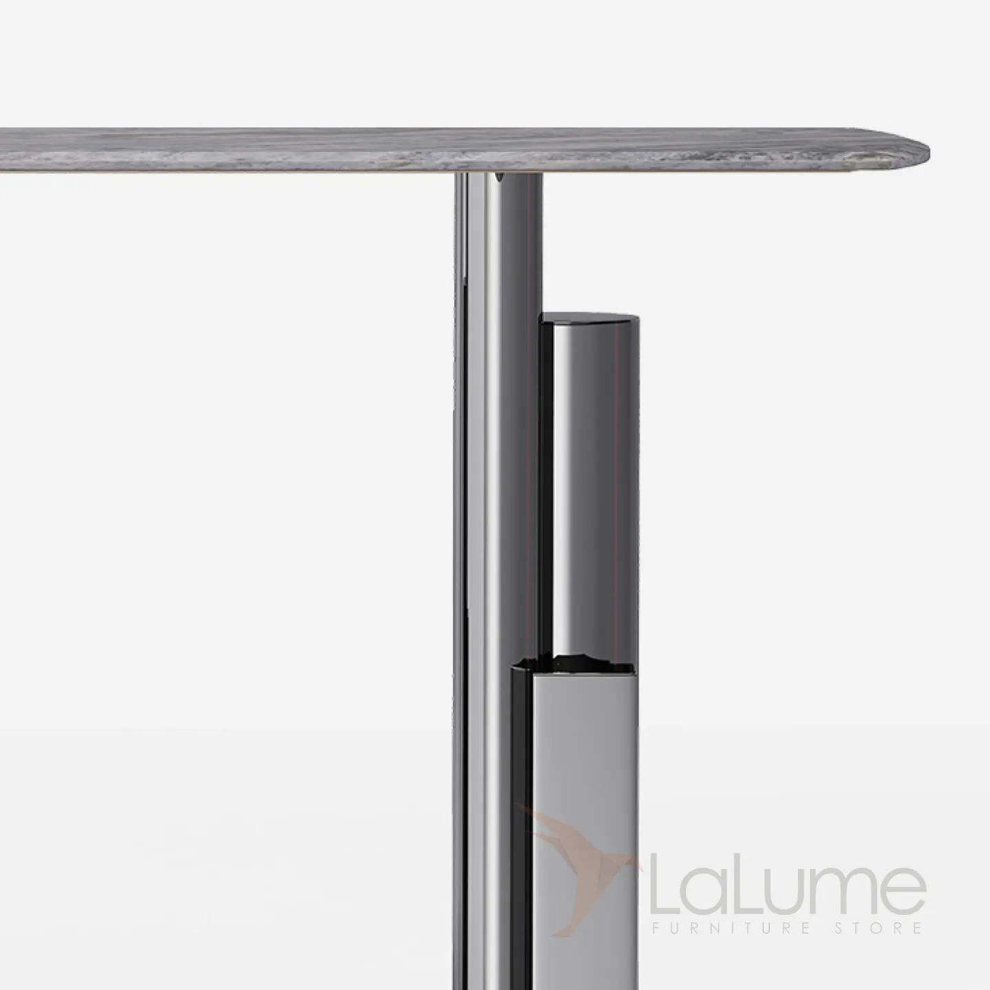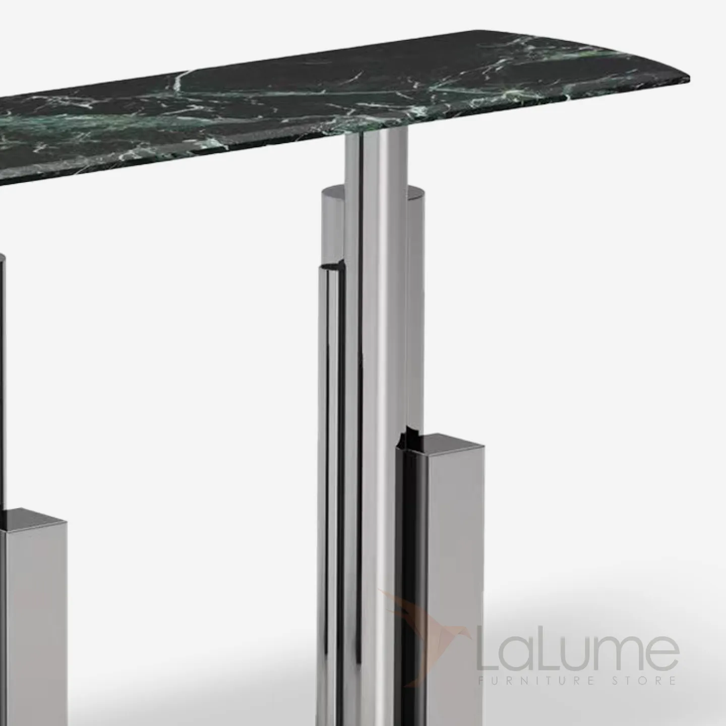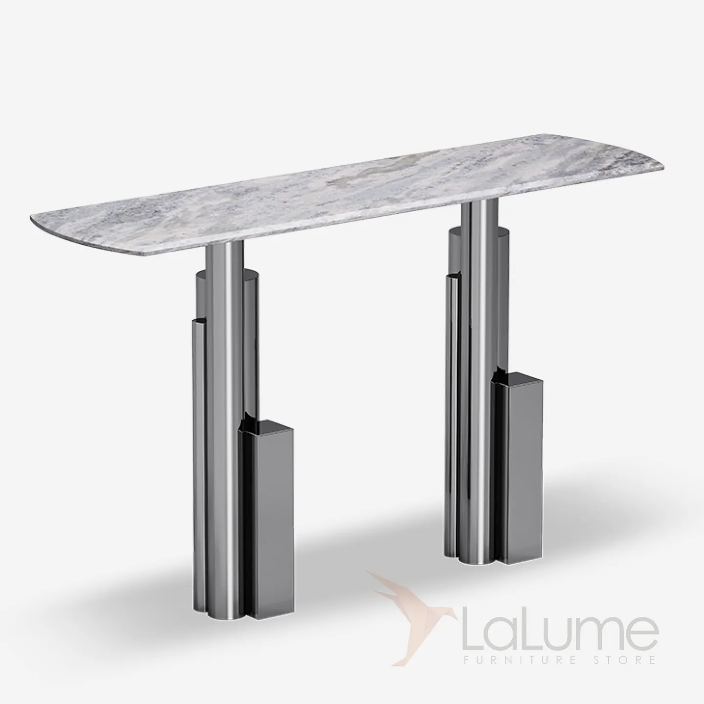 Пристенный столик из нержавеющей стали с мраморной столешницей. Оригинальное подстолье придаст интерьеру выразительность.