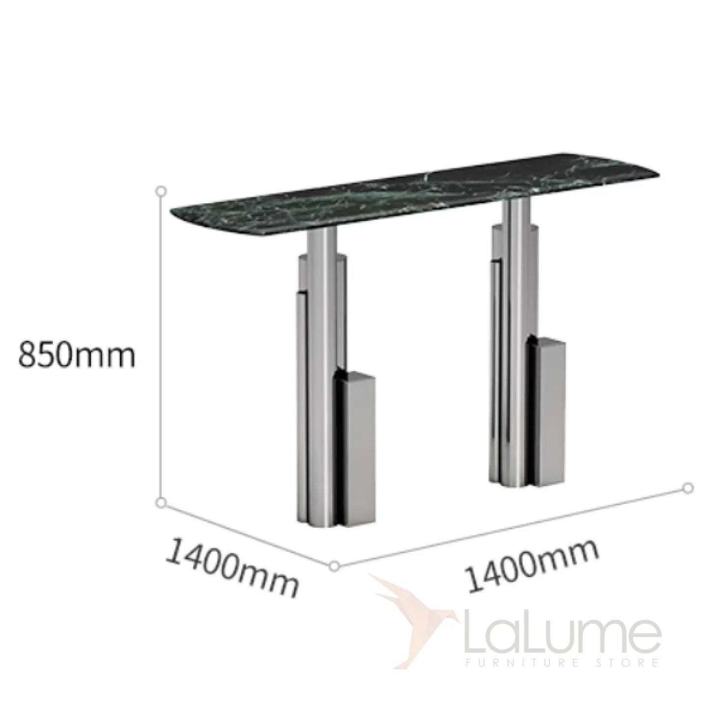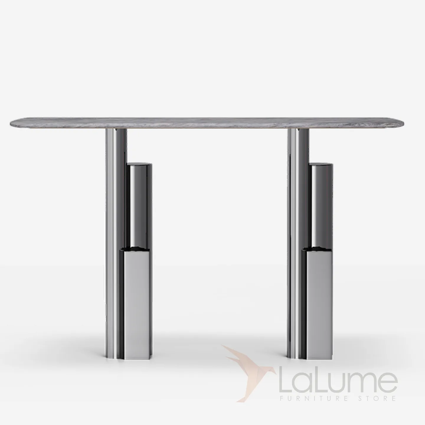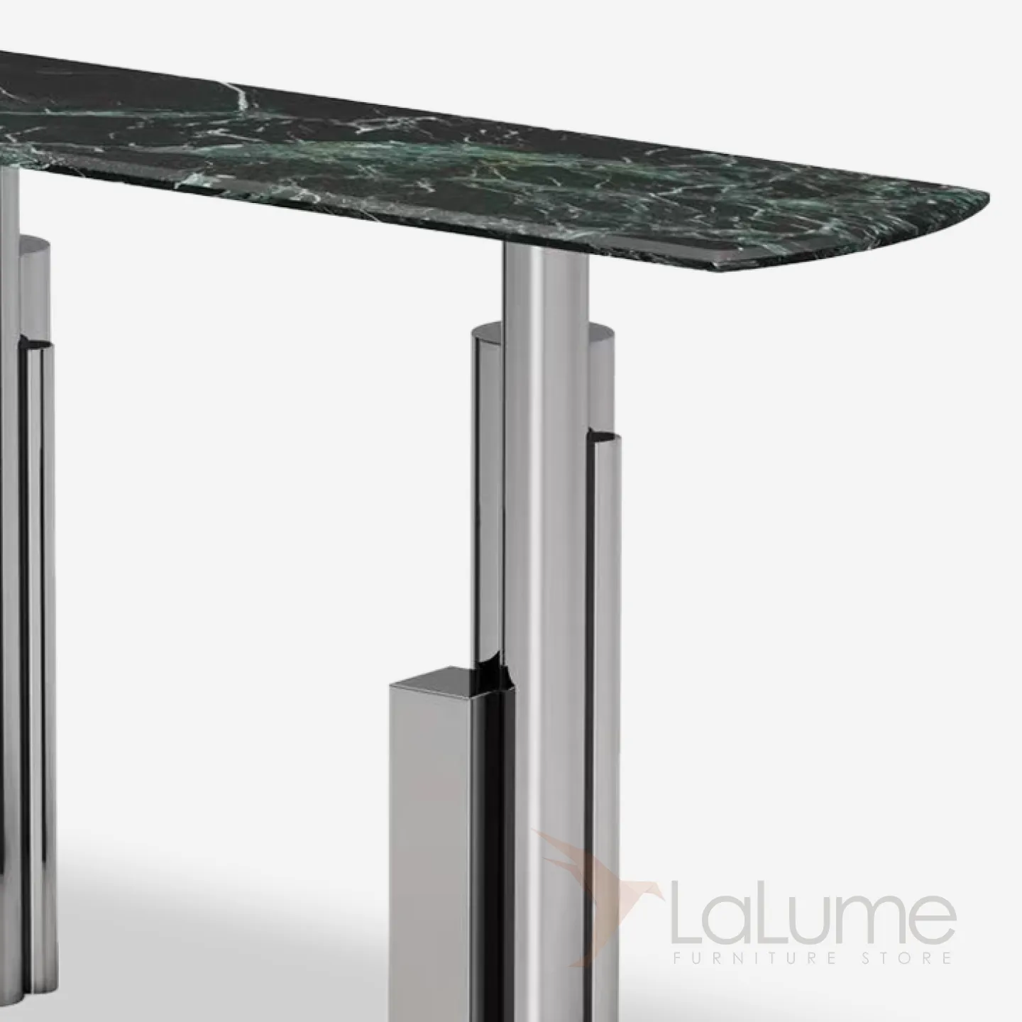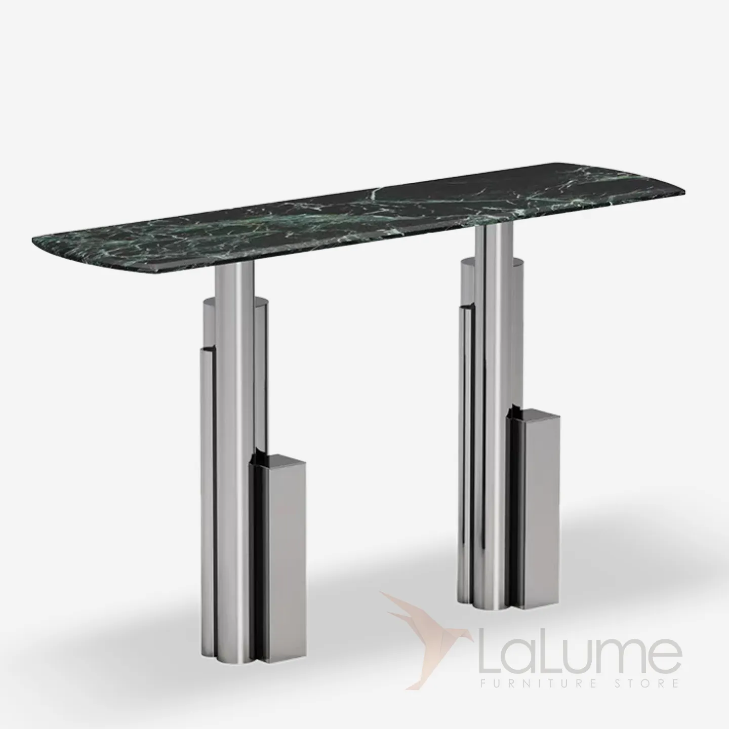 Пристенный столик из нержавеющей стали с мраморной столешницей. Оригинальное подстолье придаст интерьеру выразительность.