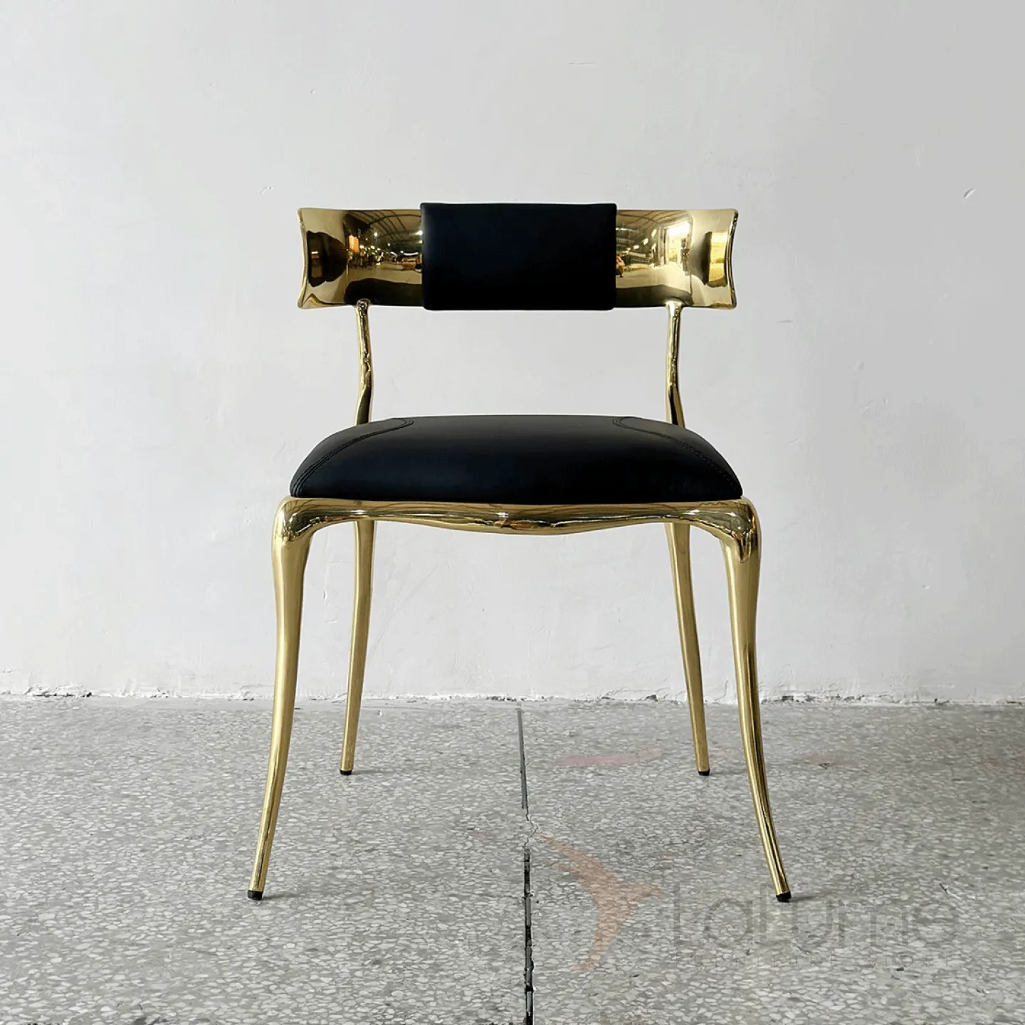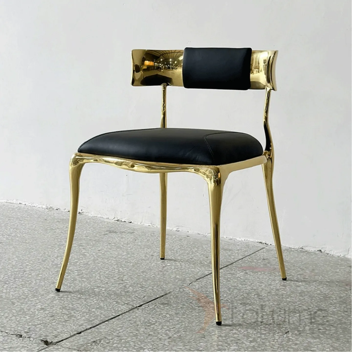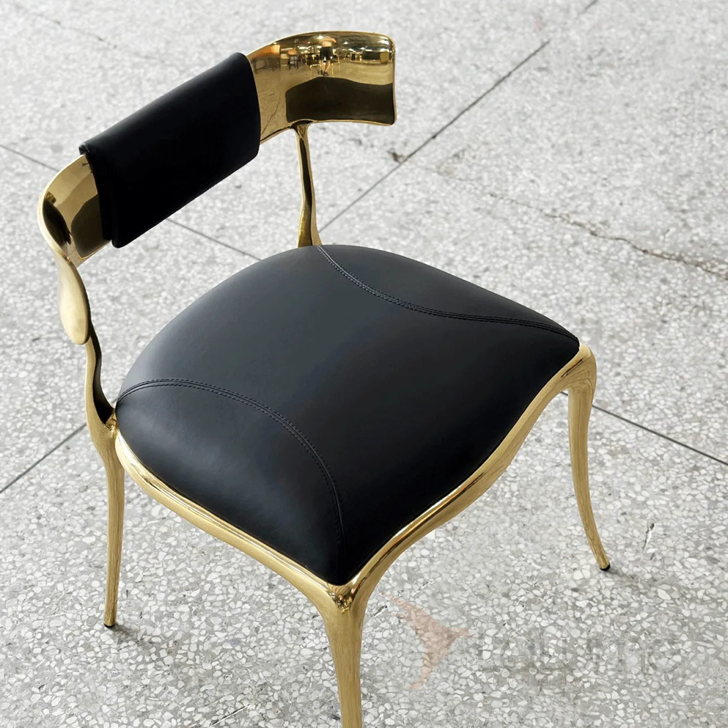 Латунный стул с изящной низкой спинкой, где мягкое сиденье сочетает упругий поролон и благородную кожаную обивку.