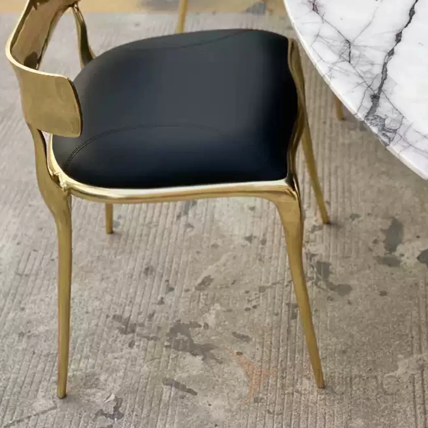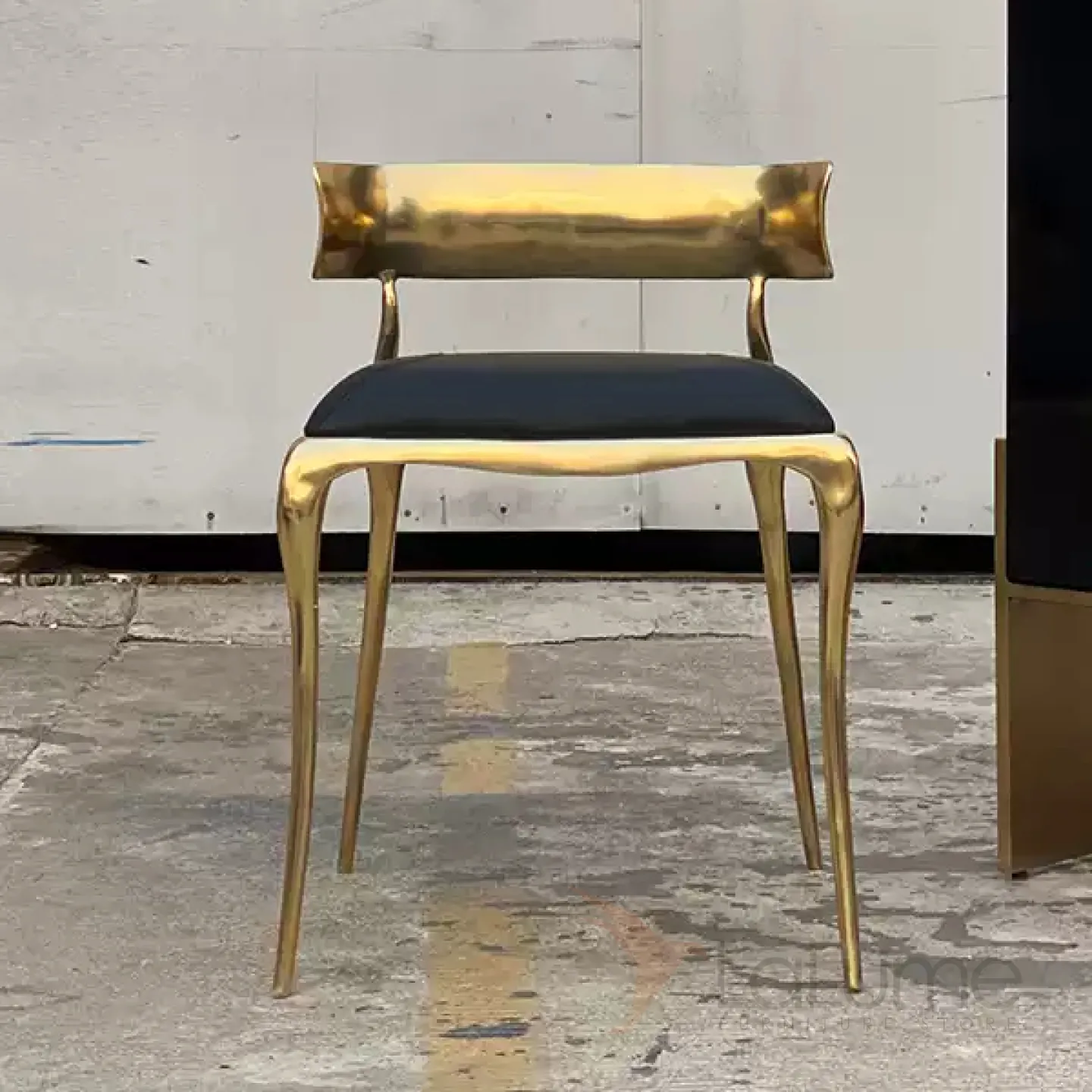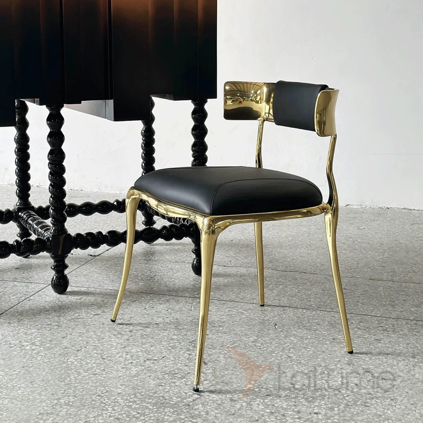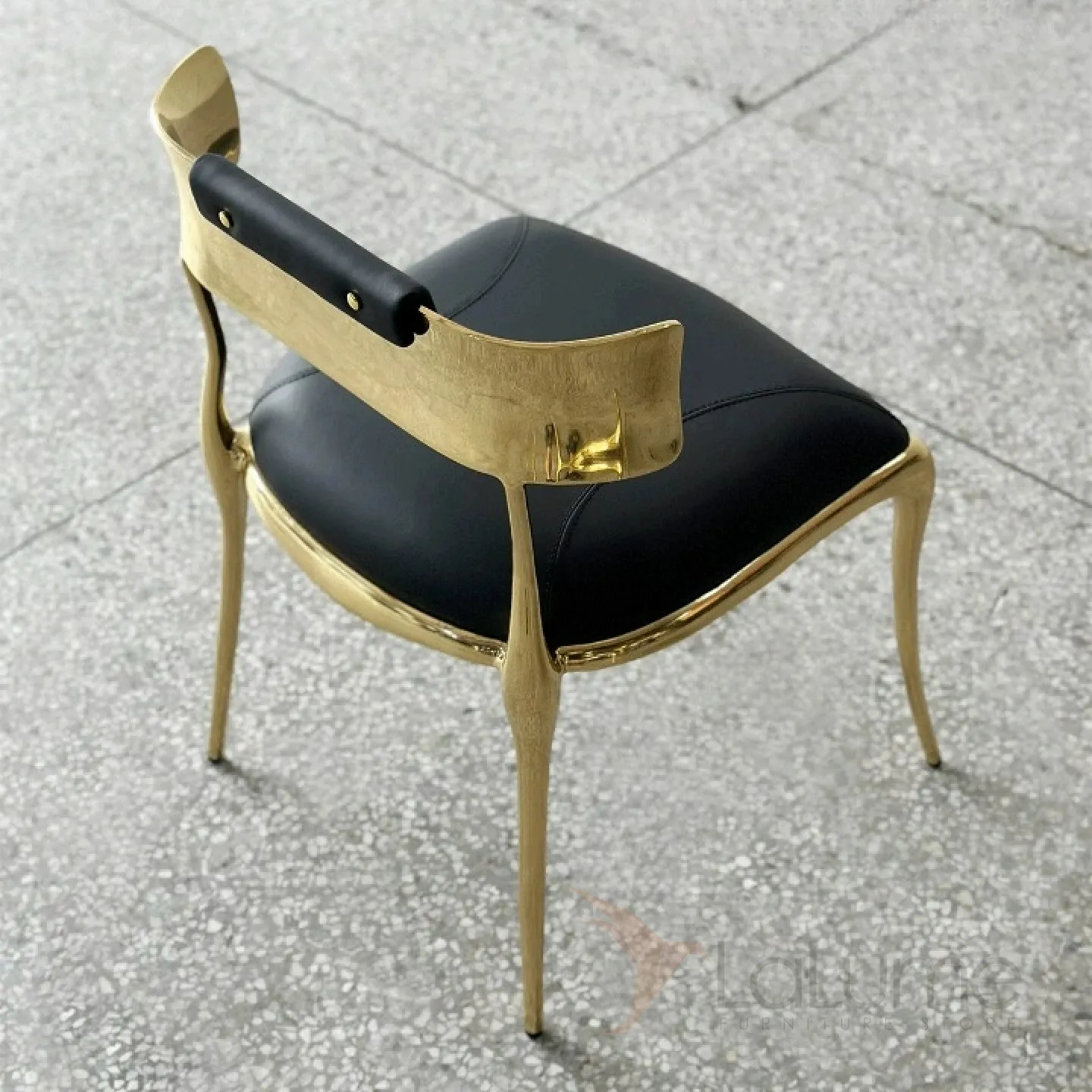 Латунный стул с изящной низкой спинкой, где мягкое сиденье сочетает упругий поролон и благородную кожаную обивку.