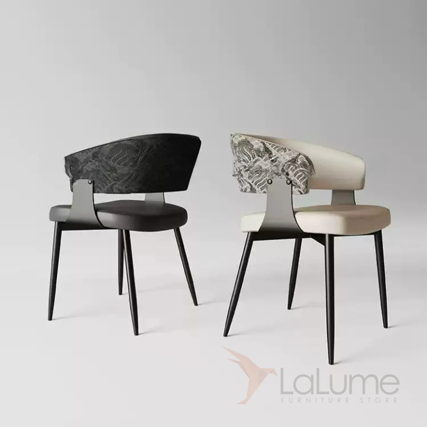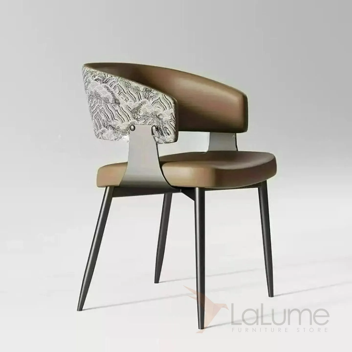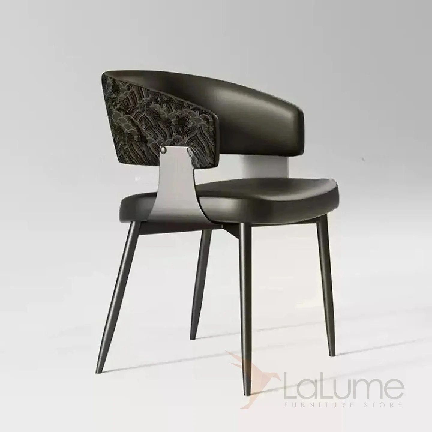 Изящный обеденный стул с металлическим основанием и элегантной спинкой. Обивка из микрофибры и кожи в разных цветах.