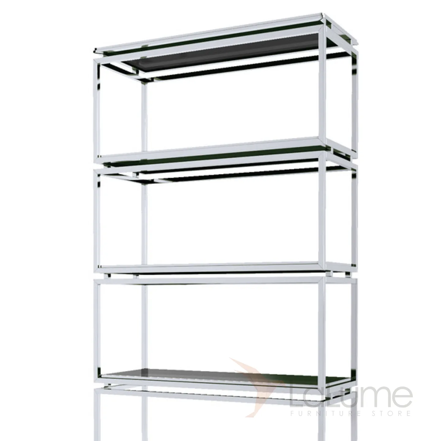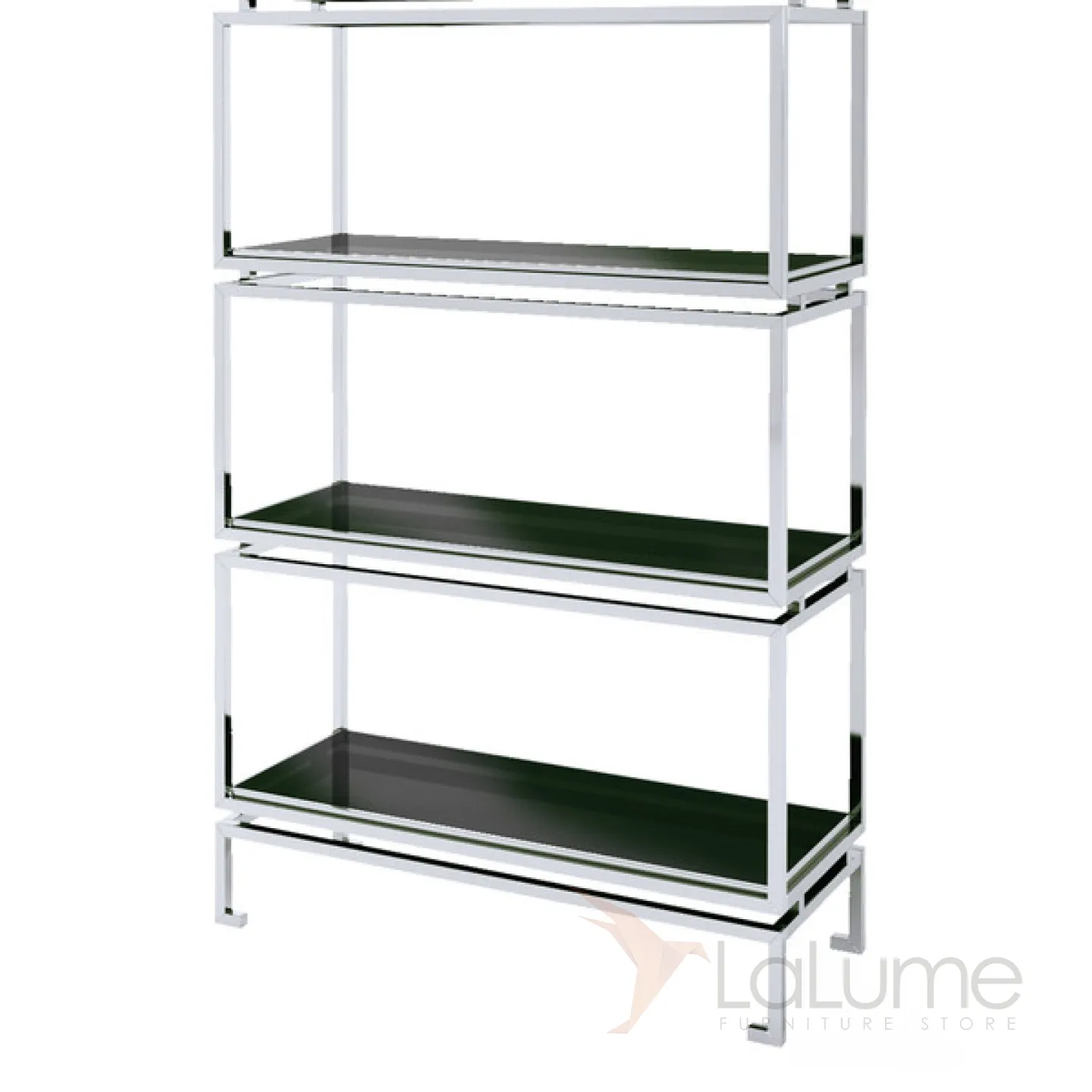 Стеллаж из хромированного металла. Полки из стекла черного цвета.