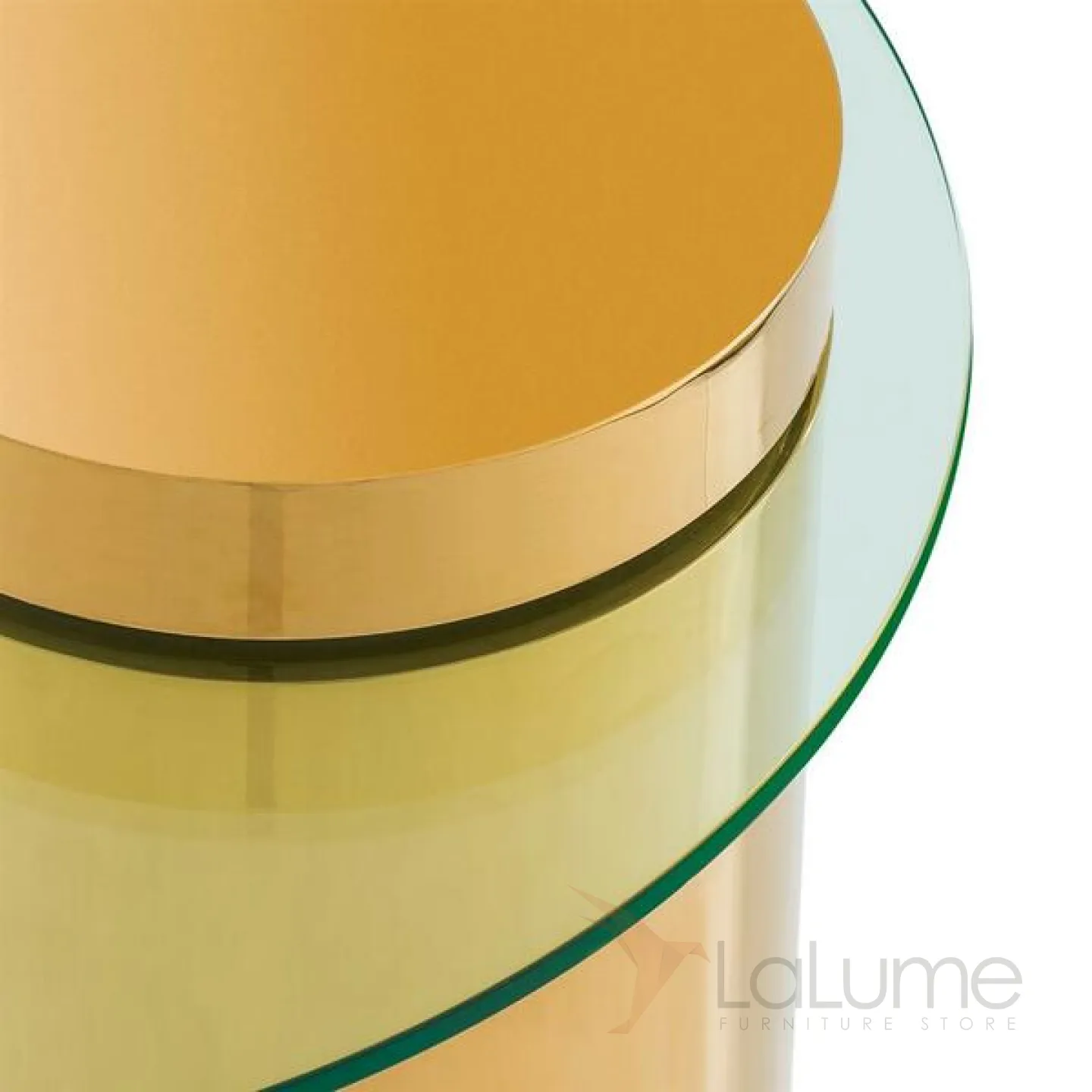Оригинальный столик с круглой столешницей из прозрачного стекла. Массивная ножка из металла золотого цвета.