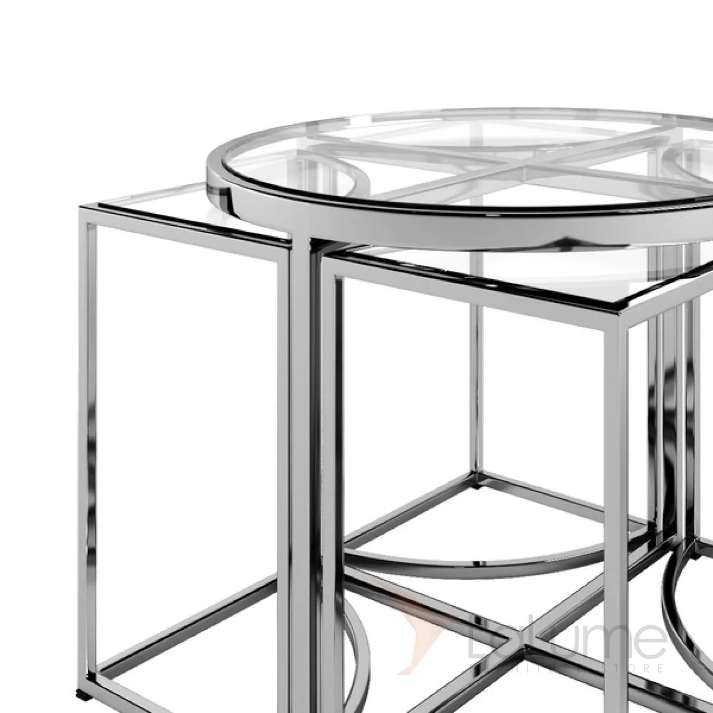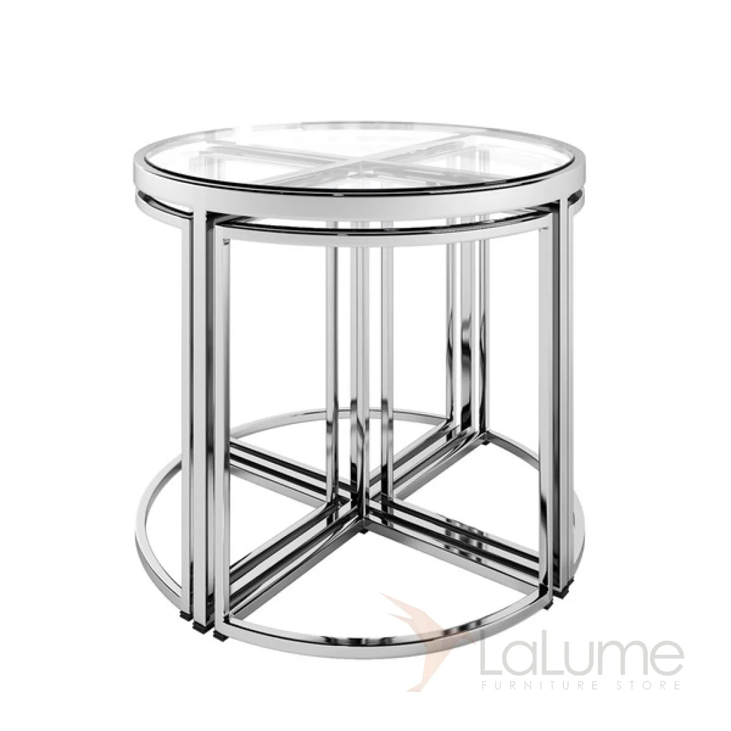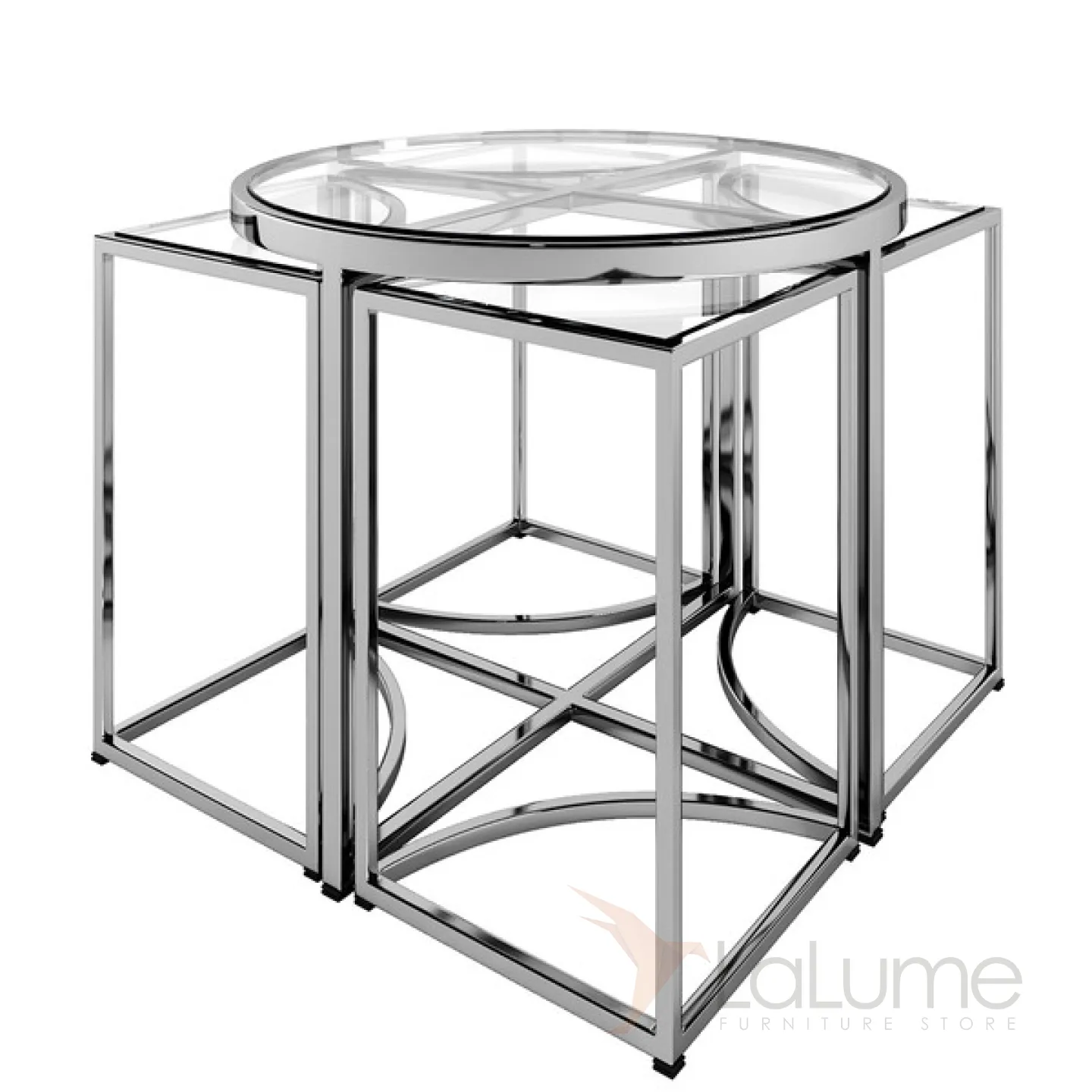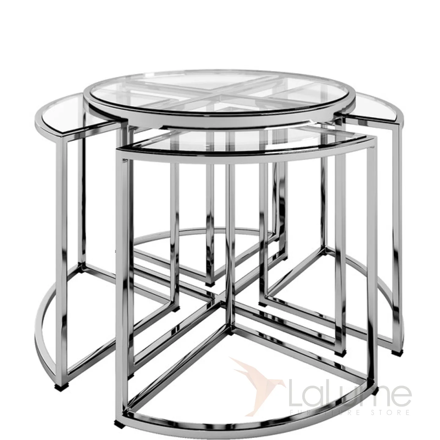 Комплект из пяти столиков: один круглый и четыре сегмента круга. Каркас из хромированного металла, столешницы и прозрачного стекла.