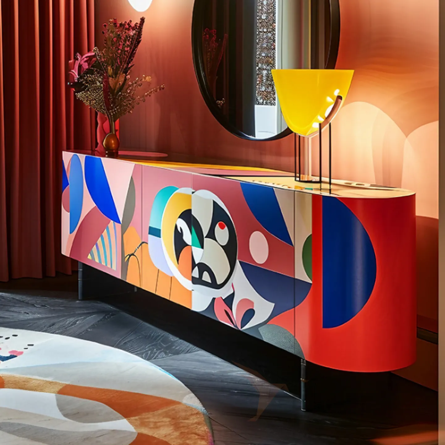 Дизайнерский сервант будет ярким акцентом в вашем интерьере. Изготовленный из дерева, он украшен ручной художественной росписью. Три отделения с дверцами позволят вам удобно организовать пространство и разместить различные предметы.