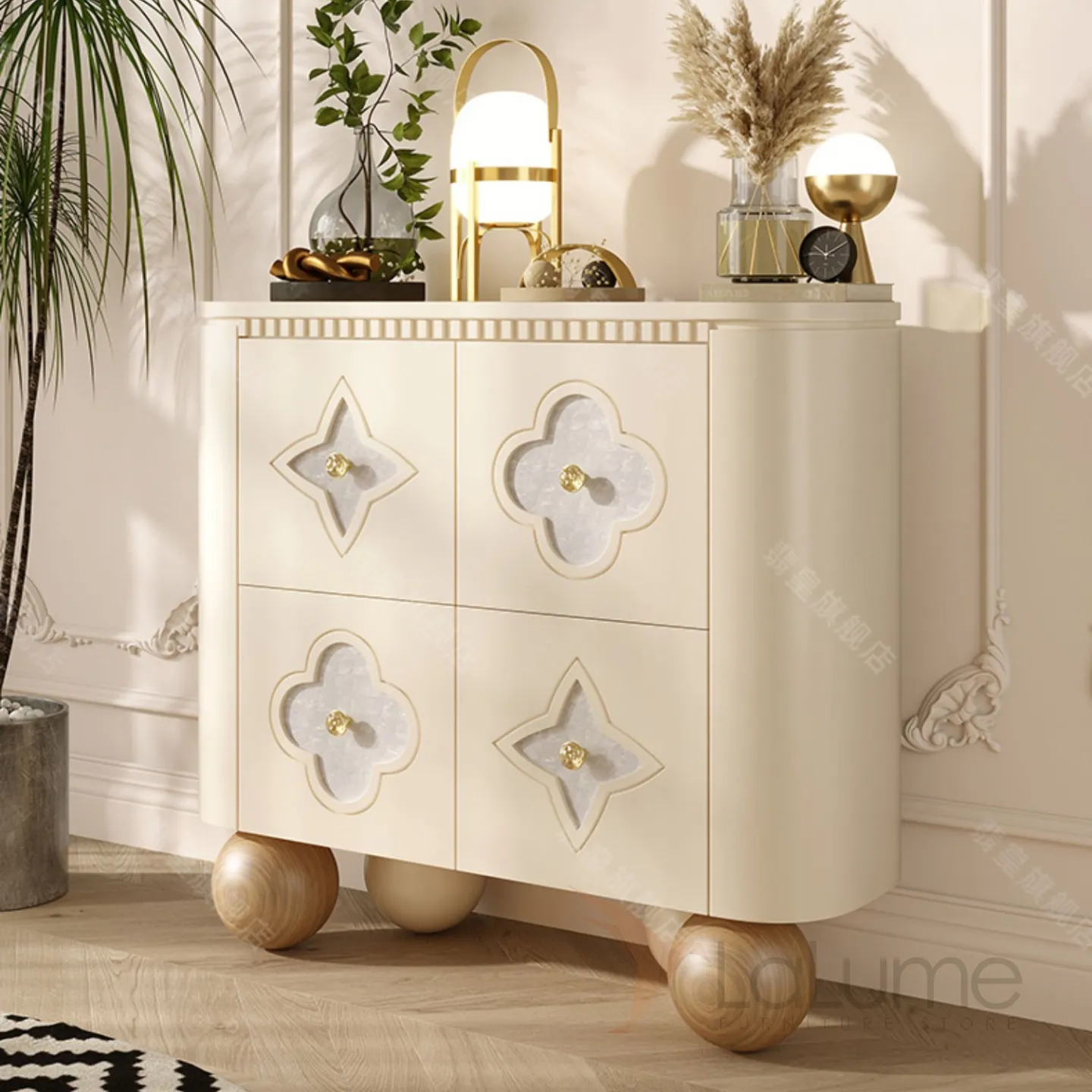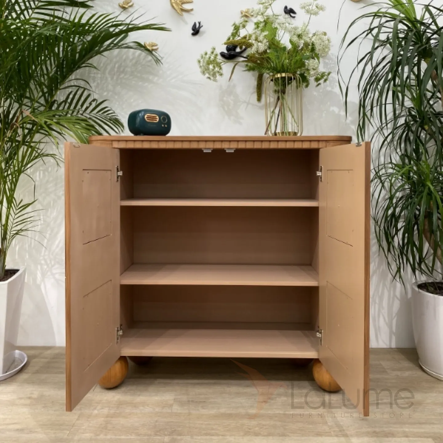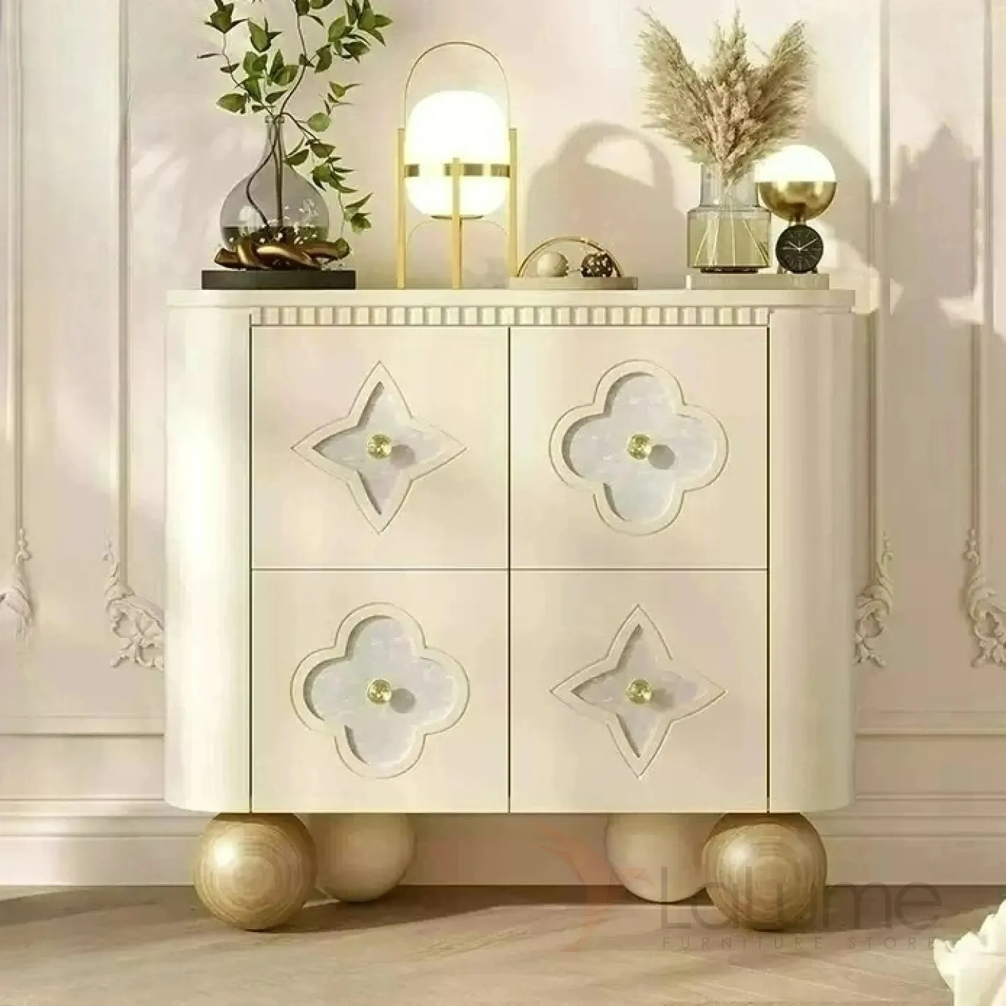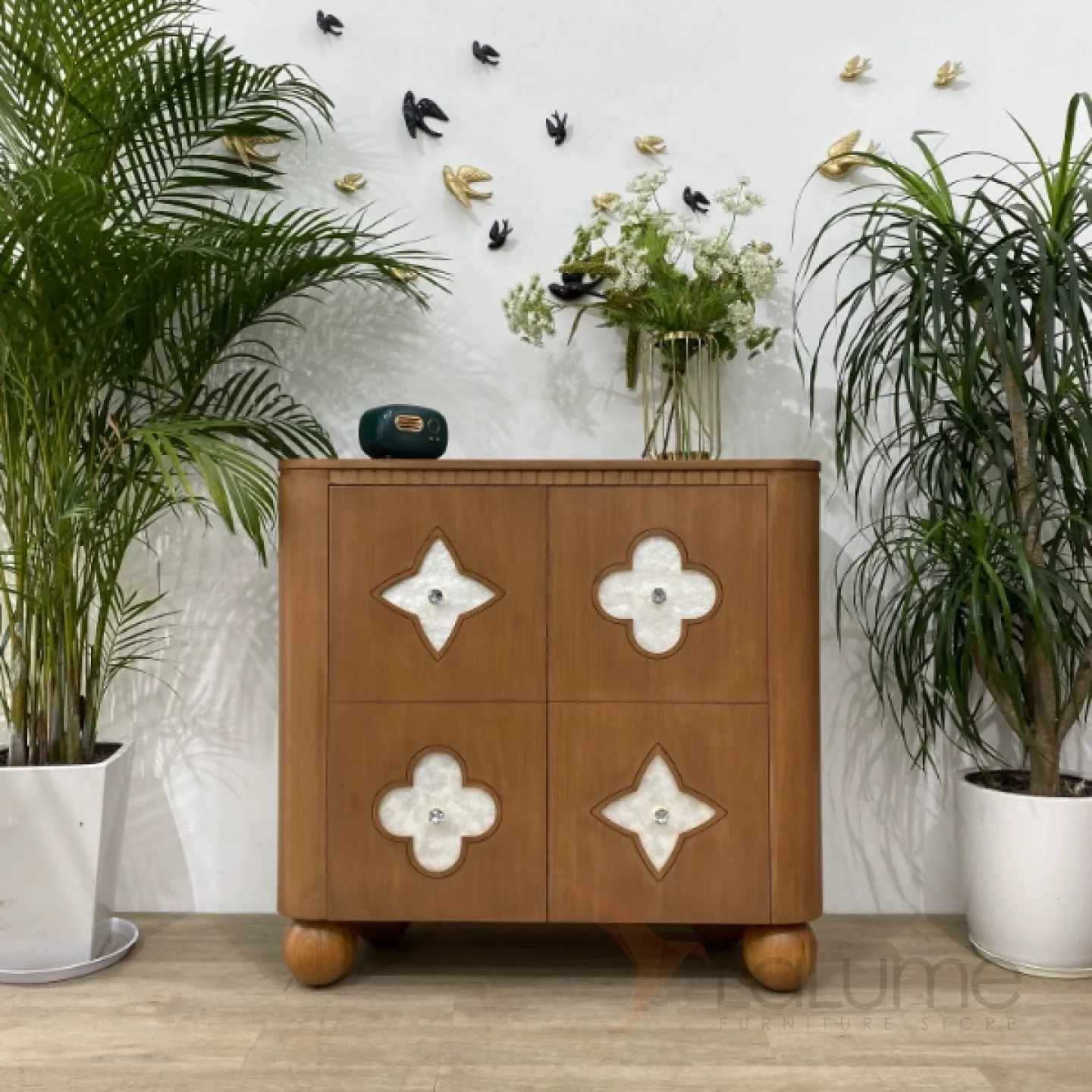 Элегантный сервант из качественной древесины на изящных круглых ножках. Дверцы декорированы натуральным перламутром. Внутри достаточно места для хранения, доступ к которому обеспечивают две двери. Доступен в нескольких цветах.