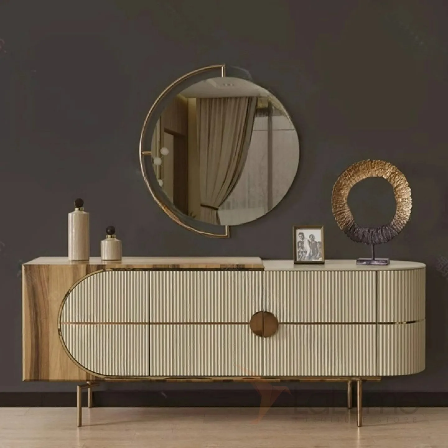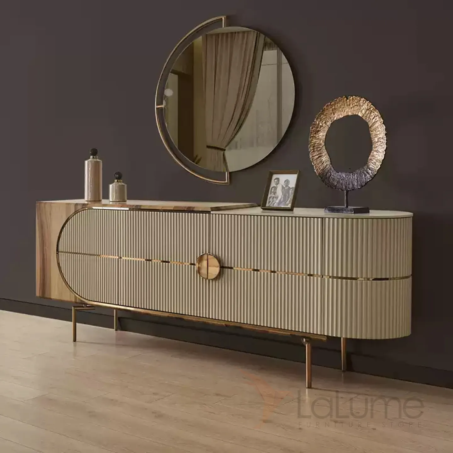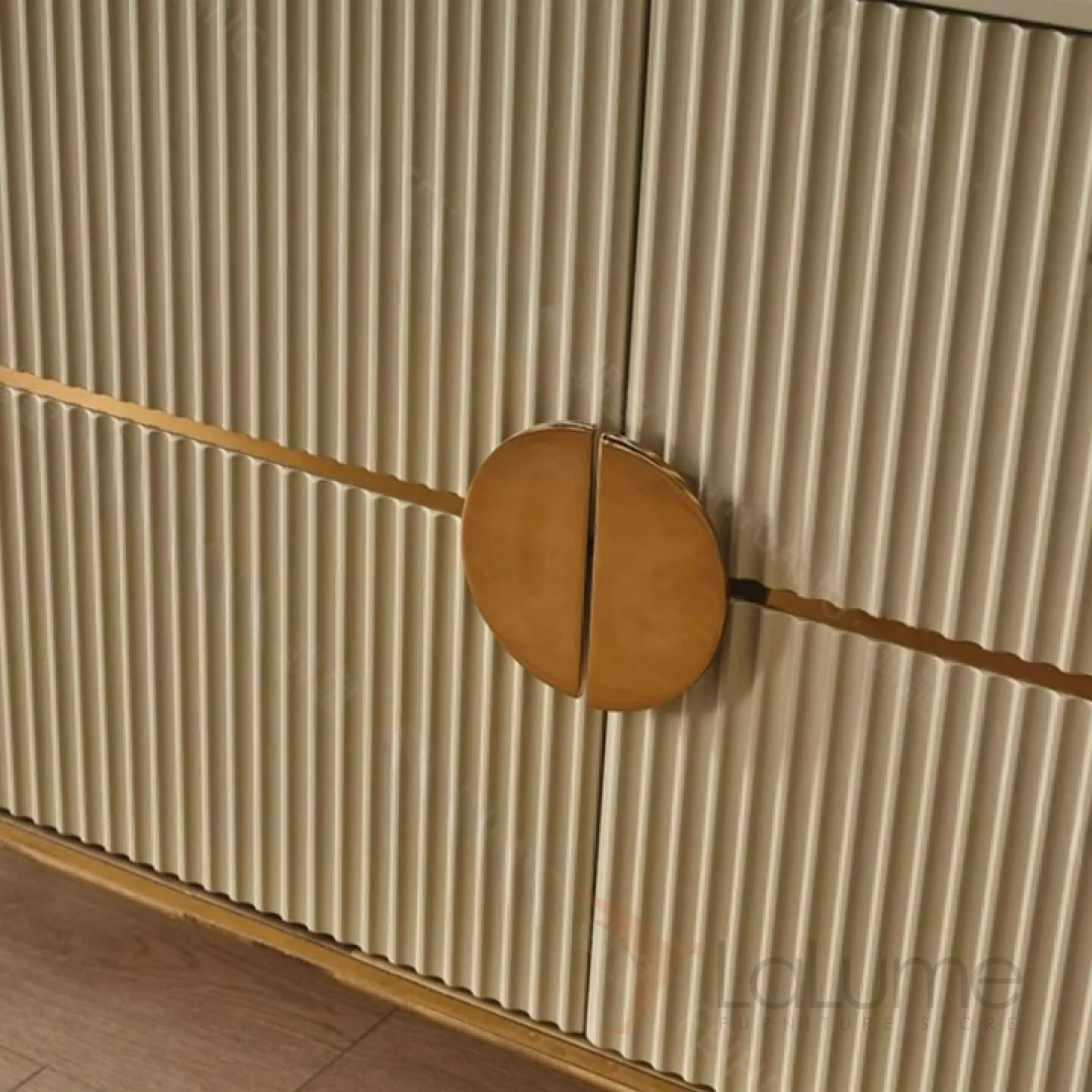 Шкаф из дерева, покрытый текстурированным шпоном, с ножками из нержавеющей стали. Три дверцы позволяют эффективно организовать пространство для хранения.