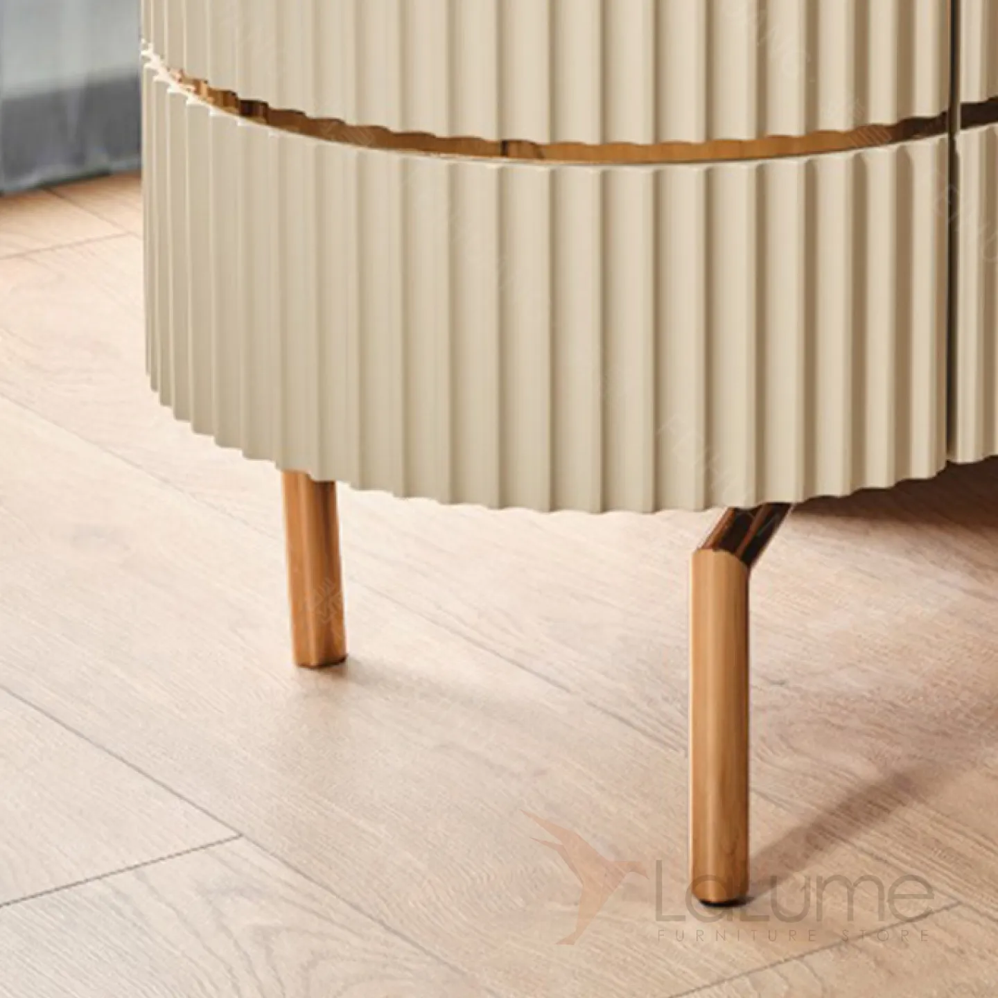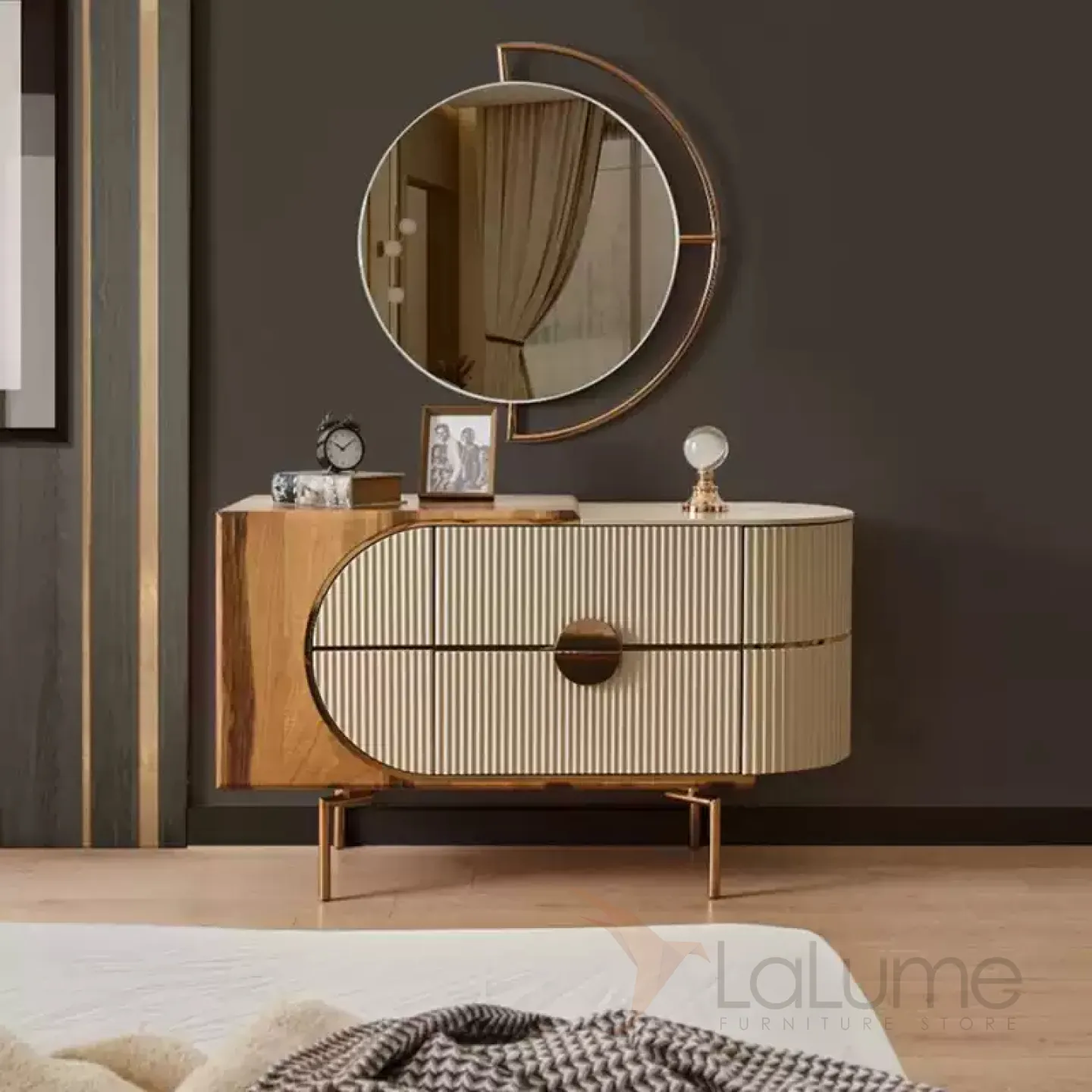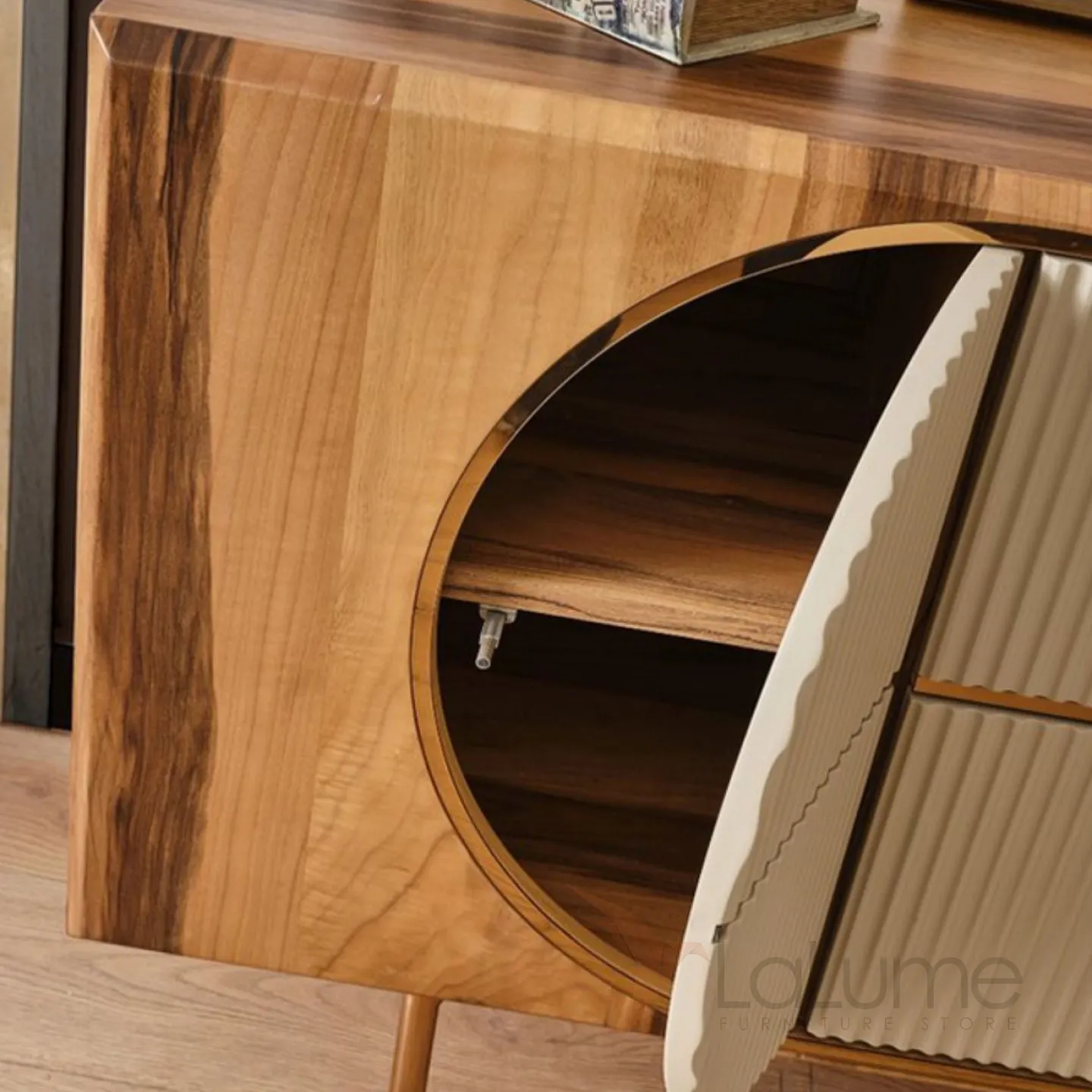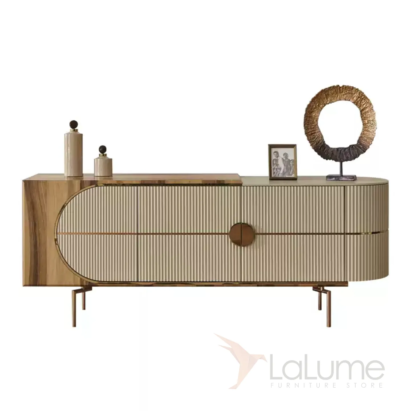 Шкаф из дерева, покрытый текстурированным шпоном, с ножками из нержавеющей стали. Три дверцы позволяют эффективно организовать пространство для хранения.