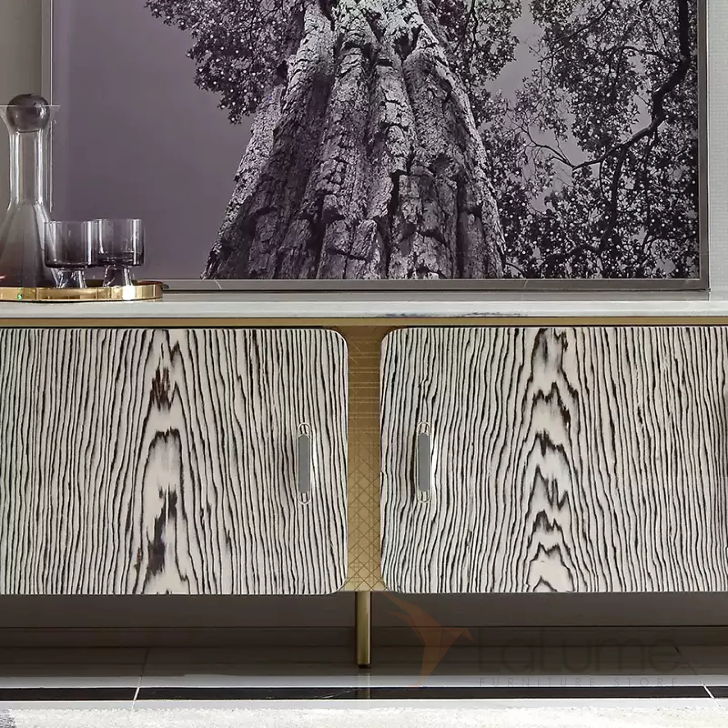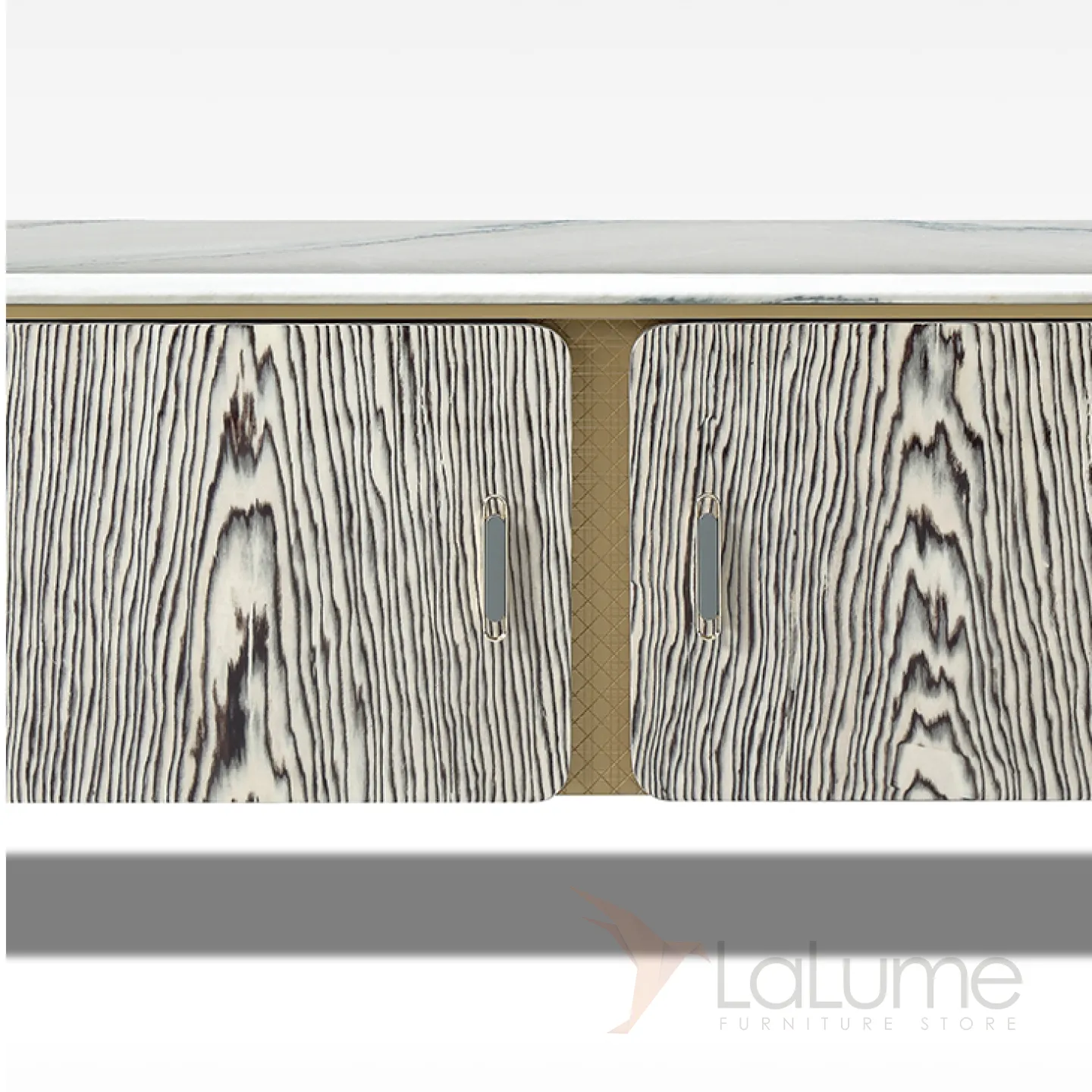Тумба под телевизор отличается элегантным дизайном с золотыми ножками из нержавеющей стали, основанием из дерева и шпона и столешницей из натурального белого мрамора. Четыре распашные дверцы обеспечивают удобное размещение всех необходимых предметов, создавая пространство для хранения и организации.